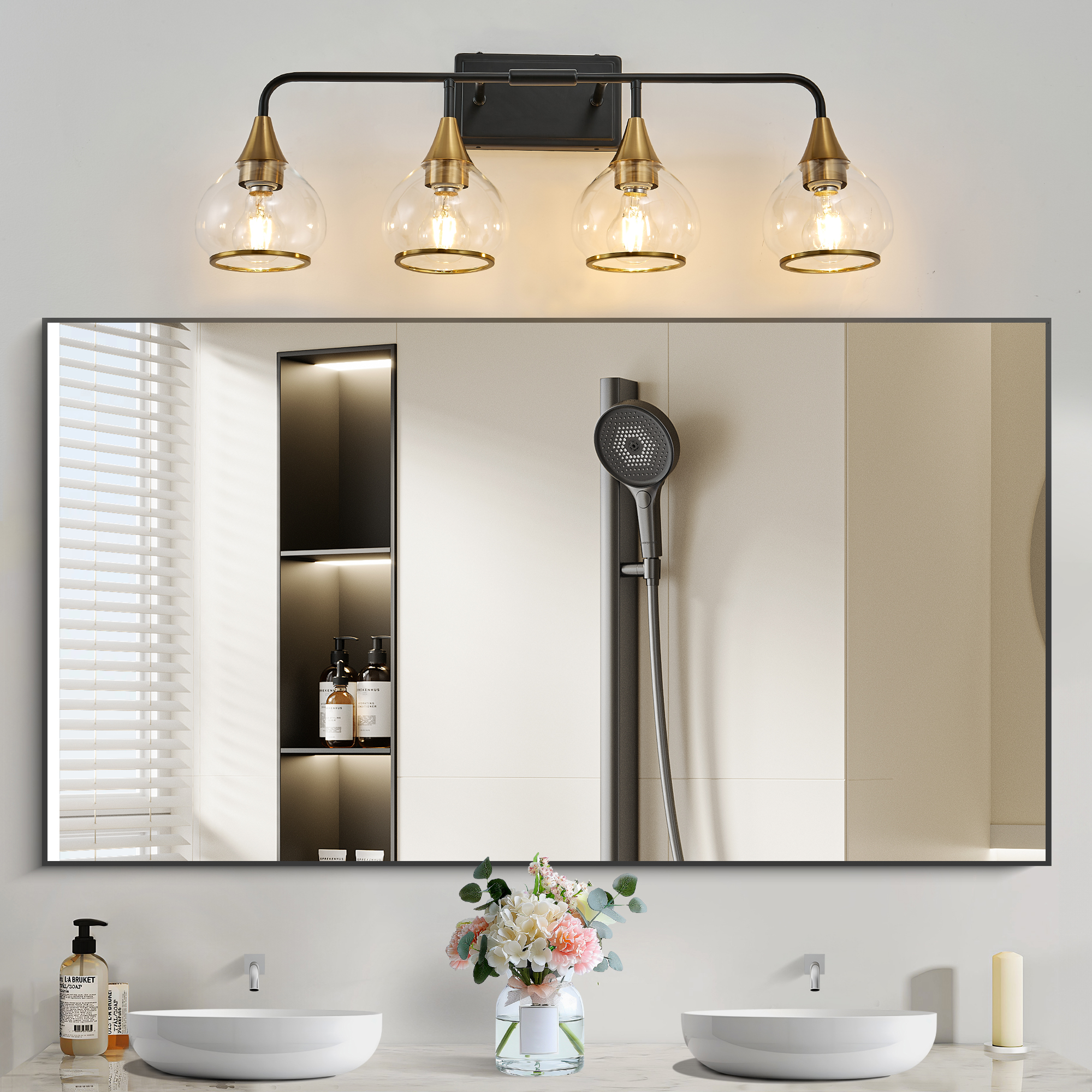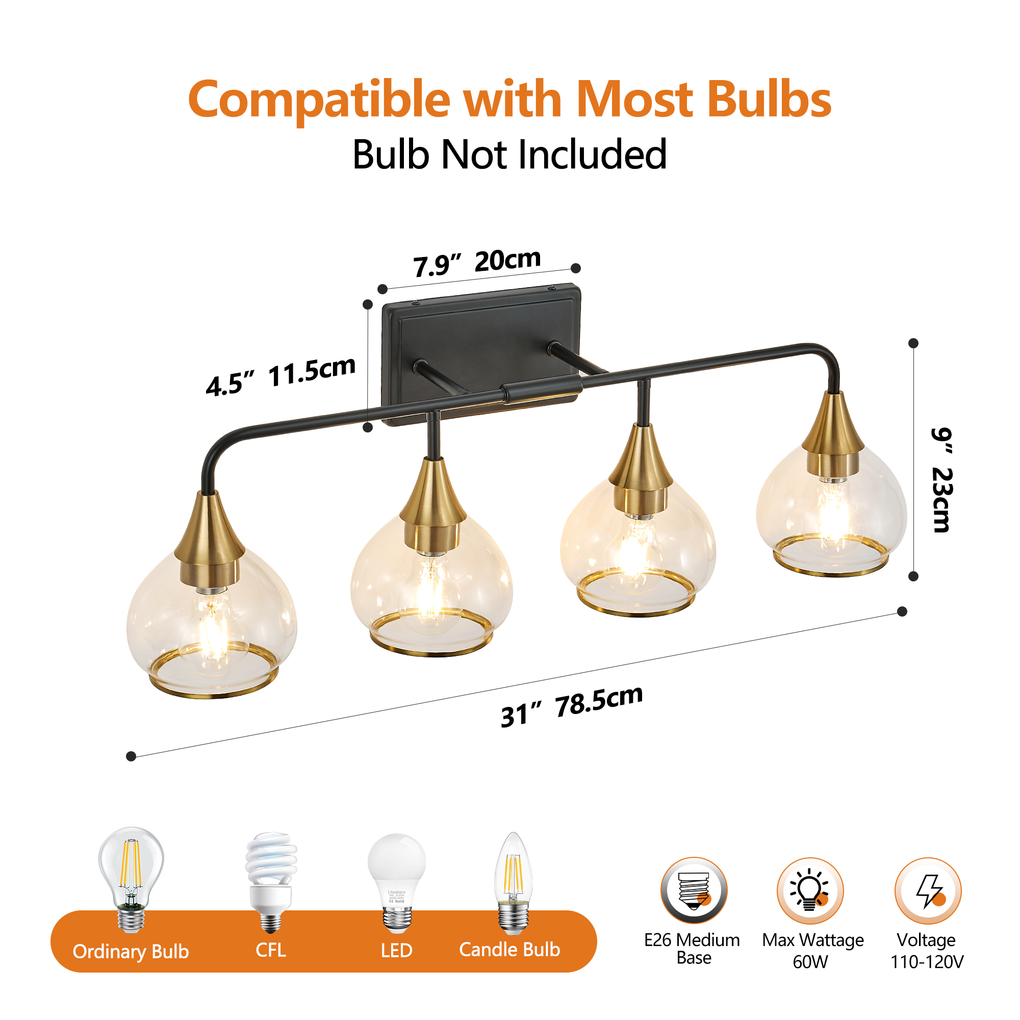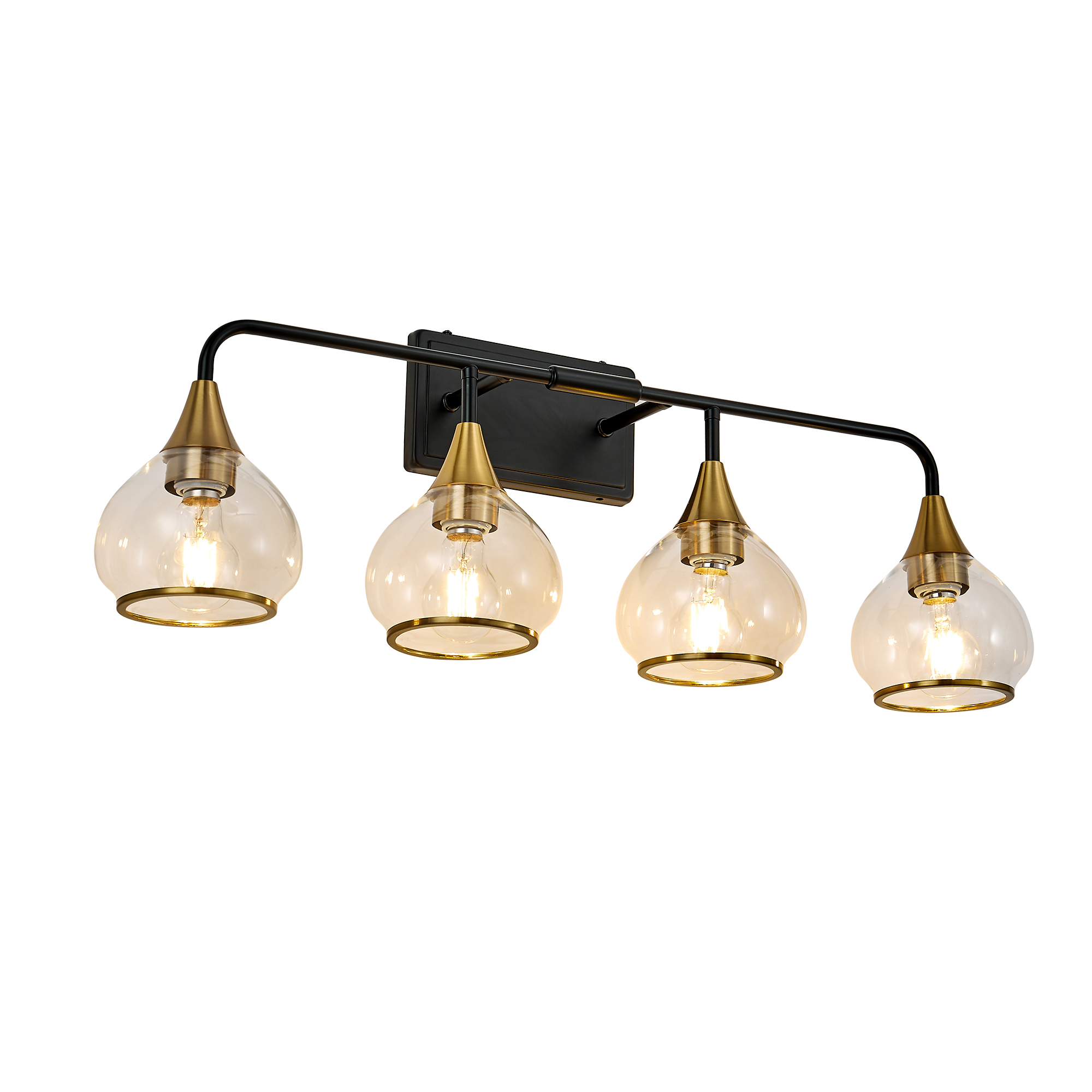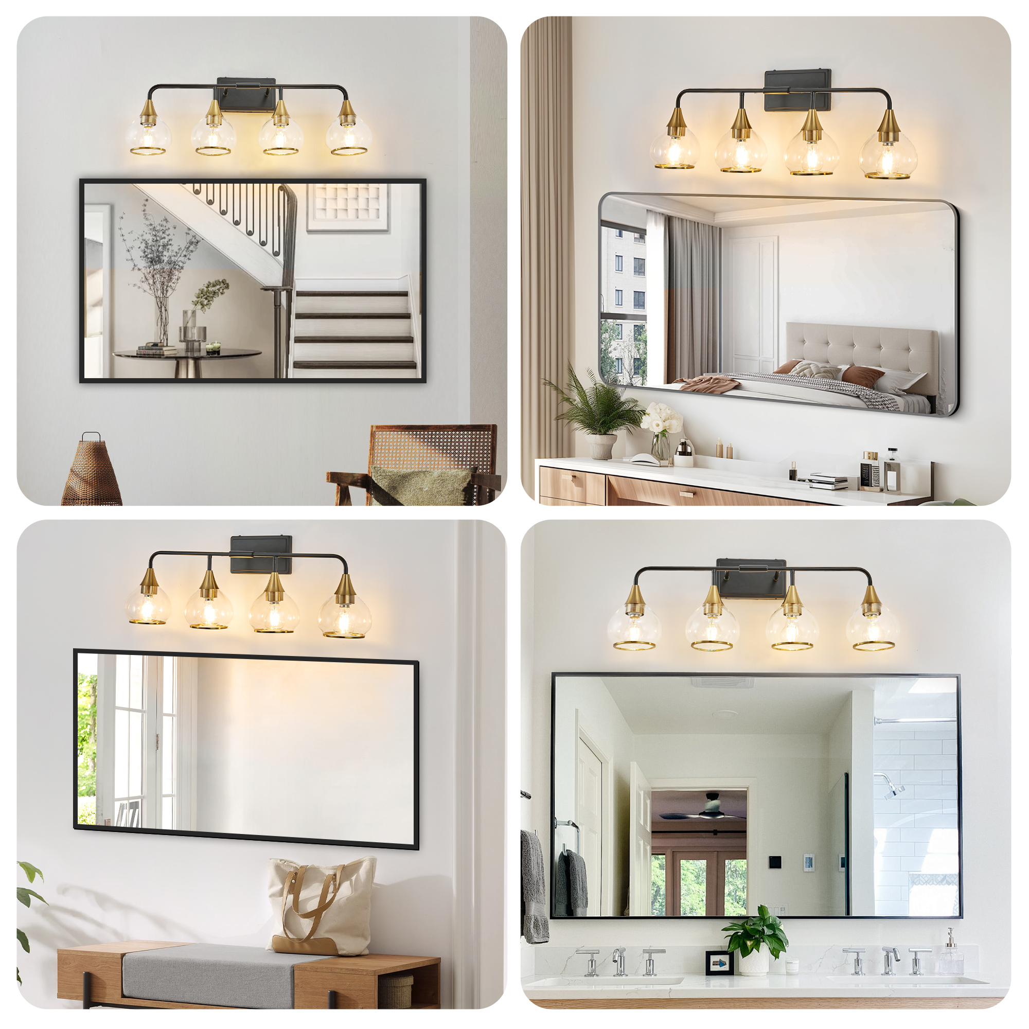 Modern industrial style design: The black metal lamp bracket paired with brass lamp holders is fashionable and retro, suitable for various decoration styles such as modern, industrial, retro, and farmhouse.High transparency glass lampshade: The transparent glass lampshade provides uniform and soft lighting, making the light more natural and creating a bright and comfortable space.Suitable for various scenarios: Suitable for bathroom mirrors, dressing tables, bedrooms, corridors, living rooms, and other spaces to enhance indoor atmosphere.Compatible with multiple light bulbs: Compatible with E26 standard lamp sockets, can use LED, incandescent, and energy-saving lamps, but the product does not include light bulbs.Durable and easy to install: High quality metal frame, rust resistant and durable; Comes with installation accessories and instructions, easy DIY installation without the need for professional electricians.