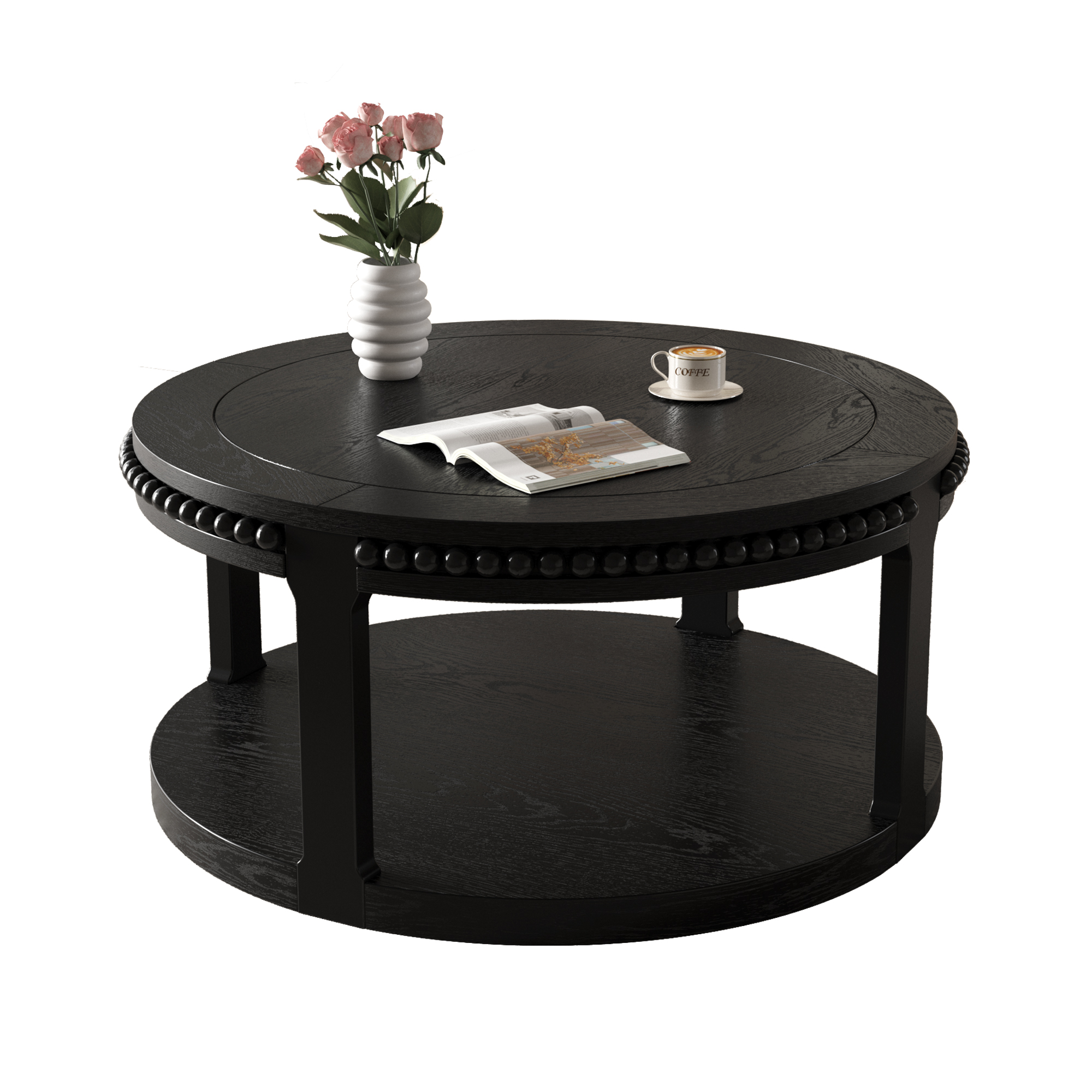 Introducing the 31.5-inch Round Solid Wood Coffee Table – a versatile centerpiece designed to transform your living room. Crafted from premium solid wood, this open two-tier design (31.5" W x 31.5" D x 17.72" H) delivers effortless storage visibility and quick access. Each thickened circular shelf supports 100 lbs, offering easy-access display space for books, decor, trays, or plants while maintaining clutter-free sophistication. Four substantial solid wood legs anchor the open storage architecture, ensuring unwavering stability as a coffee table or sofa companion. The luxe lacquer finish accentuates the wood’s radial grain while resisting scratches. Delicate beaded trim edges the tabletop, contrasting modern function with artisan charm.