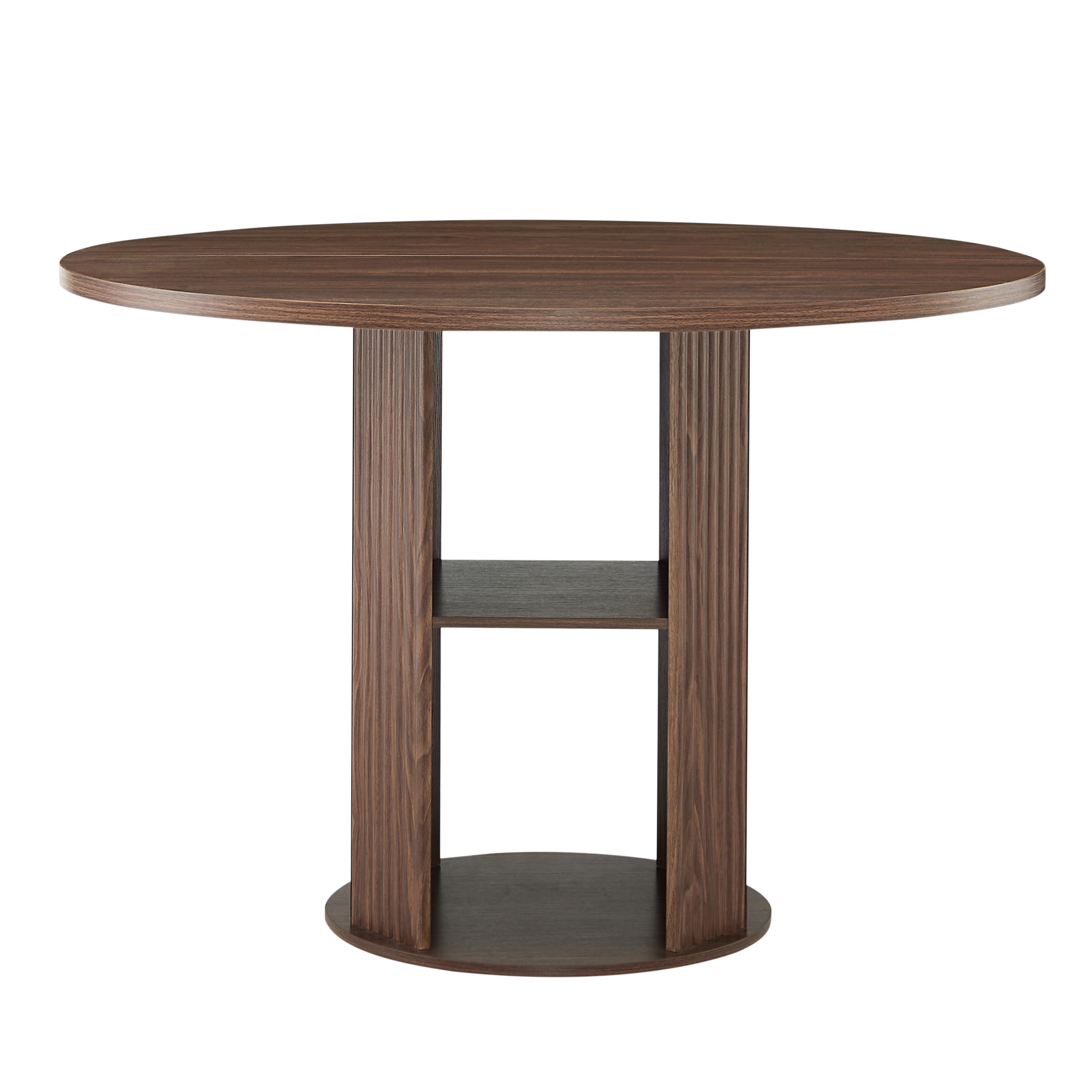 Product Name:47.24" Round Dining Table (Serves 2–4) with Two Dining Chairs Blends modern and farmhouse styles, featuring a double-tiered storage shelf, suitable for dining rooms or living spaces. Walnut