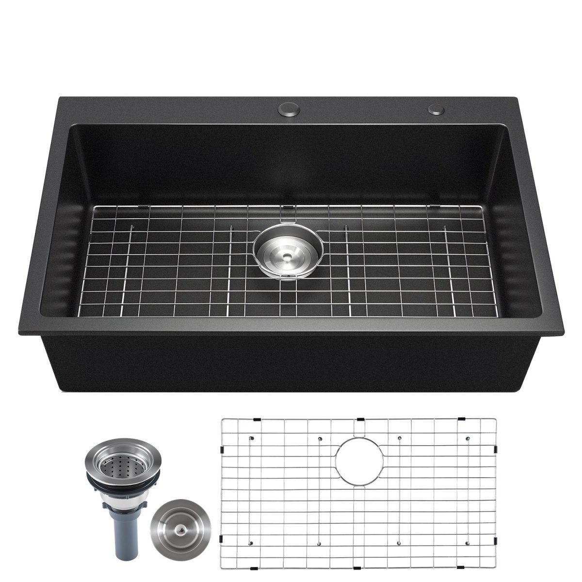 Multi-Part Kit for Granite Kitchen Sink: Grid reduces scratch and dampens noise; drain kit with filters catches debris for rapid water flow; silicone stopper forms a tight seal, keeping the top mount kitchen sink fresh and cutting standing water