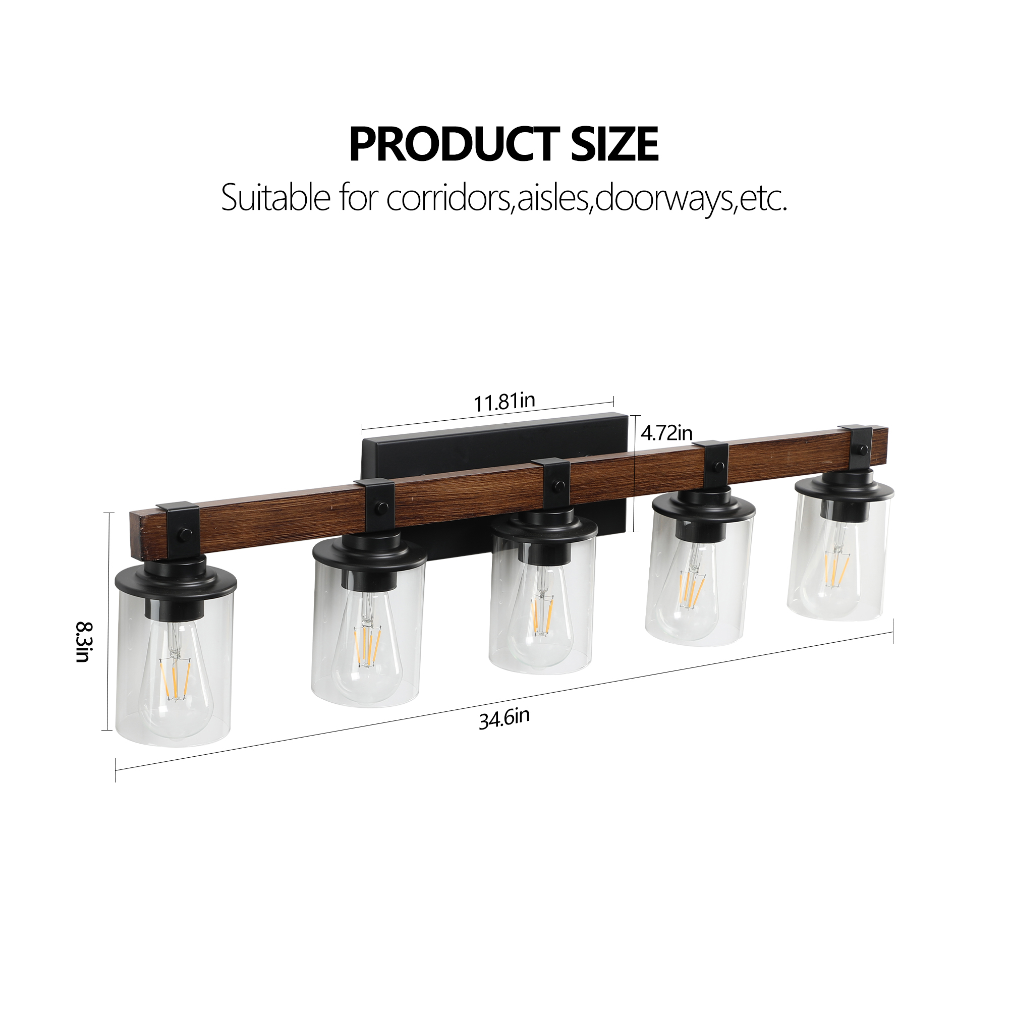 Rustic & Farmhouse Design:A combination of black and wood design brings modernity and rustic style, which shows a simple and pure atmosphere and perfectly suits for your home decoration.Premium Material:Our bathroom light fixture is made of high quality metal and wood, compatible with incandescent, LED, CFL and other bulbs of E26 standard medium base .Maximum power 60W, (Bulbs NOT Included).Applicable Scenarios:This 5-light bathroom light fixture perfectly transforms a bathroom into a romantic, rustic relaxing atmosphere for any bathroom and vanity setting in a farmhouse, urban industrial or vintage electric interior.Easy to install:All mounting hardware for quick and easy installation are included in the package.