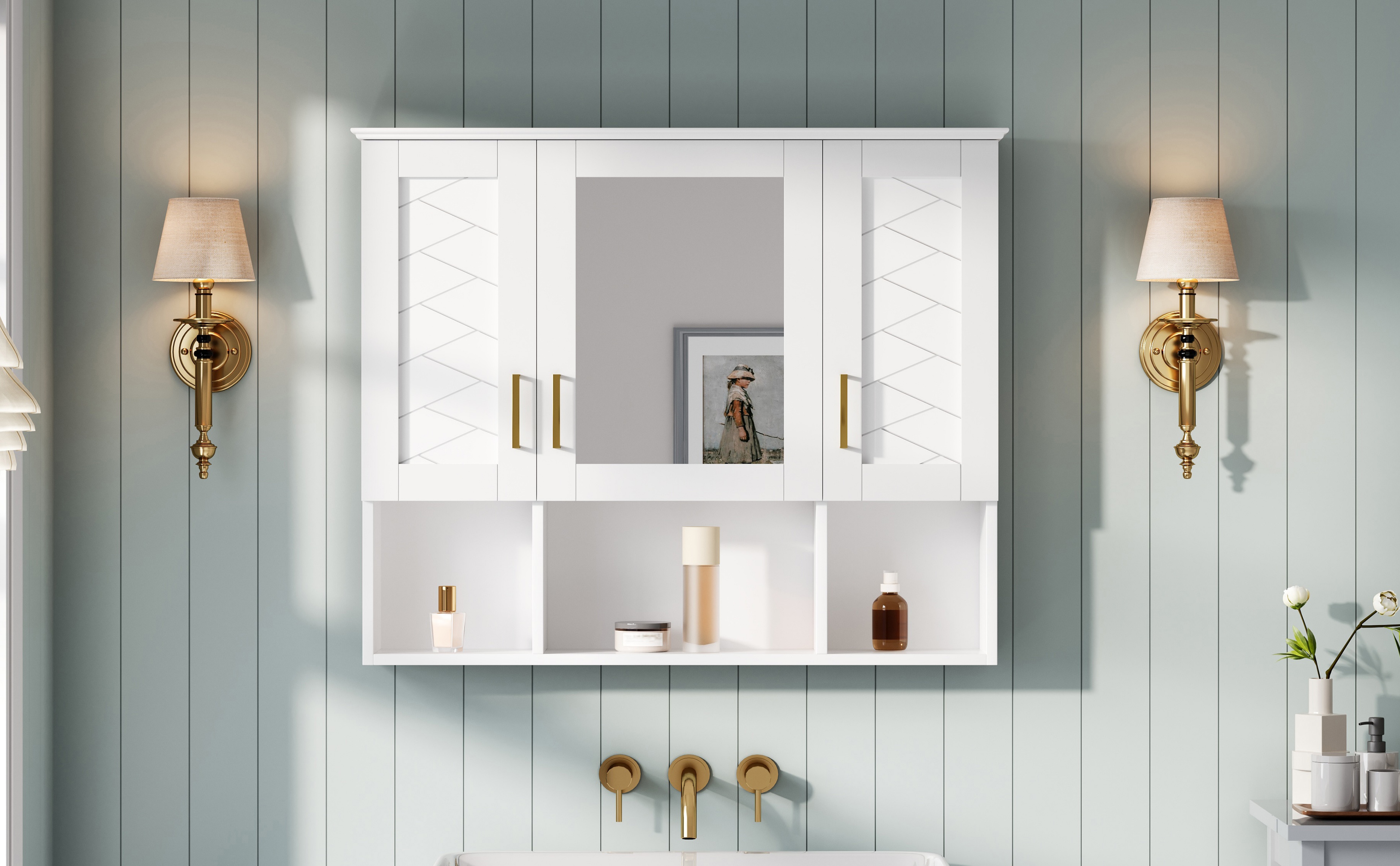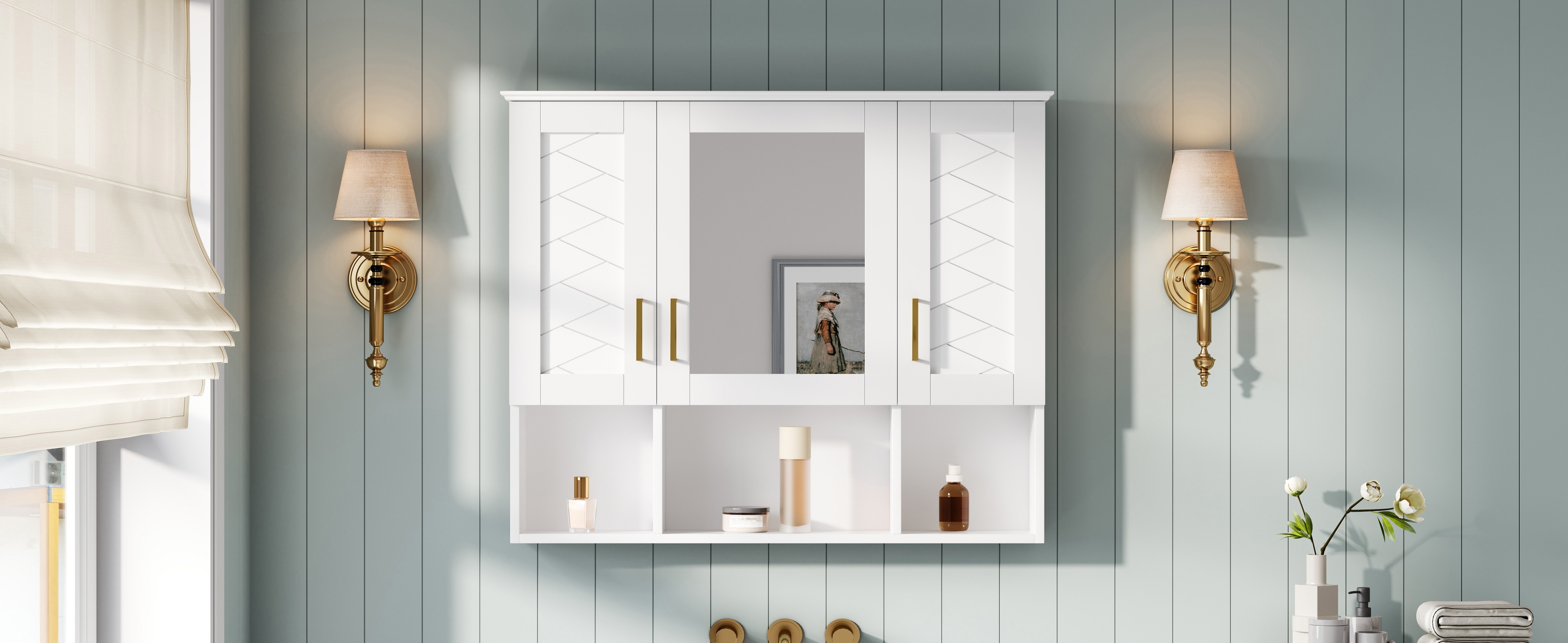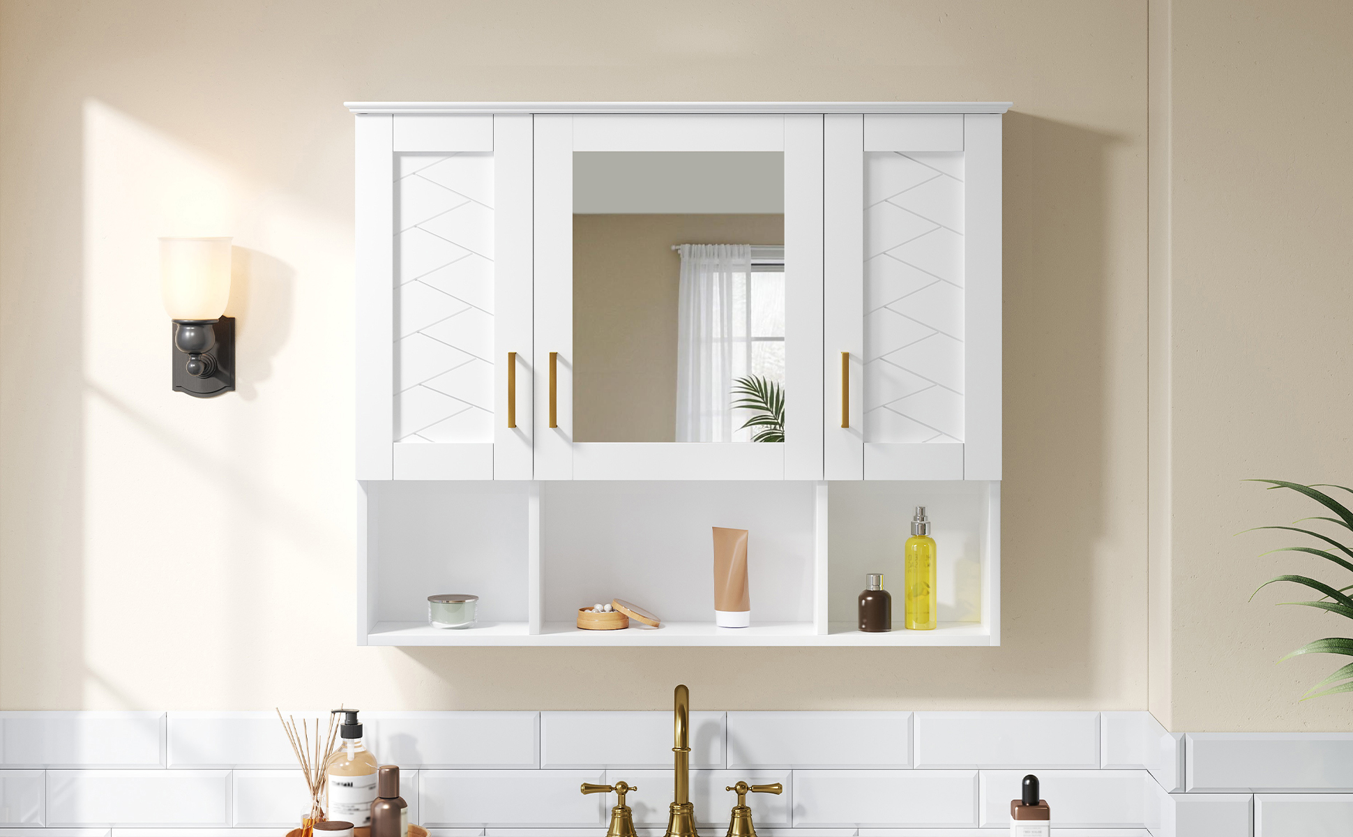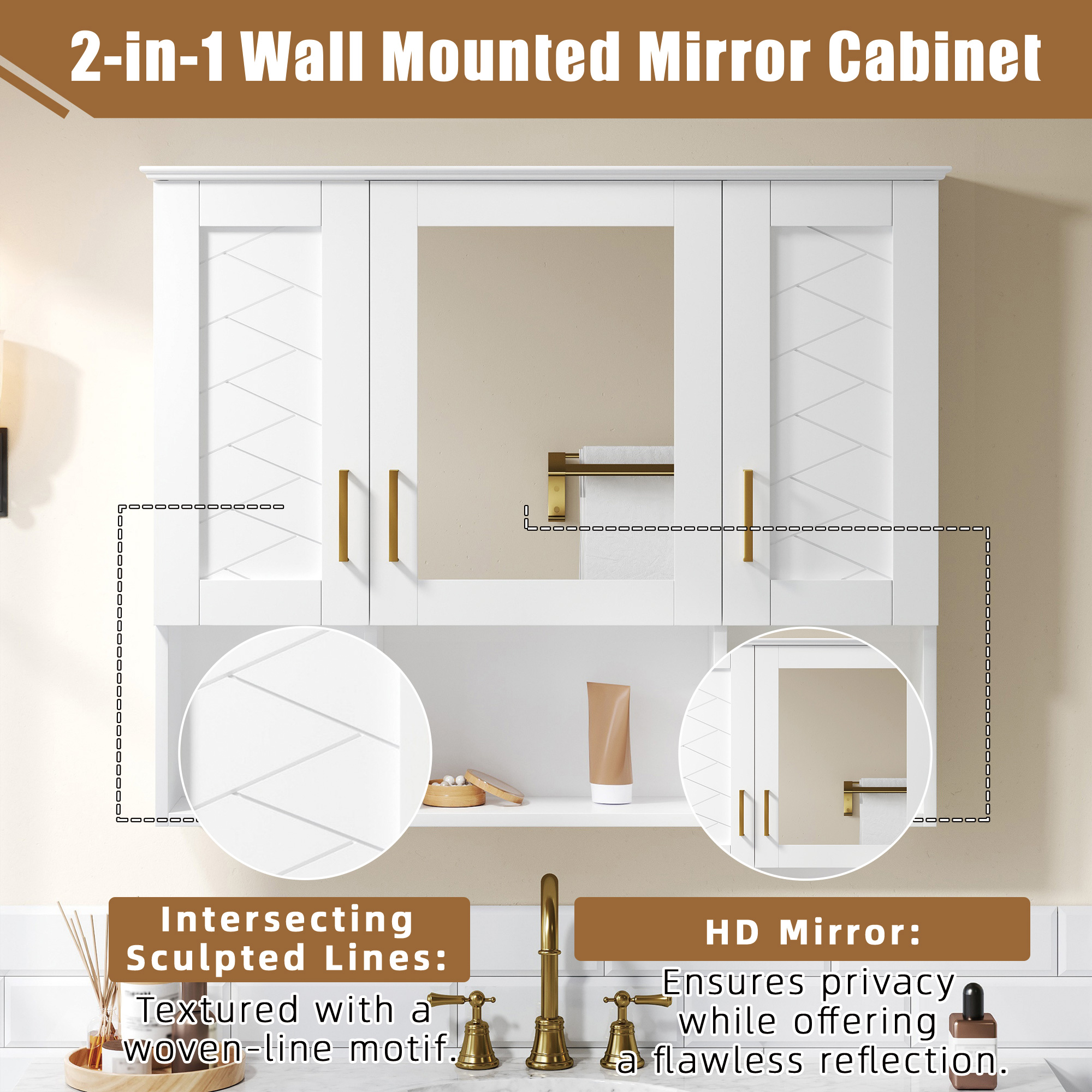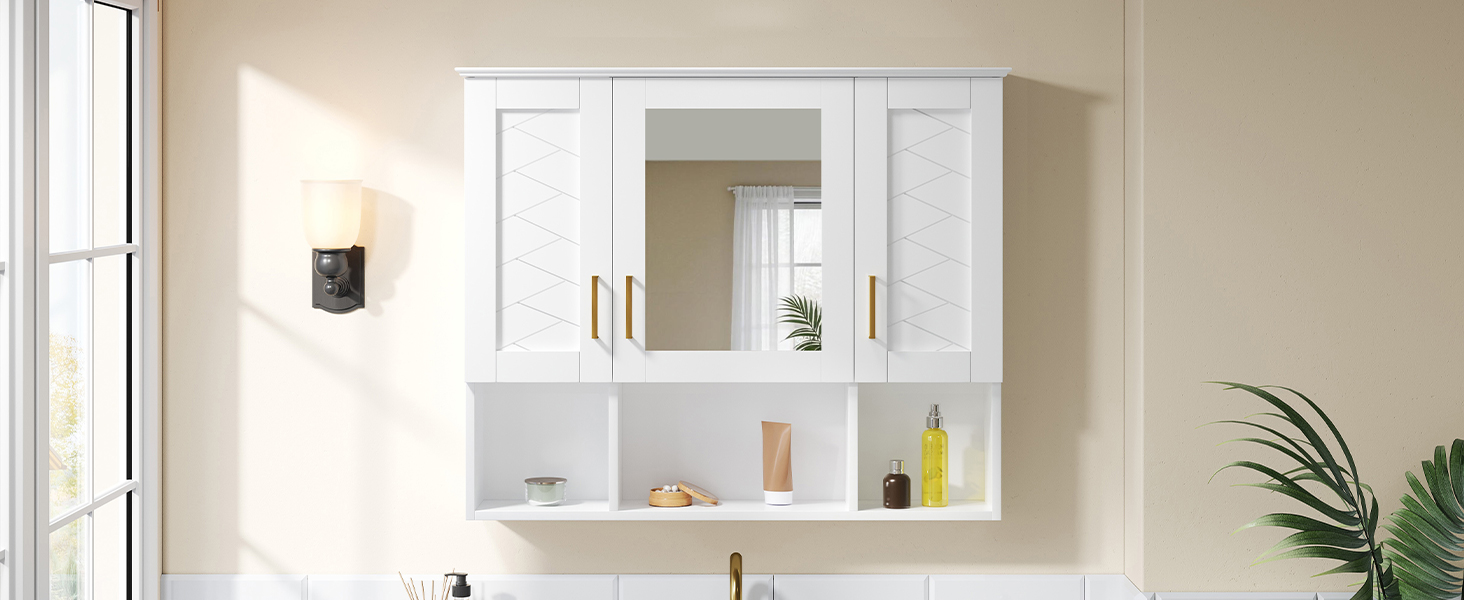 This wall-mounted mirror cabinet seamlessly combines elegant design with practical functionality. Its high-definition mirror provides a flawless, distortion-free reflection. Premium details including a sturdy metal handle, soft-closing hinges, and a refined top design ensure quiet operation, lasting durability, and a cohesive aesthetic that elevates any bathroom decor.