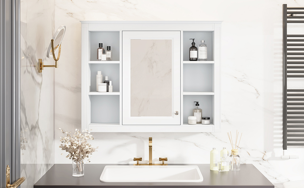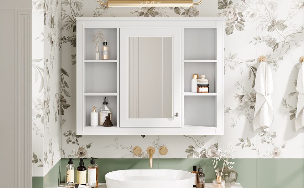 Product Name:35'' x 27.5'' Medicine Cabinet, Wall Mounted Bathroom Storage Cabinet, Modern Bathroom Wall Cabinet with Mirror, Mirror Cabinet with 6 Open Shelves (Not Include Bathroom Vanity )