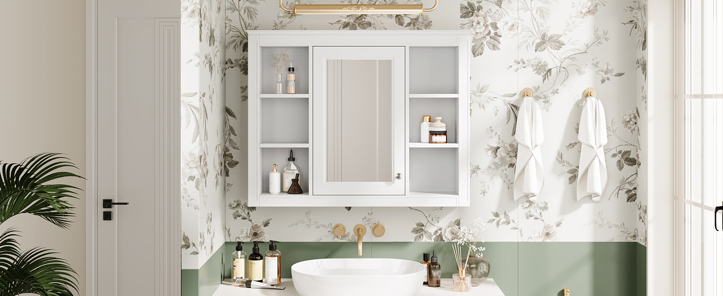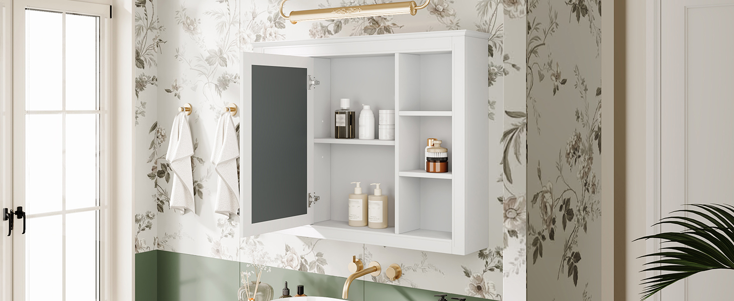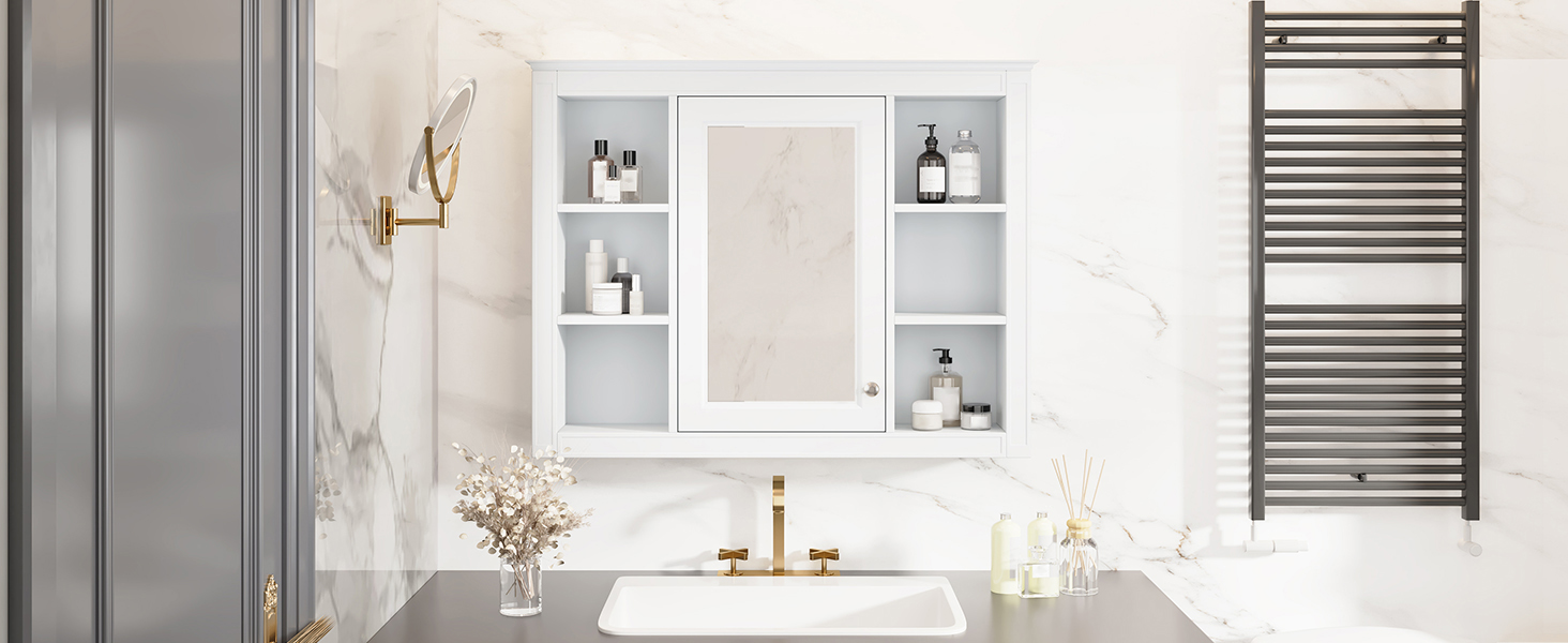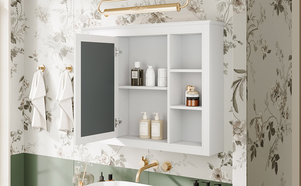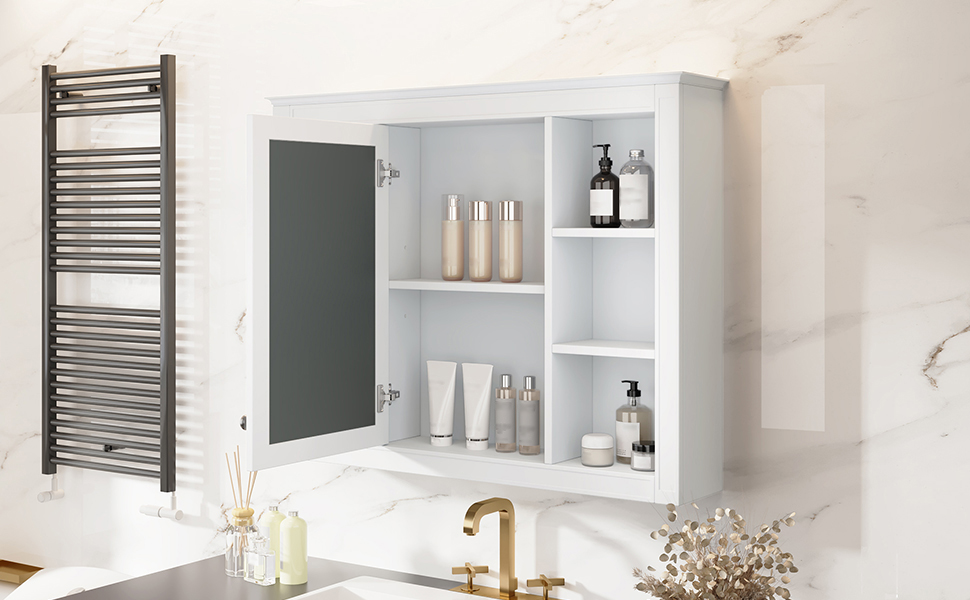 This wall-mounted mirror cabinet perfectly combines modern design with excellent functionality. It is made of high-quality MDF board, which is durable and environmentally friendly. The high-definition mirror provides clear reflections, making every use convenient and quick. The clever design combines hidden and open shelves to store personal items and keep the space tidy, while displaying commonly used items for easy access. Two built-in storage cabinets meet large-capacity storage needs and perfectly hide clutter. The three-layer adjustable storage board allows you to flexibly adjust the storage space according to your needs and adapt to the storage of different items. The included towel rod design allows you to easily hang towels or clothes, increasing the practicality and convenience of the bathroom. Whether it is the bathroom, bedroom or other space, this mirror cabinet can provide a neat, practical and beautiful storage solution to improve the quality of your home life.