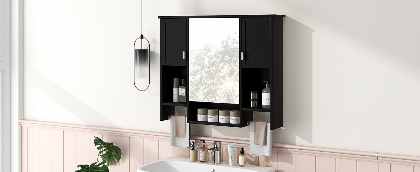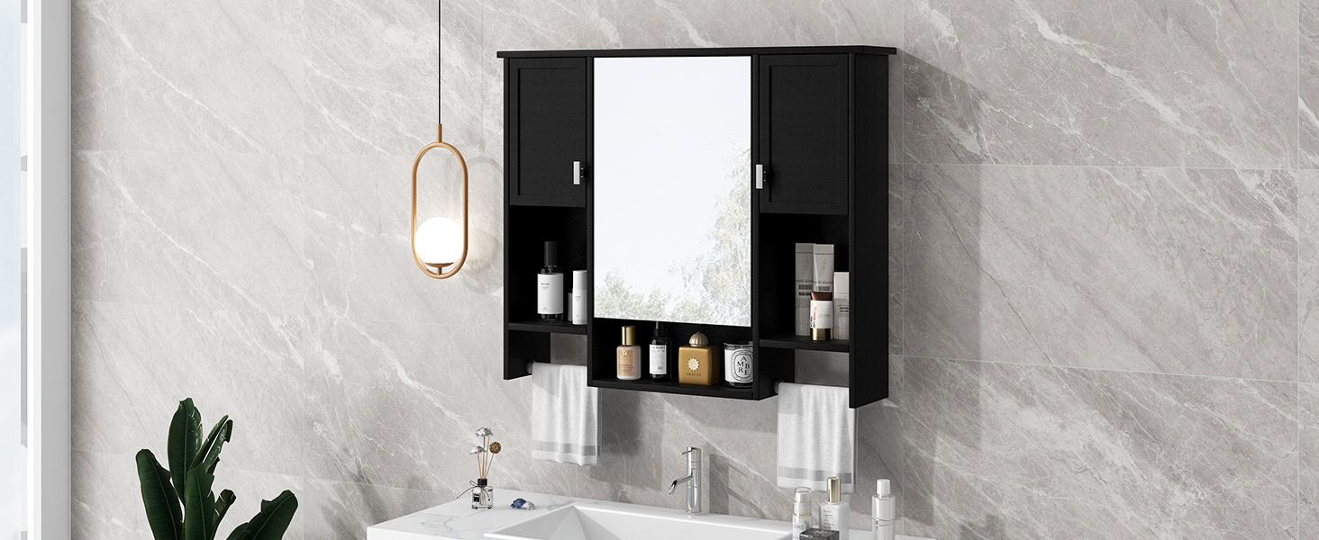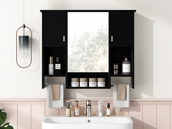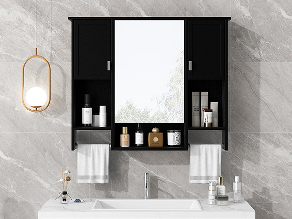 This wall-mounted mirror cabinet perfectly combines modern design with excellent functionality. It is made of high-quality MDF board, which is durable and environmentally friendly. The high-definition mirror provides clear reflections, making every use convenient and quick. The clever design combines hidden and open shelves to store personal items and keep the space tidy, while displaying commonly used items for easy access. Two built-in storage cabinets meet large-capacity storage needs and perfectly hide clutter. The three-layer adjustable storage board allows you to flexibly adjust the storage space according to your needs and adapt to the storage of different items. The included towel rod design allows you to easily hang towels or clothes, increasing the practicality and convenience of the bathroom. Whether it is the bathroom, bedroom or other space, this mirror cabinet can provide a neat, practical and beautiful storage solution to improve the quality of your home life.
