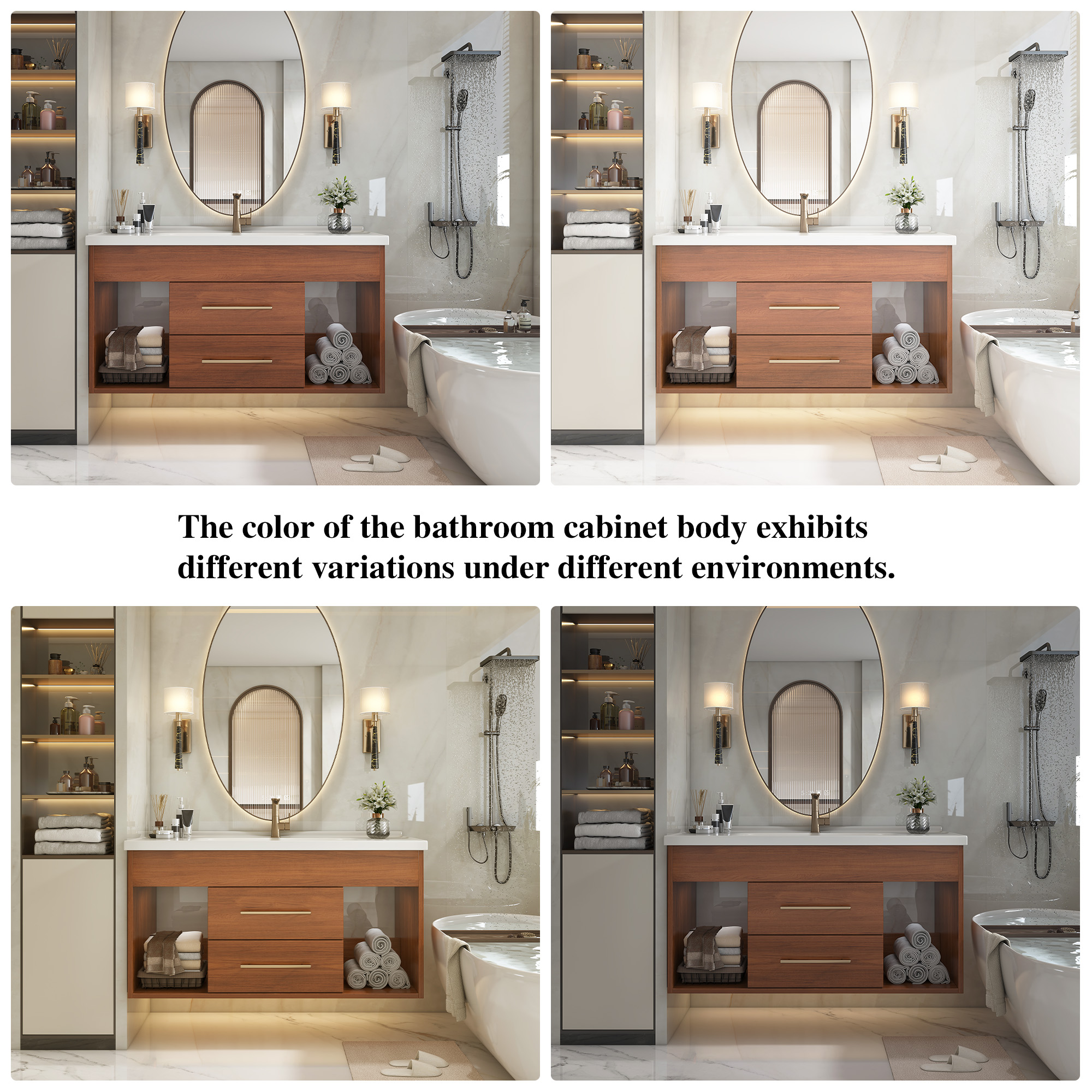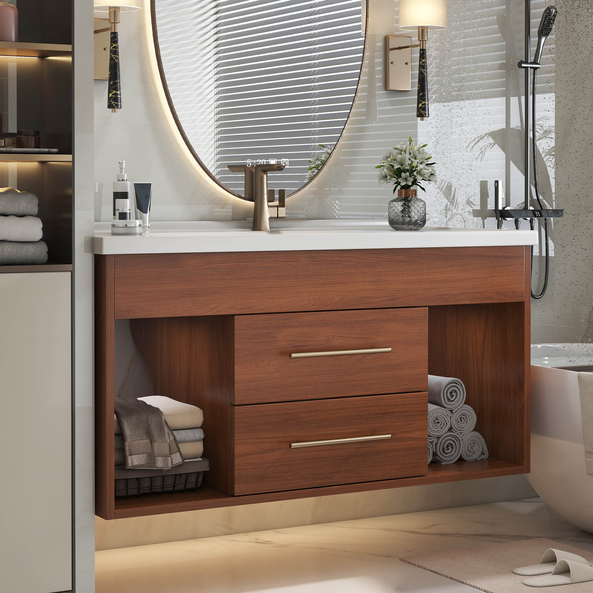 Upgrade your bathroom with this versatile 35.4-inch vanity. Constructed from durable, moisture-resistant multilayer solid wood, it features a seamless integrated ceramic undermount sink for a sleek, easy-to-clean surface. The combination of two soft-close drawers and two open shelves offers flexible storage options for all your essentials. Finished with elegant oil rubbed bronze handles, this vanity delivers a perfect blend of modern functionality and classic warmth to your space.
