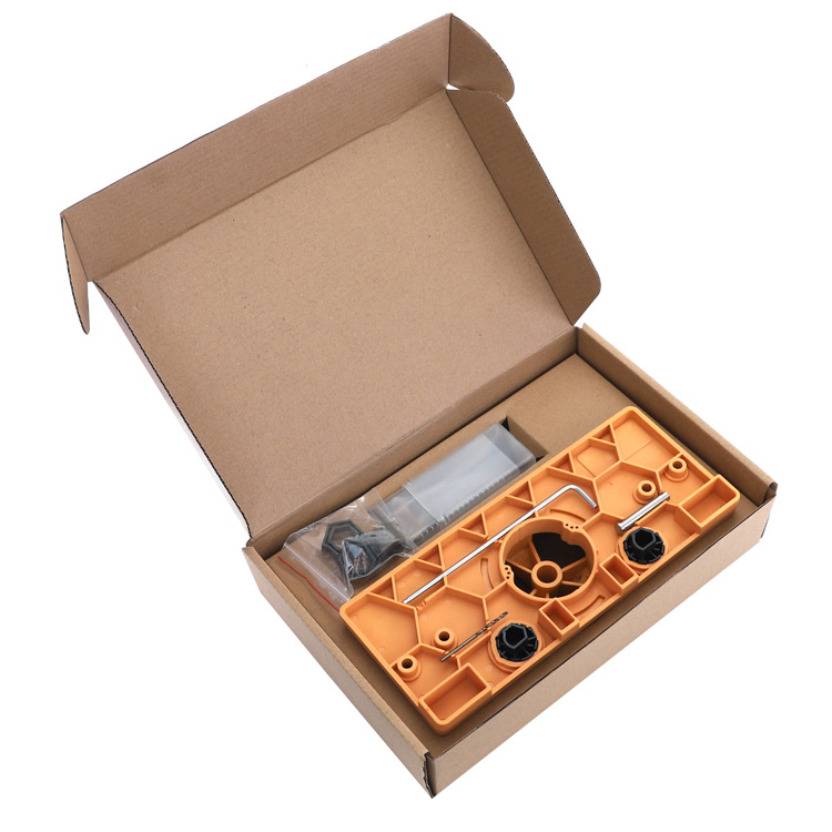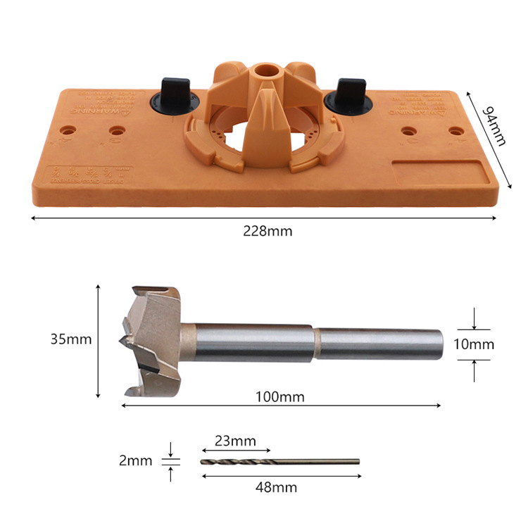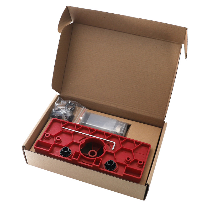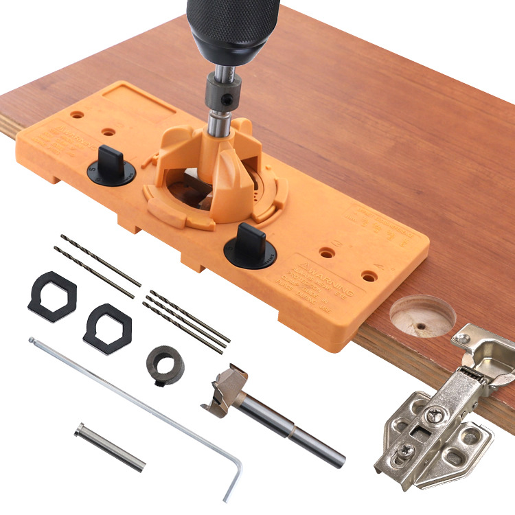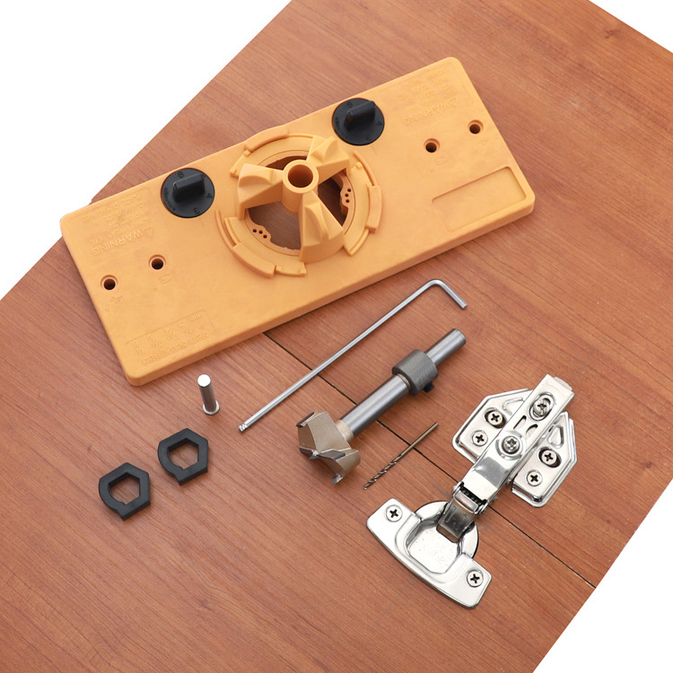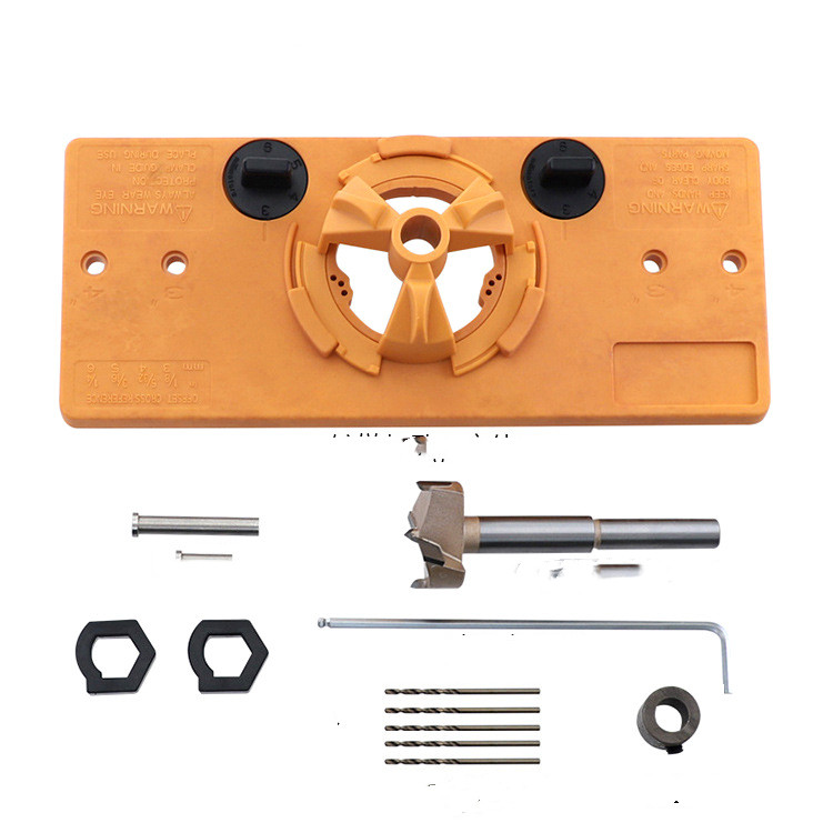 The set includes: hinge hole punch main body, 35mm hole opener, two 26mm hole limiting aids, limiting ring, hex wrench, 5 2mm drill bits, positioning rod