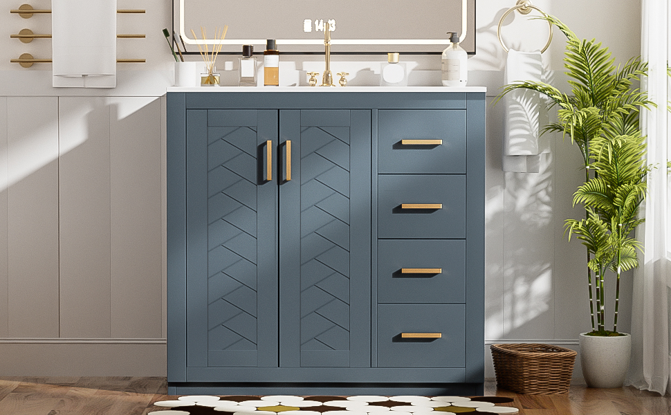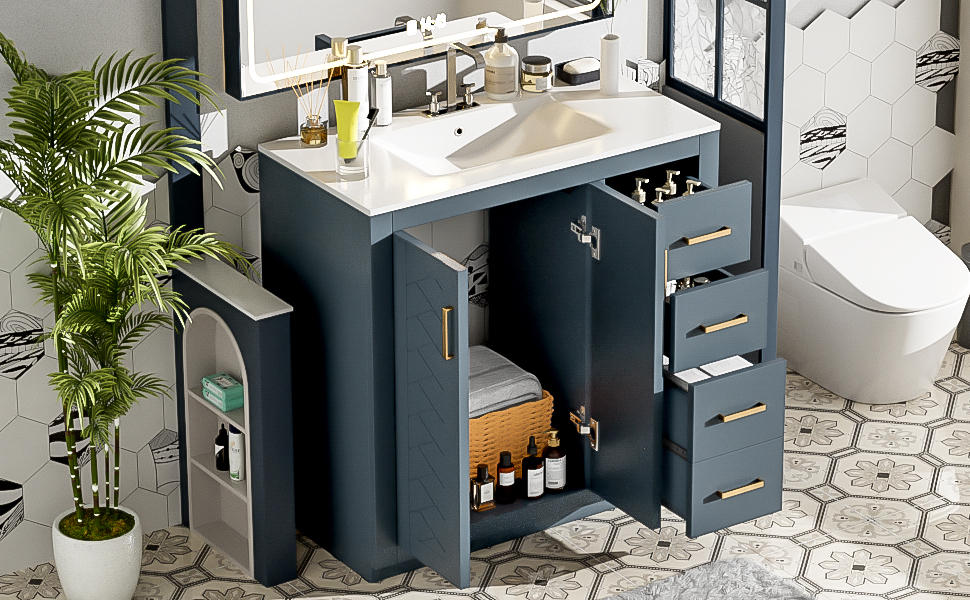 • [ Multi-Purpose Cabinet & Concealed Storage ] Are you looking for stylish and functional storage solutions for your bathroom? Our bathroom vanity provide ample space for all your toiletries and bathroom essentials. The combination of the cabinet body and the drawer perfectly stores all kinds of bathroom products and keeps the necessities away from water stains and dust. Soft-close doors and drawer fronts feature a water-resistant paint finish for durability.