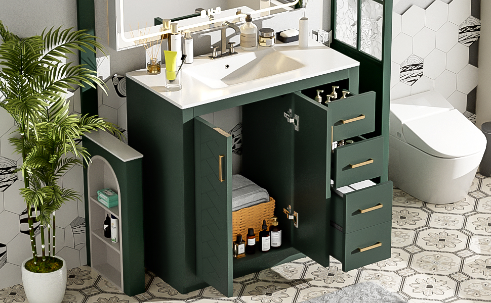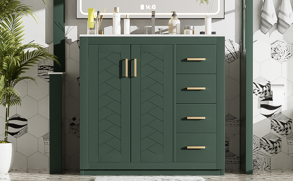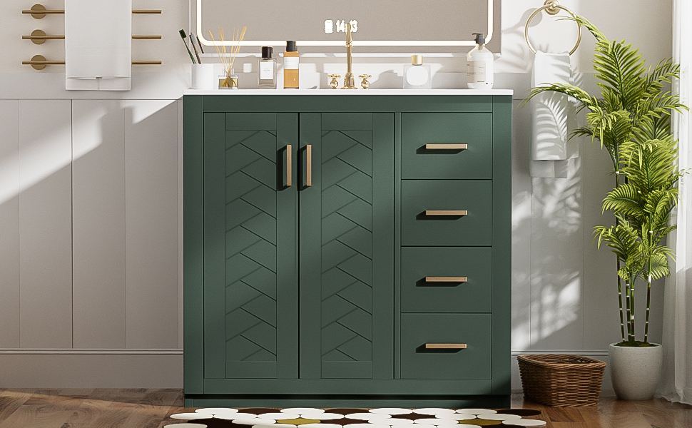 • [ Multi-Purpose Cabinet & Concealed Storage ] Are you looking for stylish and functional storage solutions for your bathroom? Our bathroom vanity provide ample space for all your toiletries and bathroom essentials. The combination of the cabinet body and the drawer perfectly stores all kinds of bathroom products and keeps the necessities away from water stains and dust. Soft-close doors and drawer fronts feature a water-resistant paint finish for durability.