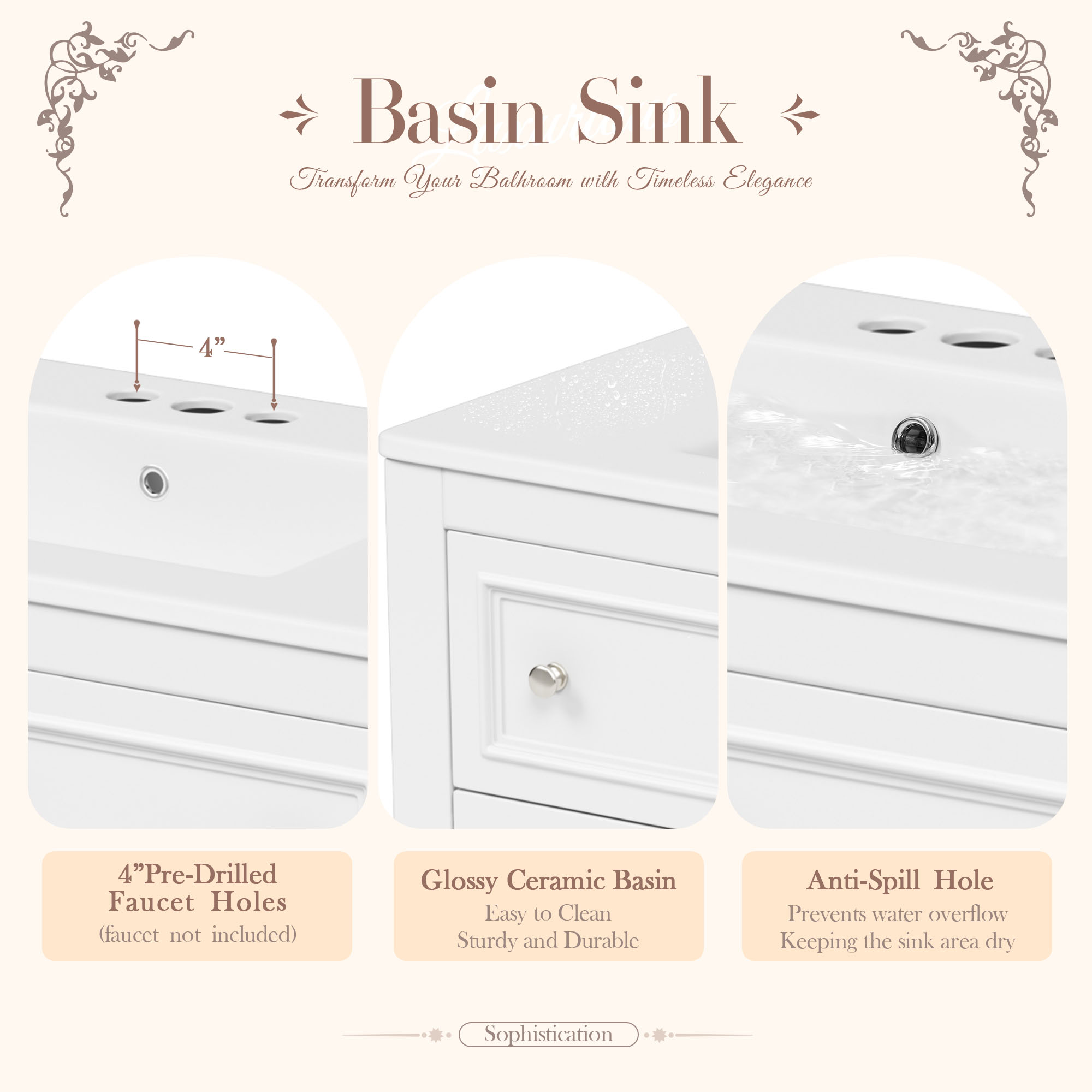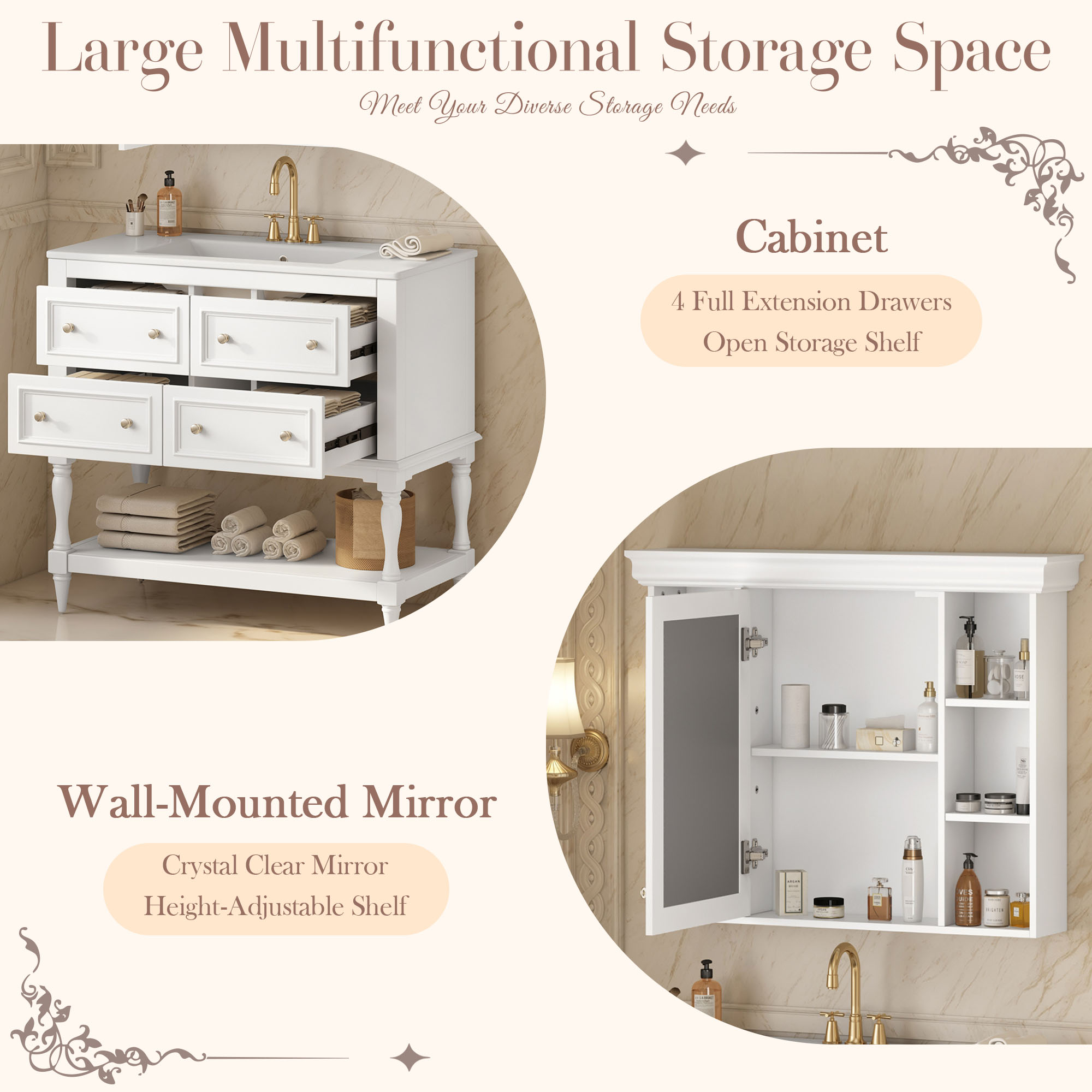 1. Four Extension Drawers 2. Waterproof Painted Finish 3. Silver Handle 4. Solid Wood Frame 5. High Quality MDF Boards 6.Extra Large Storage Shelf 7.Solid 36‘’ Ceramic Sink 8. Medicine Cabinet