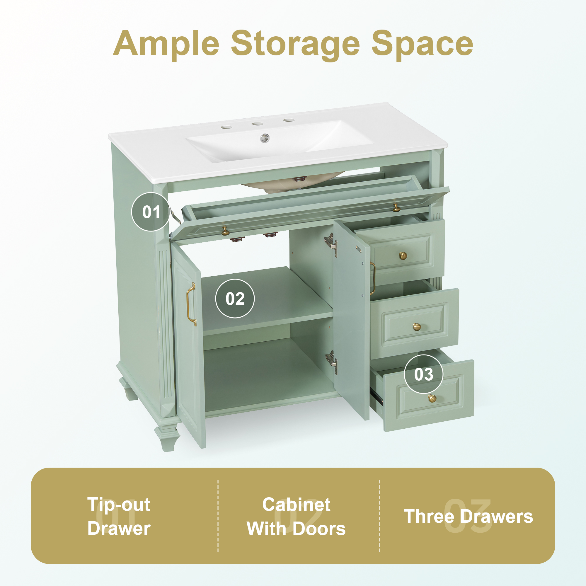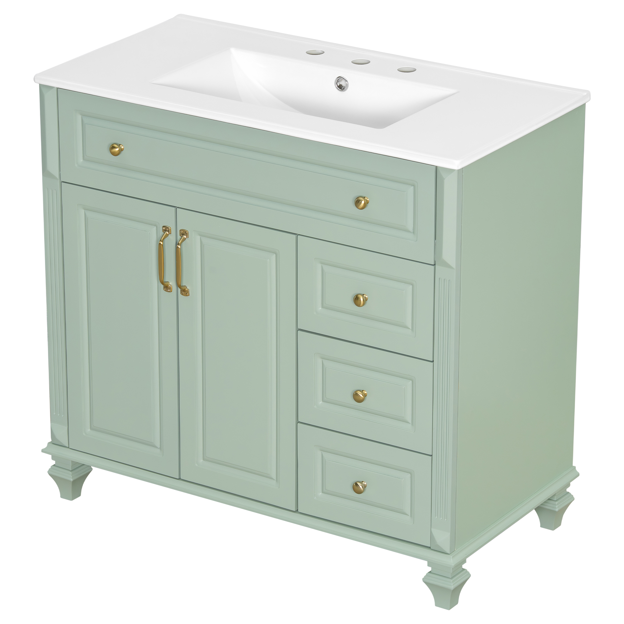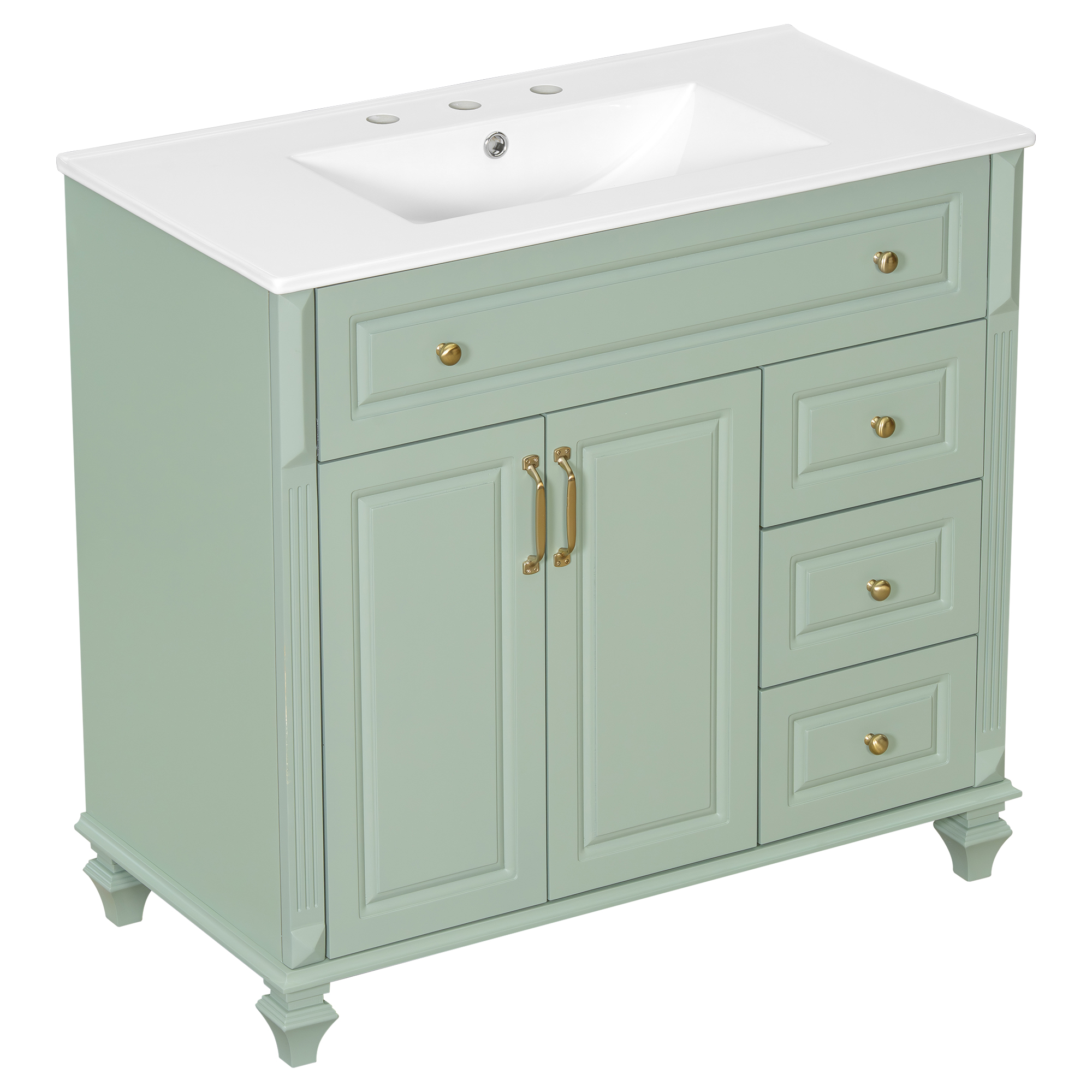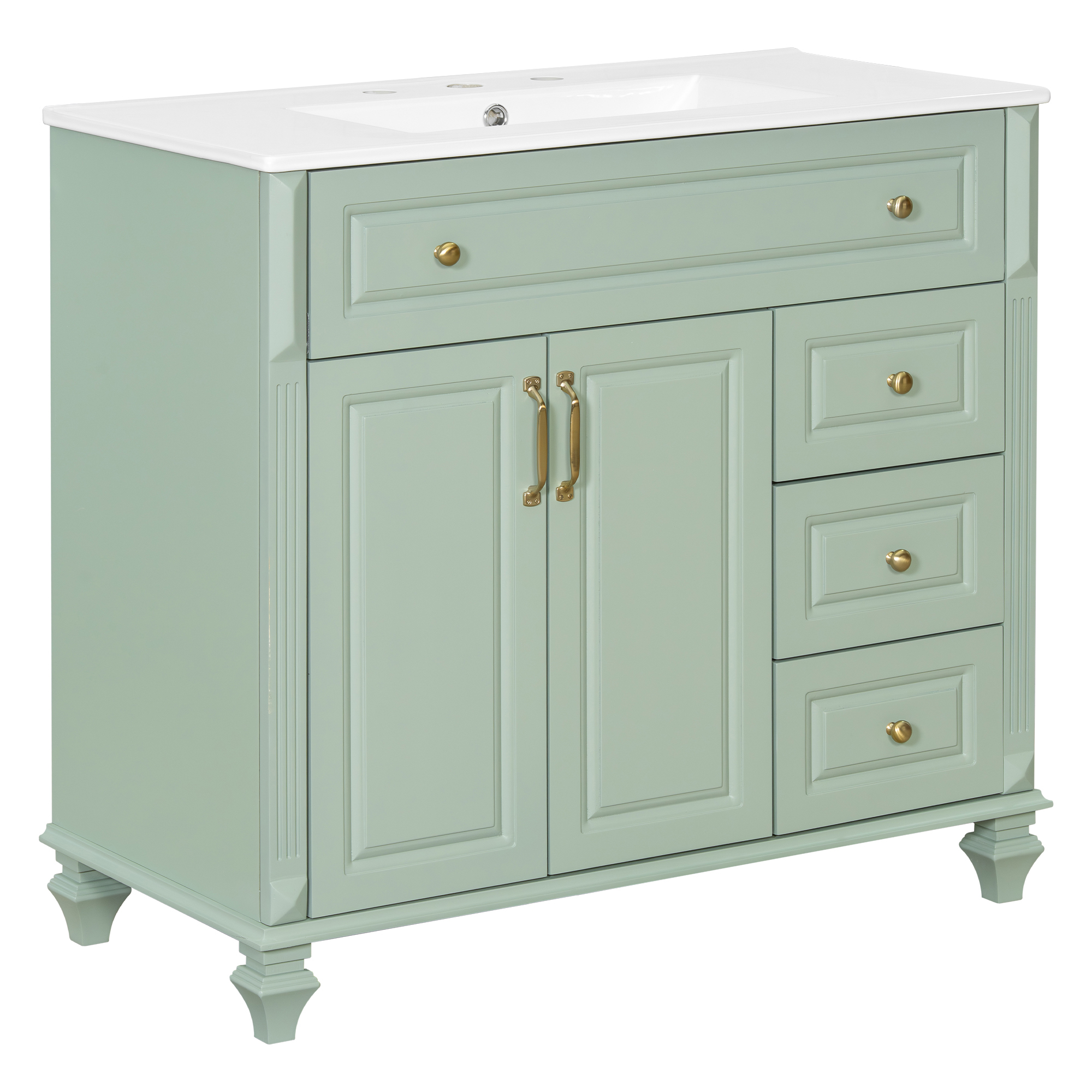 Product Name:36" Bathroom Vanity with Sink, Green Solid Wood Bathroom Cabinet with Flip Drawer, 3 Drawers & 2 Doors, Elegant Design with Golden Metal Handles, Modern MDF Vanity for Bathroom Storage