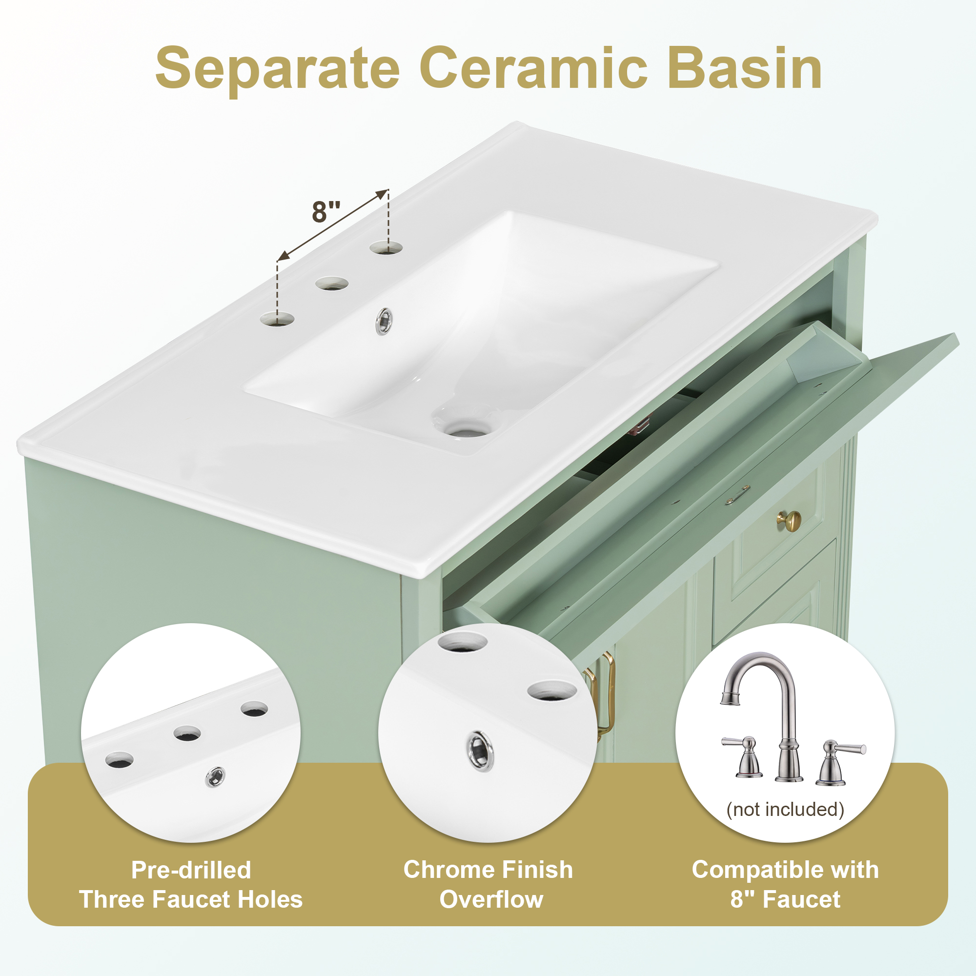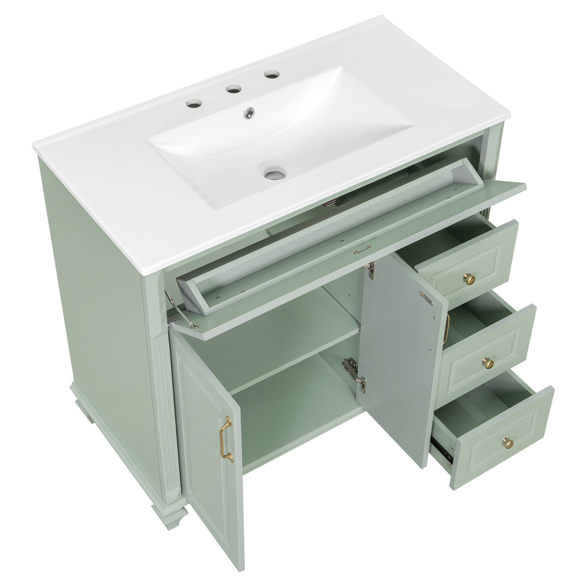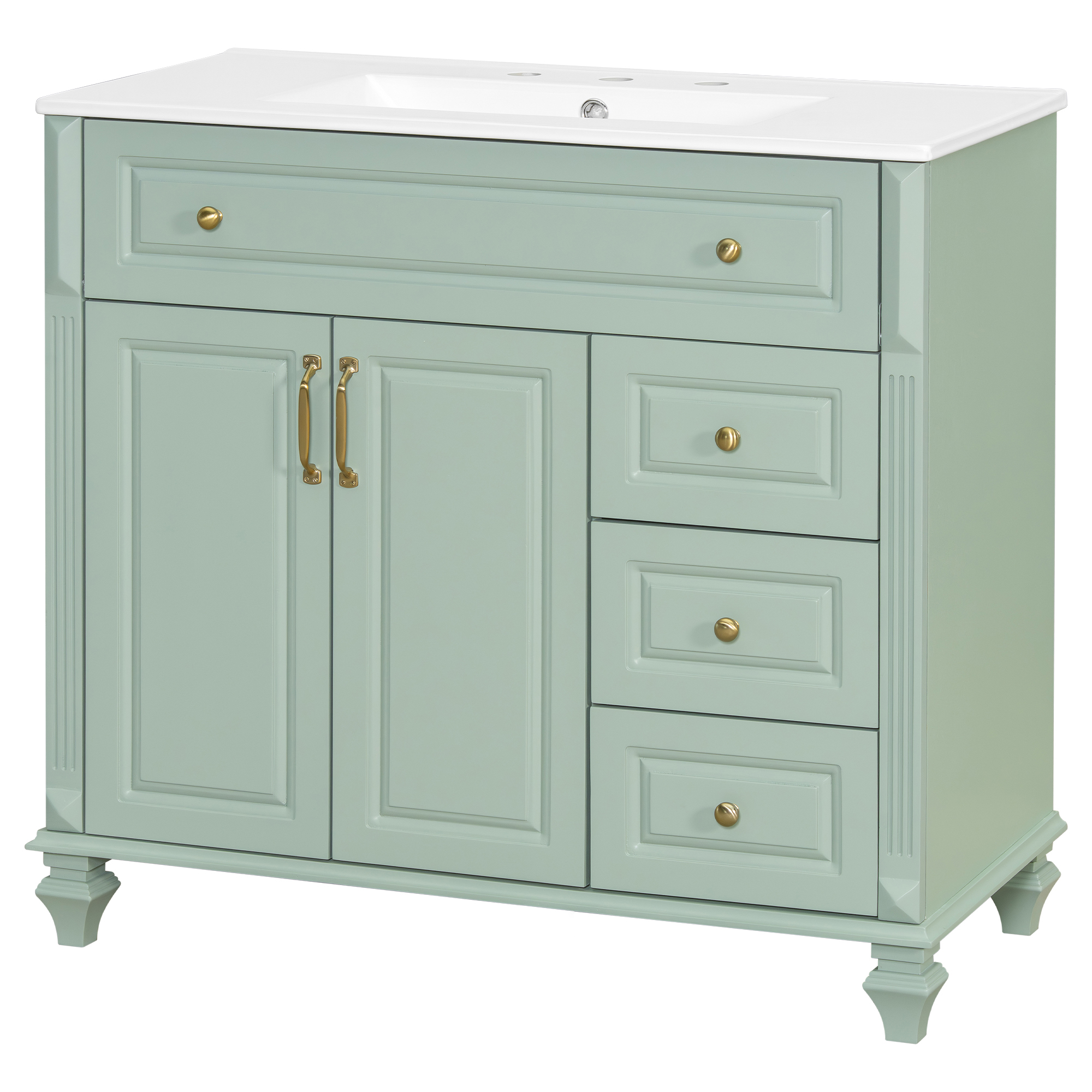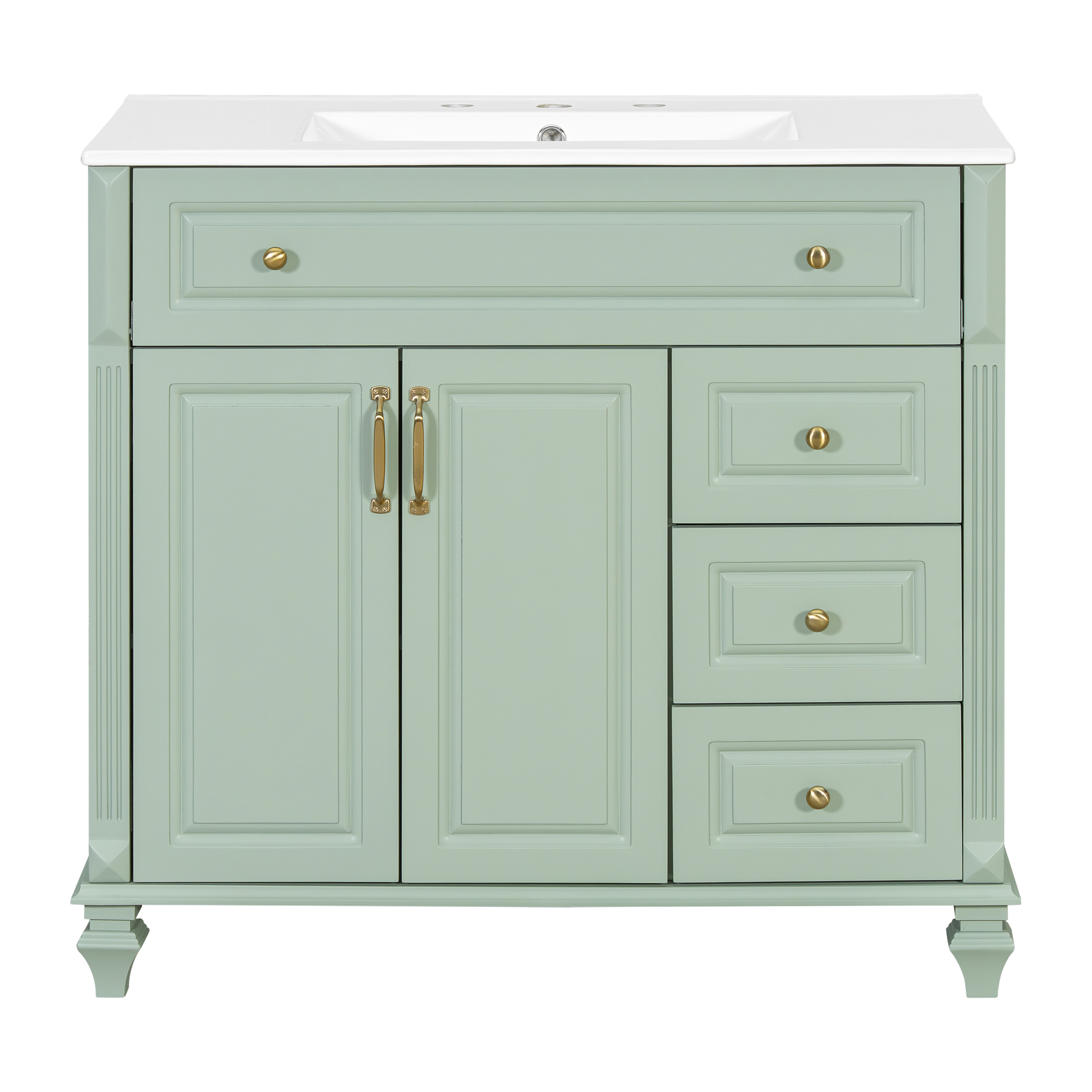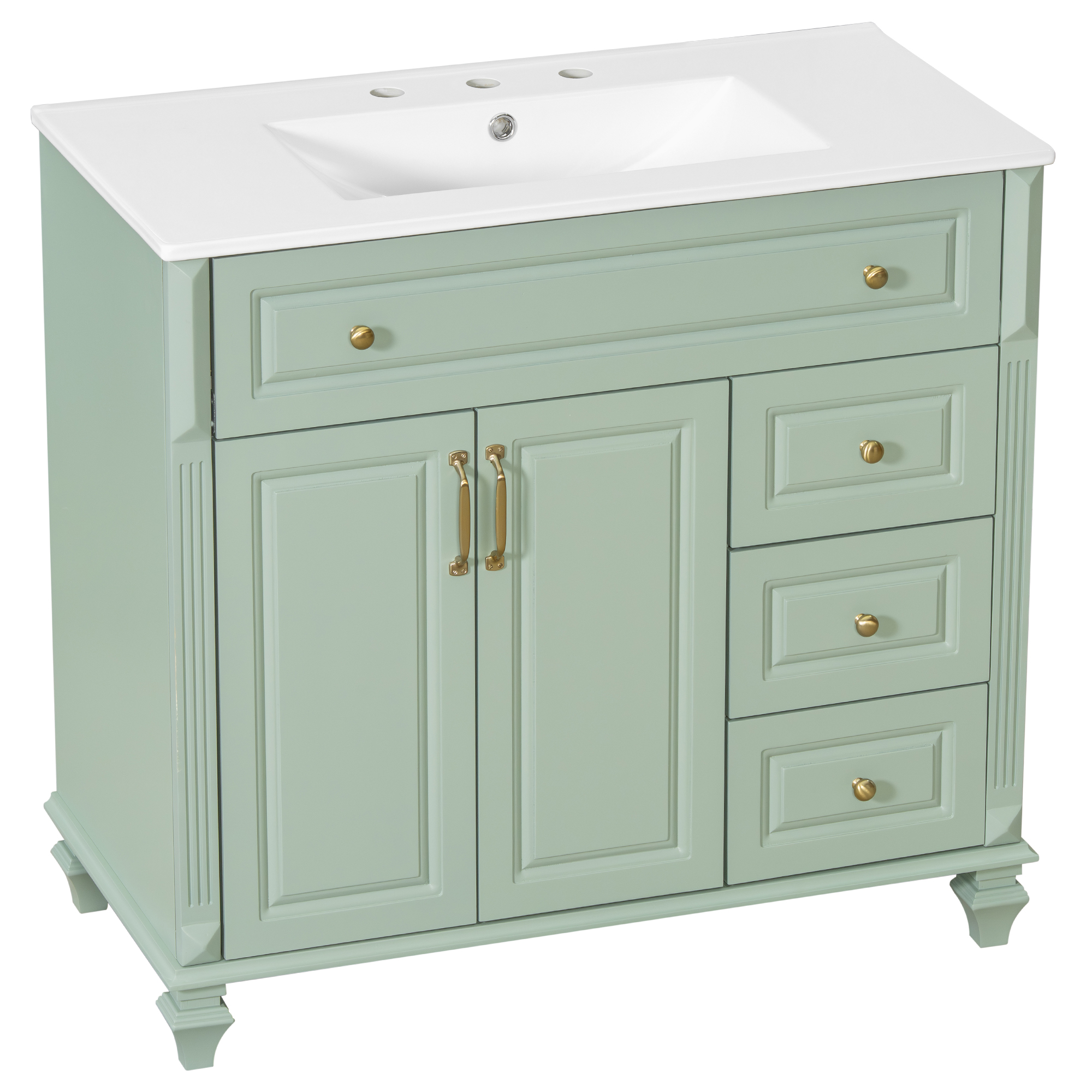 Product Name:36" Bathroom Vanity with Sink, Green Solid Wood Bathroom Cabinet with Flip Drawer, 3 Drawers & 2 Doors, Elegant Design with Golden Metal Handles, Modern MDF Vanity for Bathroom Storage