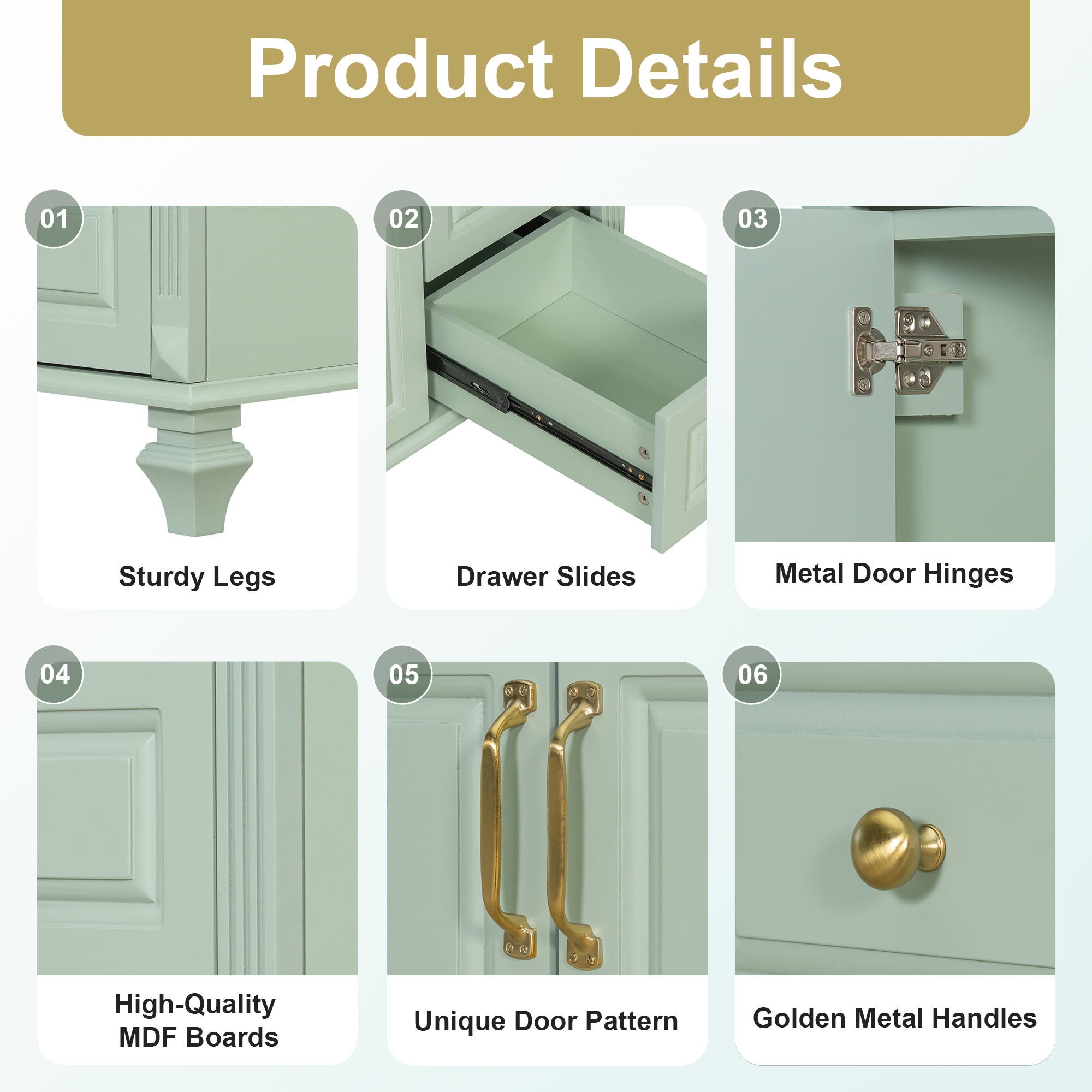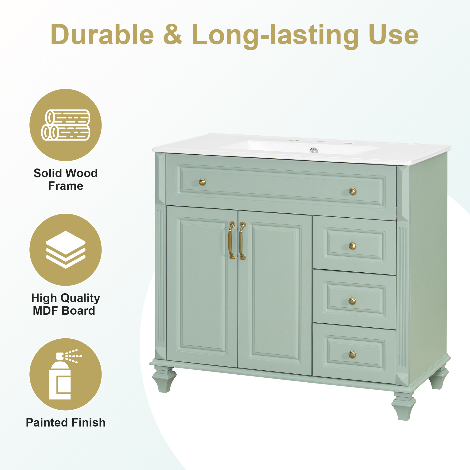 - Elegant & Classic Design: With its timeless green finish and refined golden metal handles, this bathroom vanity adds an elegant and sophisticated touch to any space. The clean lines and subtle detailing deliver a sense of understated luxury, perfectly blending classic charm with modern appeal.