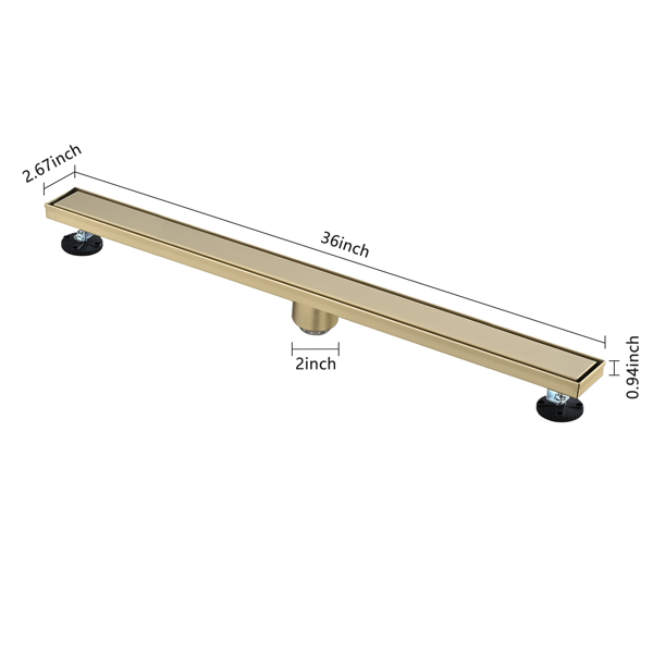 36 Inch Linear Shower Drain With 2-in-1 Flat & Tile Insert Removable Cover, 304 Stainless Steel With Hair Strainer And Leveling Feet, Brushed Gold