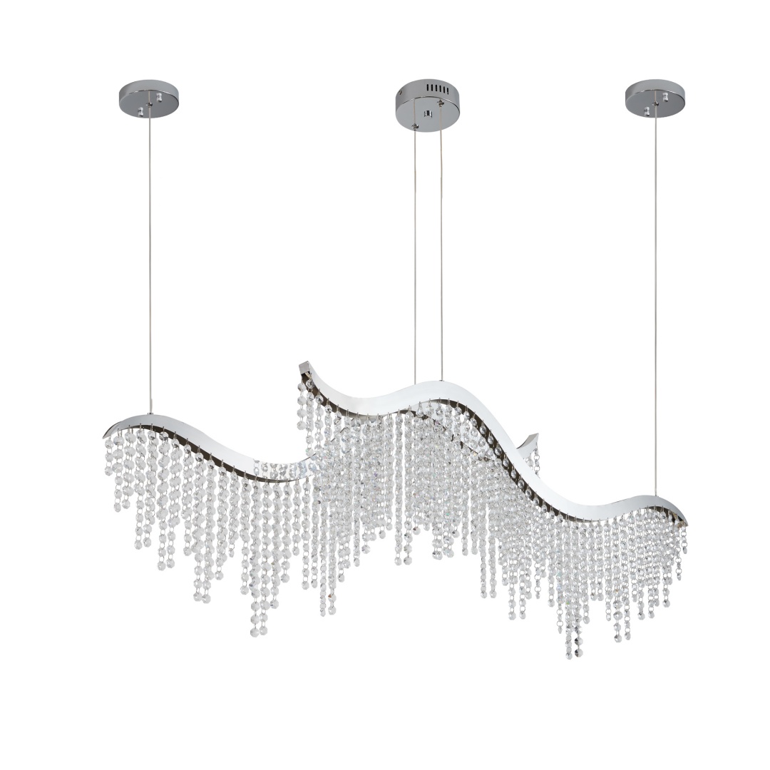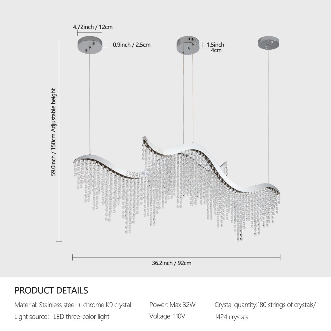 High Quality Noble Design: Polished stainless steel base, K9 Clear Crystal.Wave Shaped Crystal Chandelier,full of design senseDimmable,Adjustable Height,Pendant wire: adjustable 59"Steel and crystal construction with a polished chrome finish