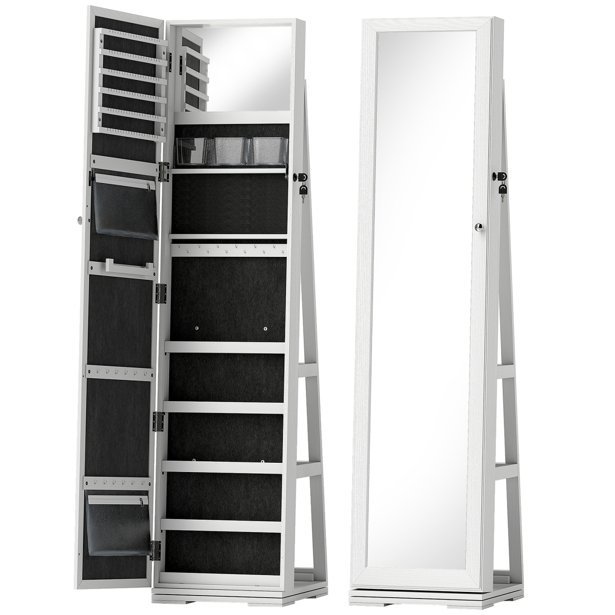 This is a must for the make-up and jewellery fanatics - a place to get ready and keep everything securely stored. The jewelry organiser is formed of a large mirror, inner storage and back storage. Inside the compartment for earrings, bracelets, necklaces, etc., with small inner mirror so you don't have to take everything out once when getting ready. It moves from side-to-side in a full 360° motion so you can see it any angle. Finished with three shelves on the back for extra storage.