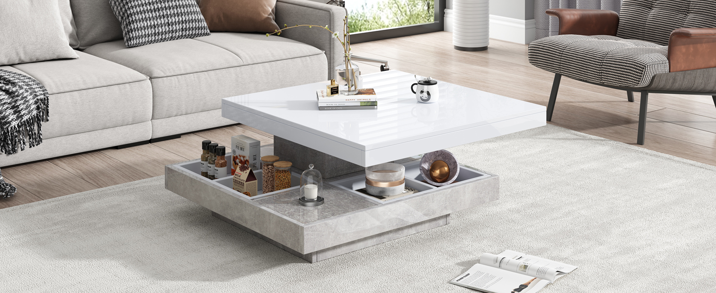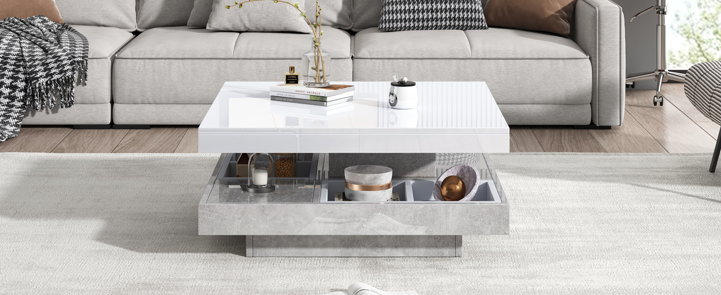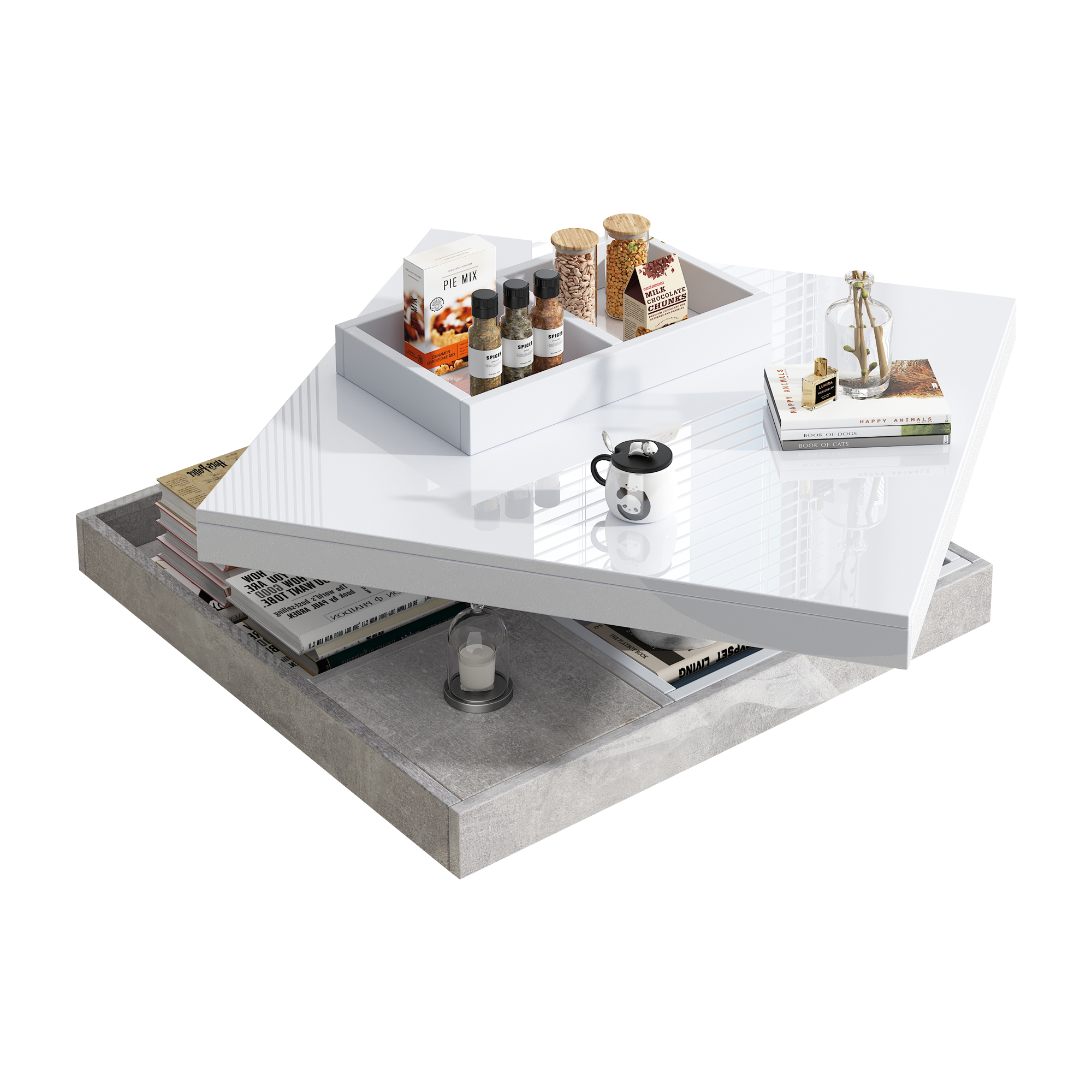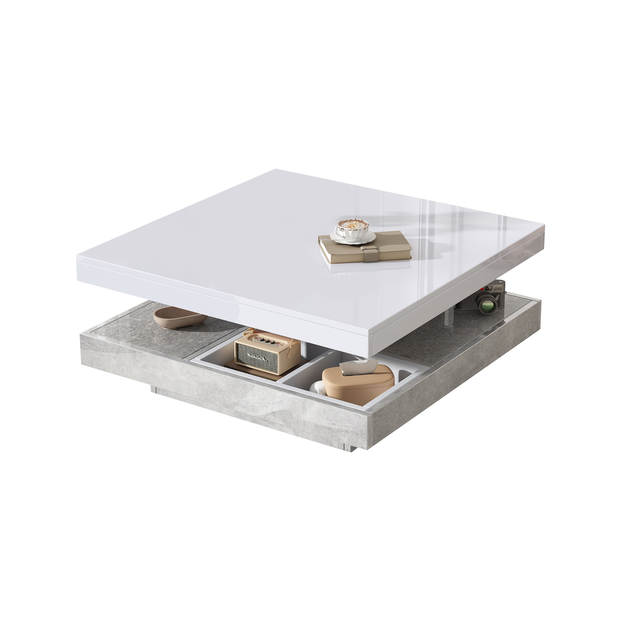 Product Name:360° rotating coffee table, fully functional living room storage table, high-gloss tabletop with storage compartments, white living room tabletop, marble-patterned particleboard