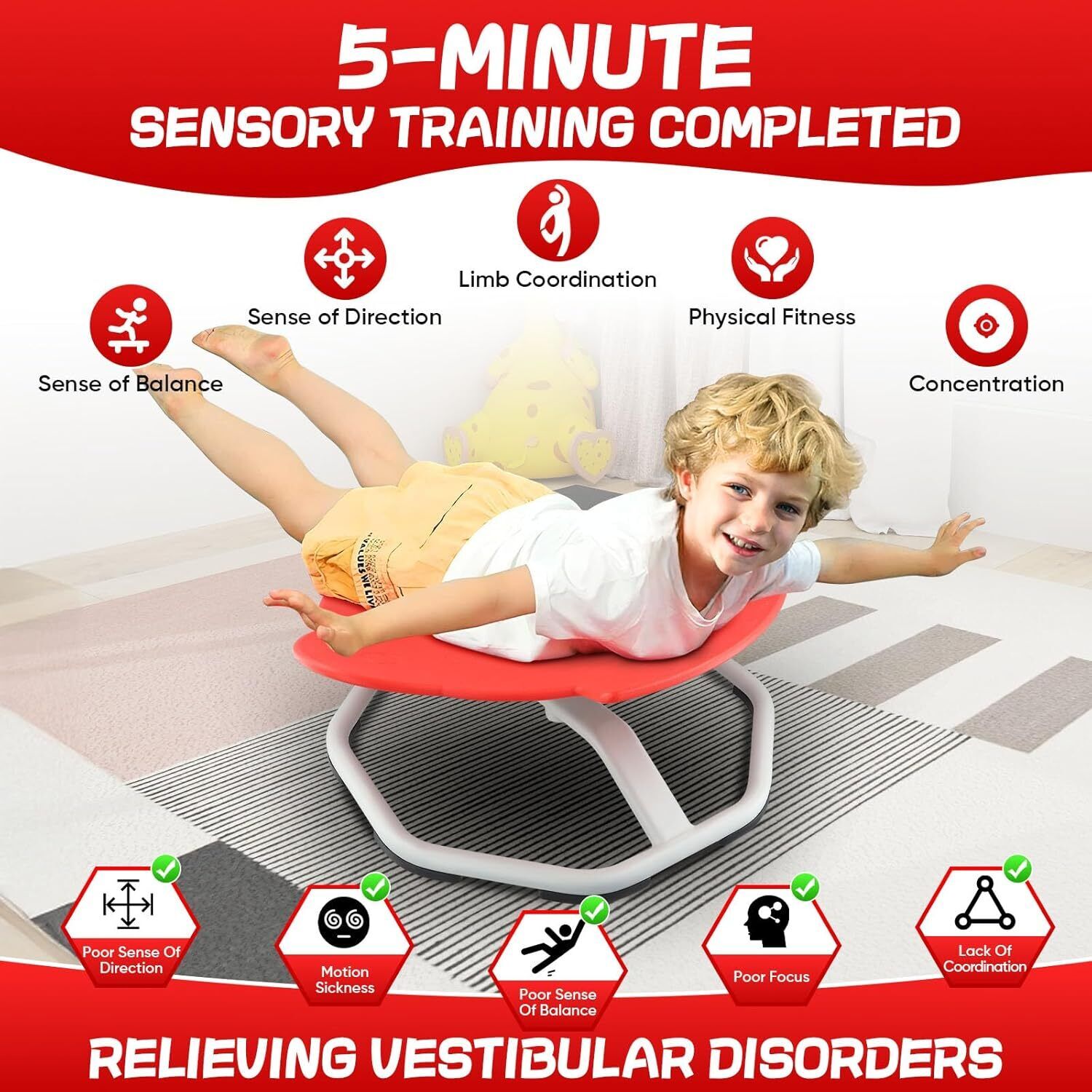 ãSpinning Swivel Chair For Sensory TherapyãKids won't be able to keep the smiles away when they sit onto kid's swivel chair and start spinning. Spinning helps the brain sort sensory impressions and stimulates the vestibular system, as kids turn 'round and 'round, they'll be improving coordination, balance and core strength, too.