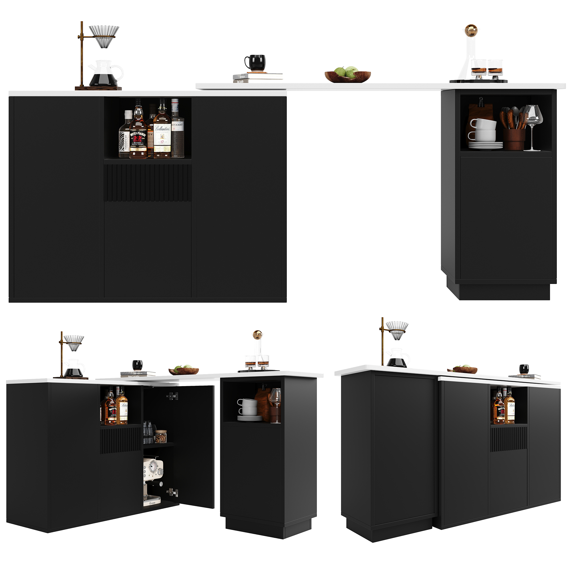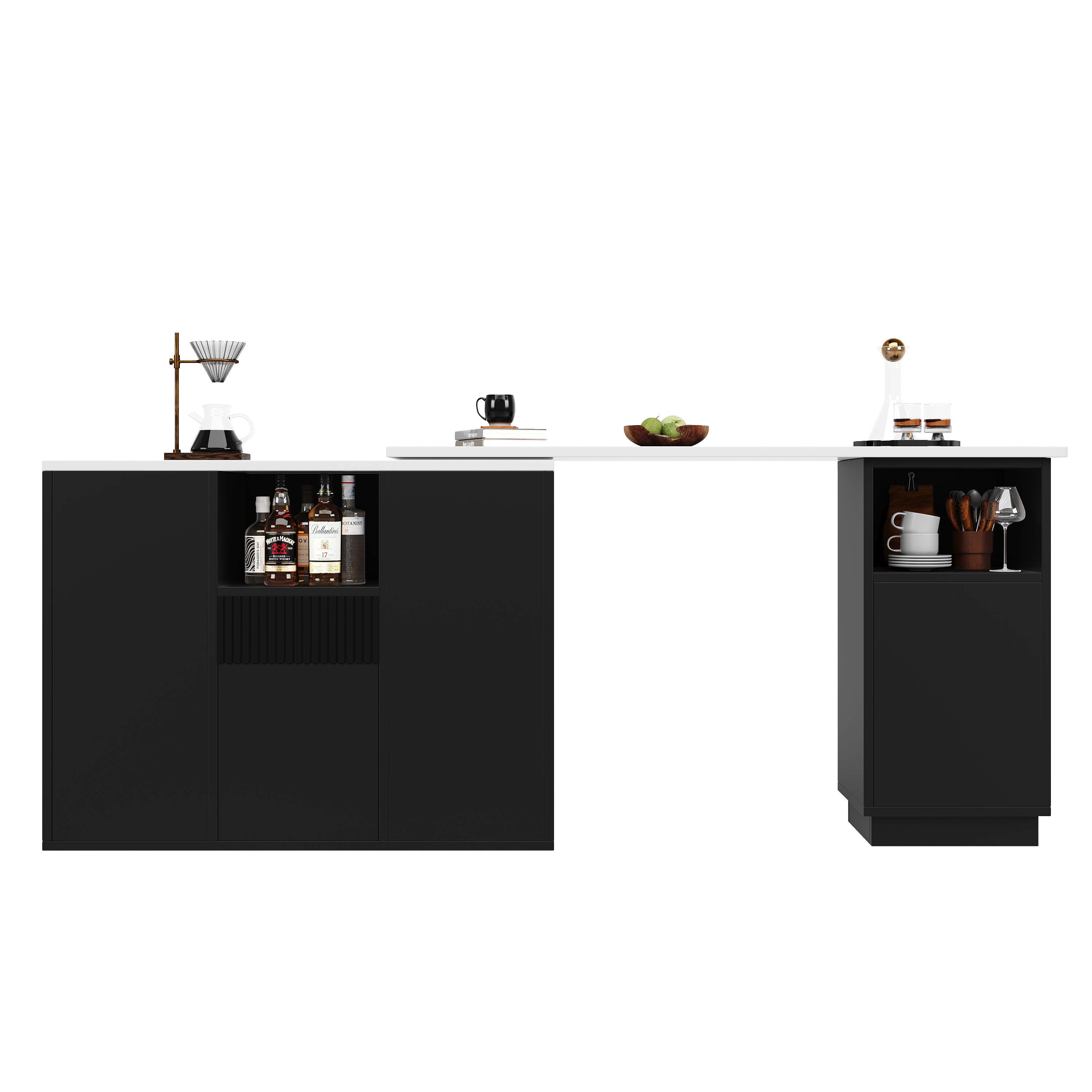 Product Name:360° swivelling bar table (main body 198.5 x 30 x 75 cm), modern and sleek design, with open storage space and marble worktop, suitable for kitchen, living room and dining room, black