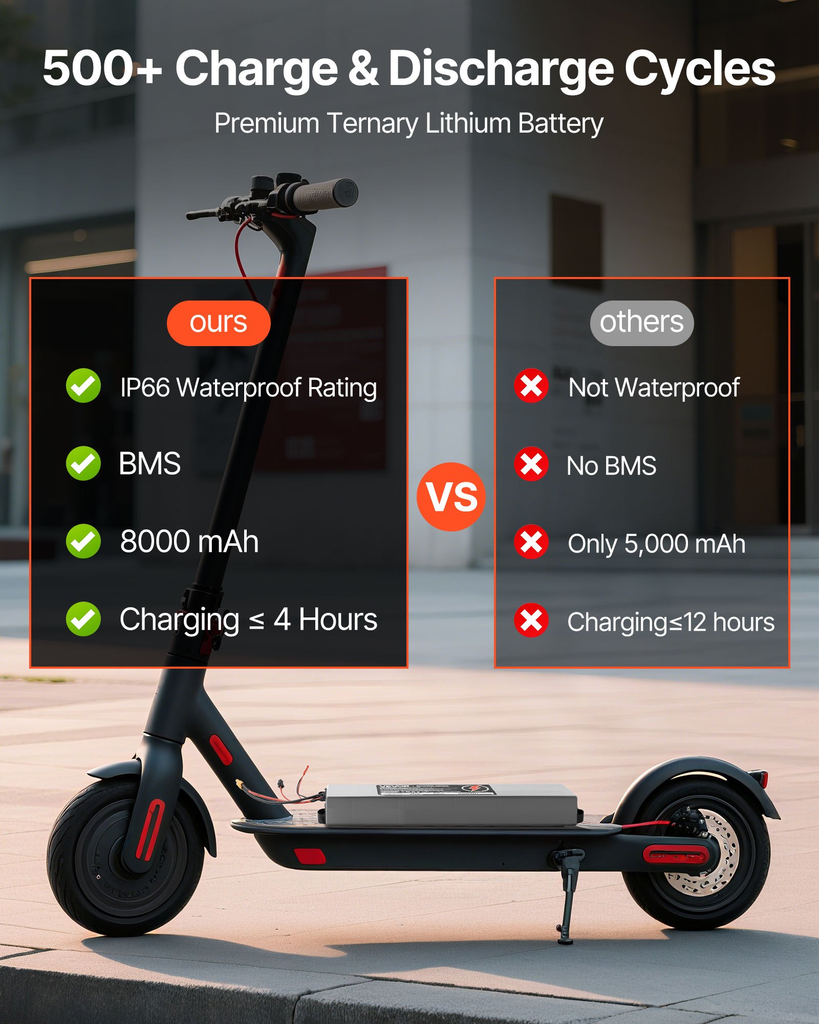 Durable Lithium Battery: Designed with an IP66 waterproof PVC case, this electric scooter lithium battery operates reliably in temperatures from -14°F to 158°F (-10 to 70℃). It outlasts lead-acid batteries and stands up to city commutes or outdoor rides