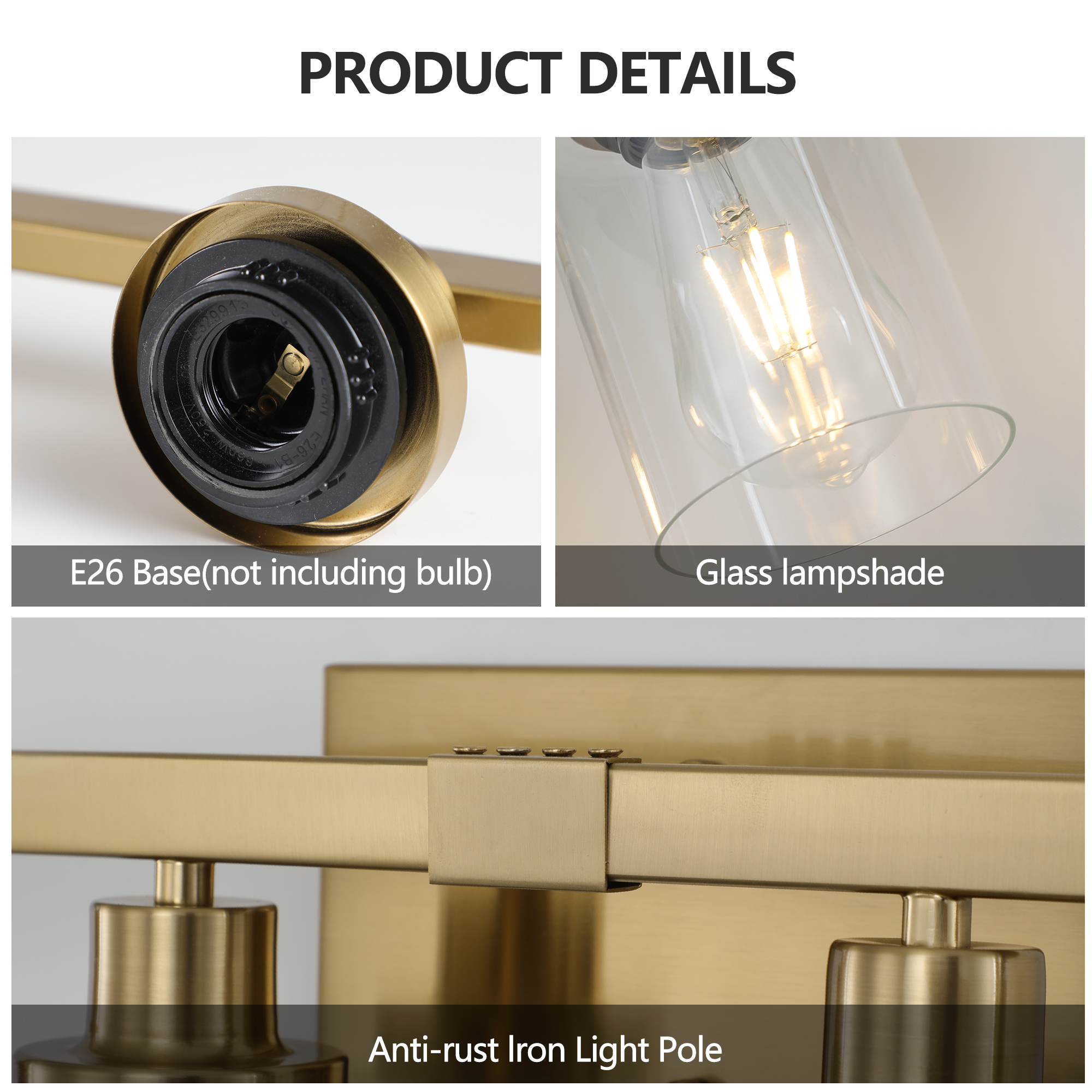 Modern elegant design: Golden iron frame with a clear glass lampshade, is both modern and classic, enhancing the overall beauty of the bathroom and vanity.Durable materials: The use of high-quality iron metal chassis, durable, corrosion resistance, to ensure the long-term use of lamps.Suitable for a variety of light bulbs: support LED light bulbs(E26),energy saving and environmental protection, users can choose the right light bulb according to personal needs.Easy installation: Simple design, equipped with installation accessories, suitable for various installation needs, so that users can easily complete the installation.