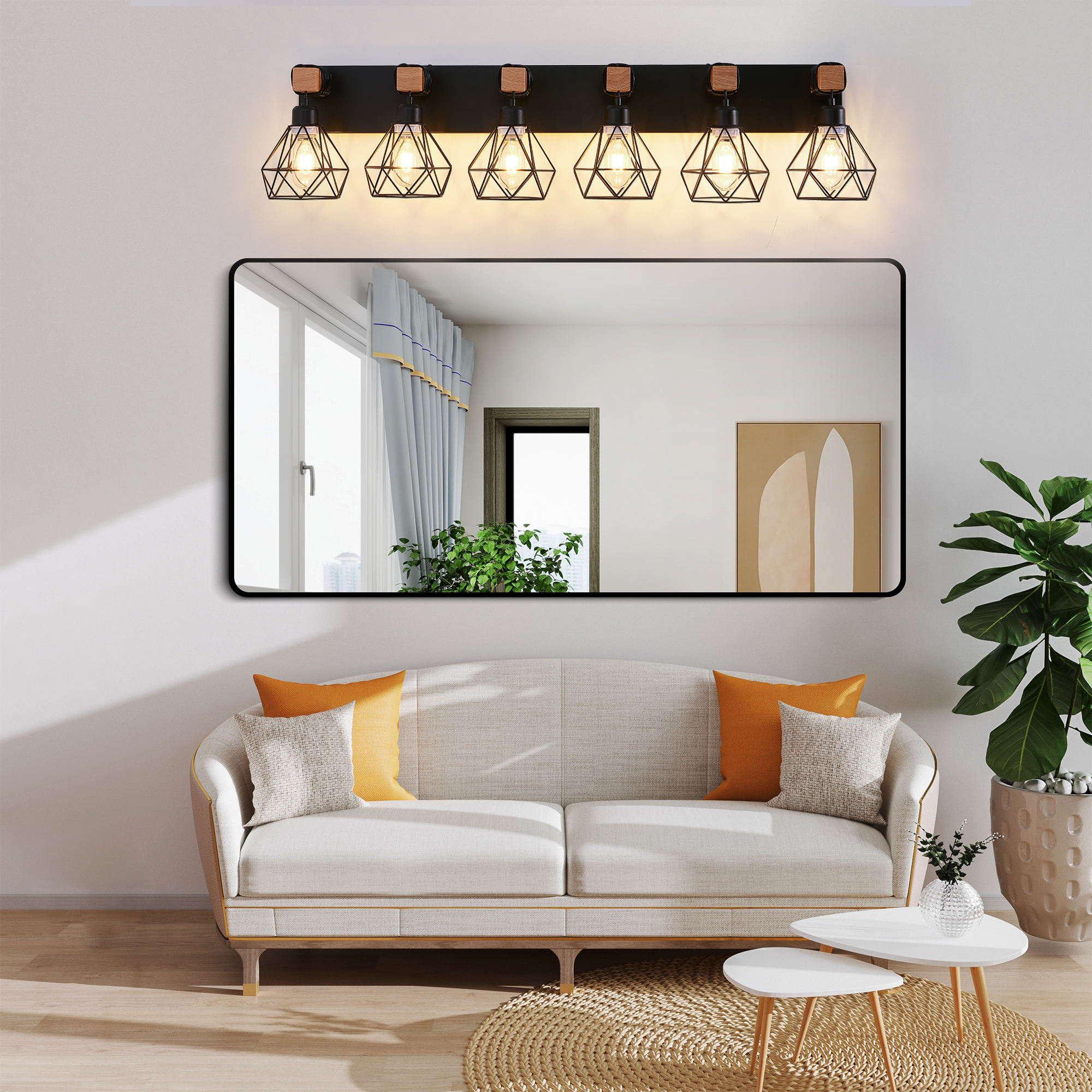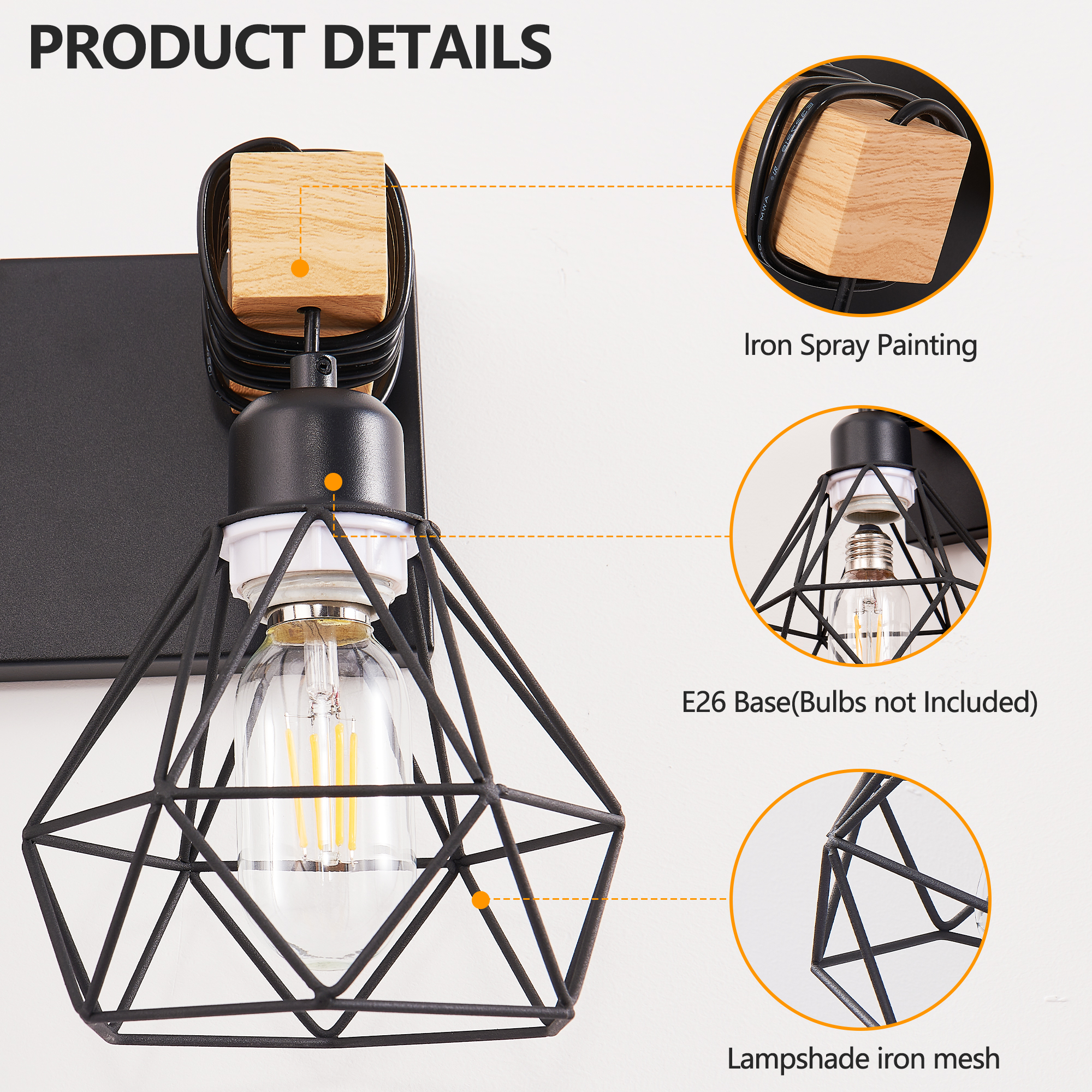 Modern geometric cage lampshade design: The unique geometric cage lampshade combines a black metal frame and solid wood decoration to create a fashionable and industrial style visual effect, which is both modern and warm.High quality materials and durability: The combination of black metal and solid wood elements not only ensures the stability and durability of the lighting fixtures, but also presents a natural and rustic beauty, suitable for various home styles.Multi functional lighting solution: suitable for different spaces such as bathrooms, bedrooms, living rooms, and corridors, it is very suitable for lighting in front of makeup mirrors or any place that requires functionality and decoration.Easy to install and use: Whether it's DIY home installation or professional operation, it can be easily completed. The lighting fixtures come with clear installation instructions, saving time and effort.