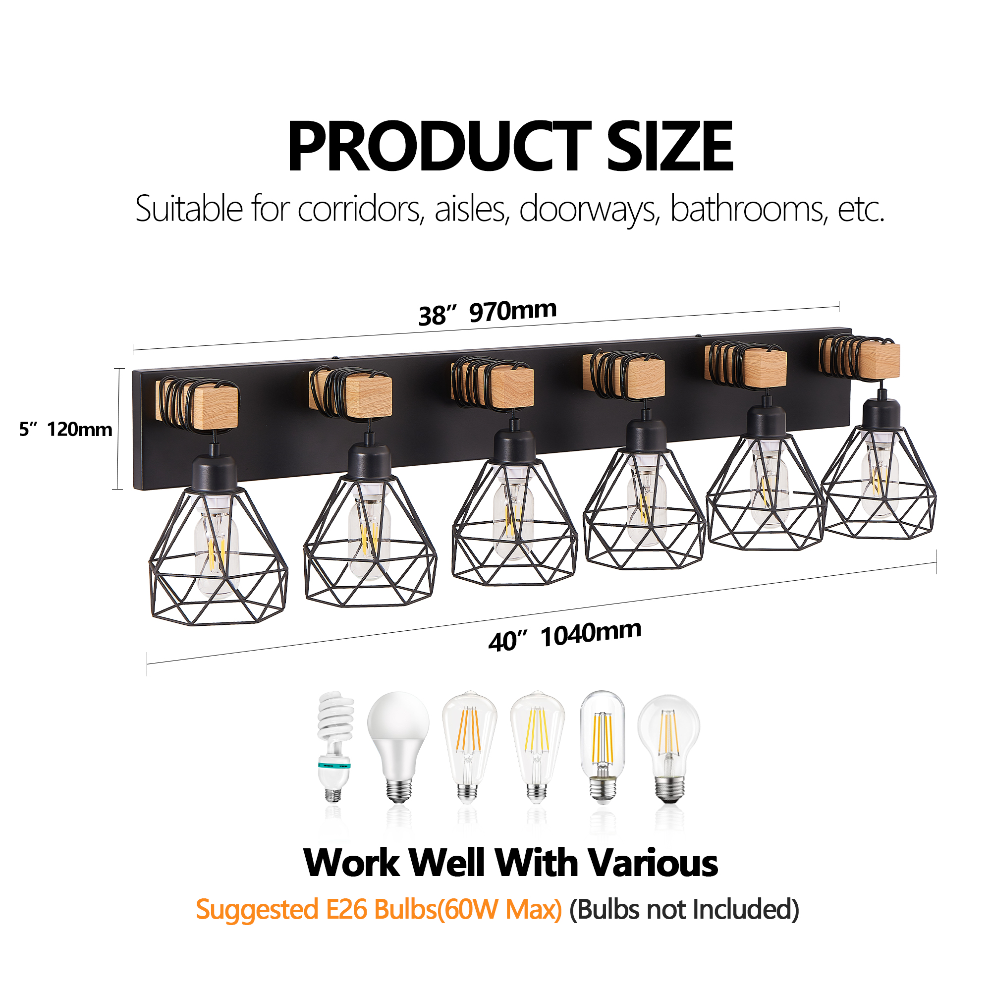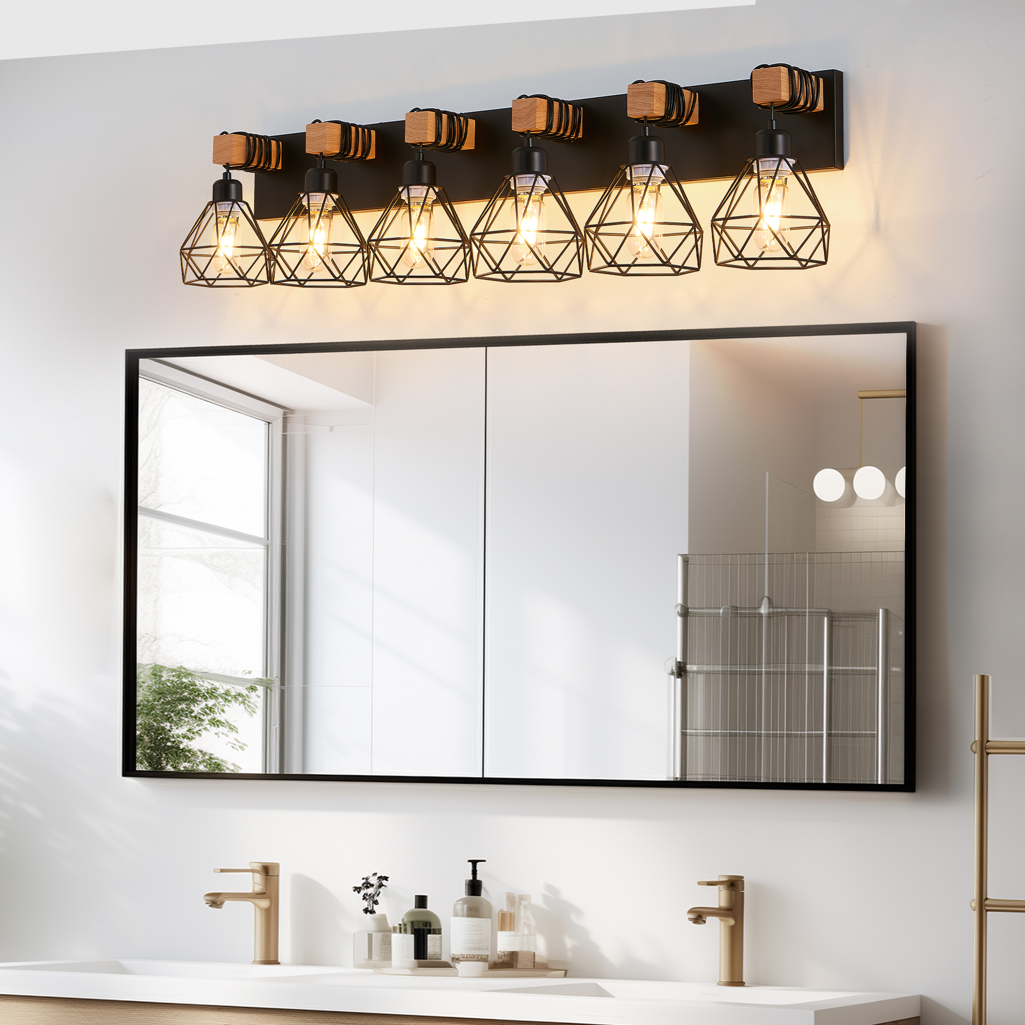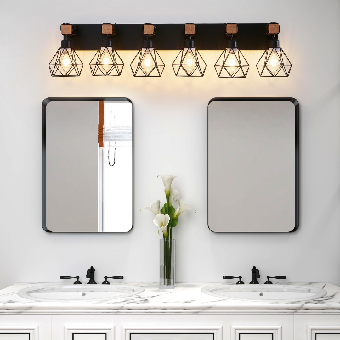 38 Modern Geometric 6-Light Vanity Light Fixture With Black Metal, Wooden Accents And Cage Lampshade For Bathroom, Bedroom, Or Living Room Bulb Not Included