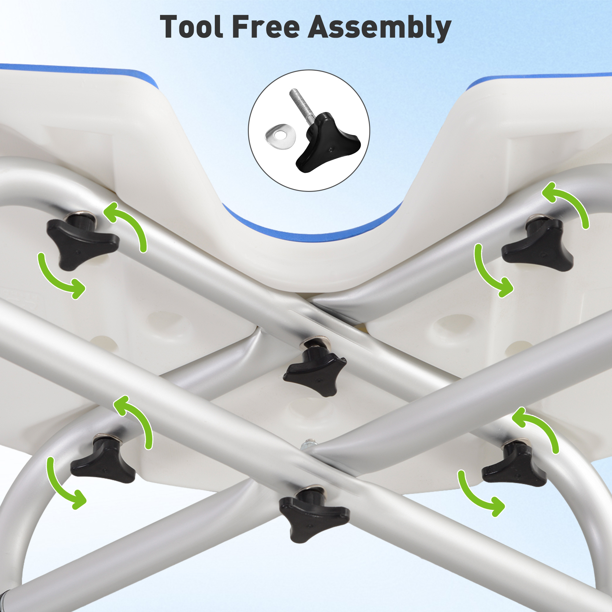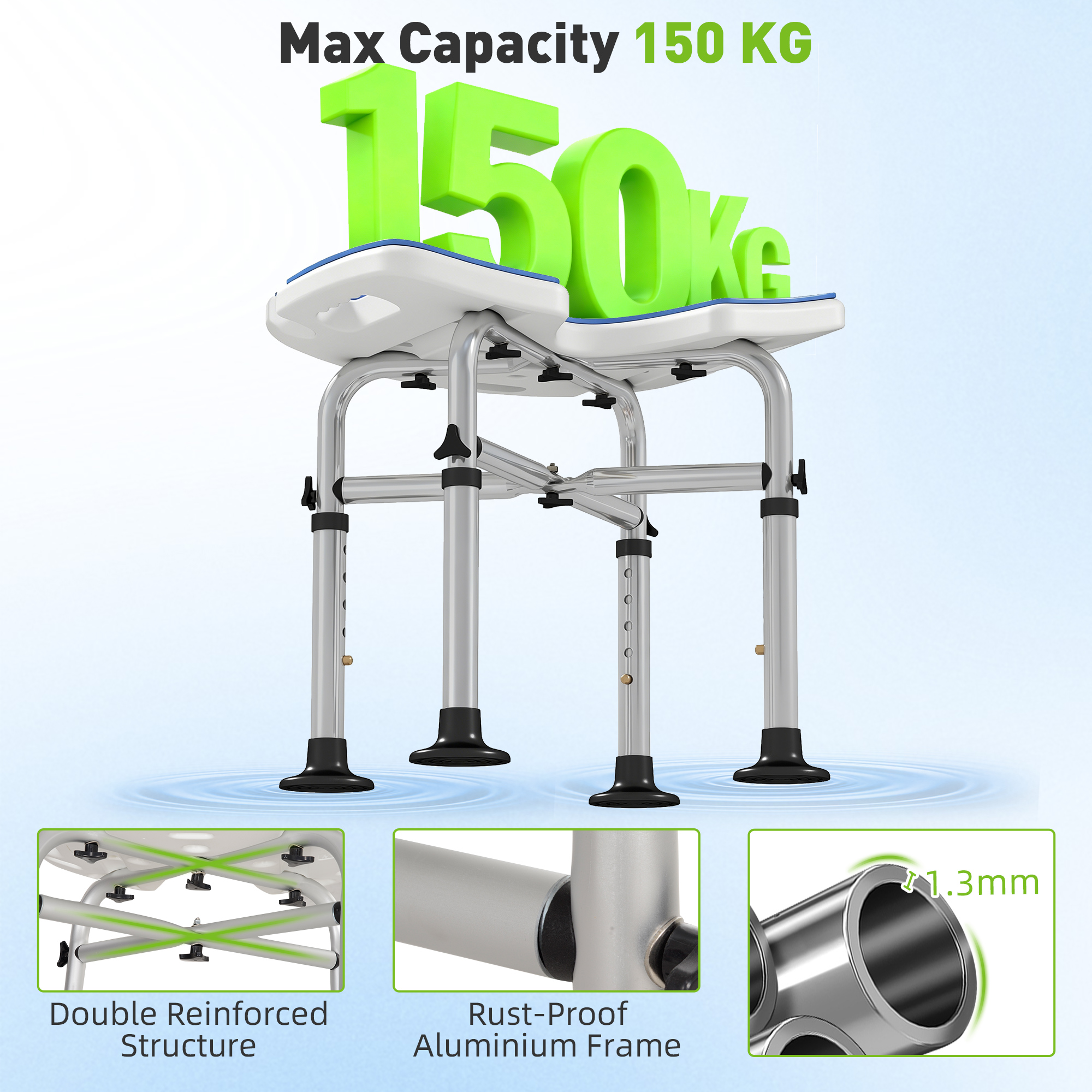 • Aluminium frame: a strong and supportive core for shower chair