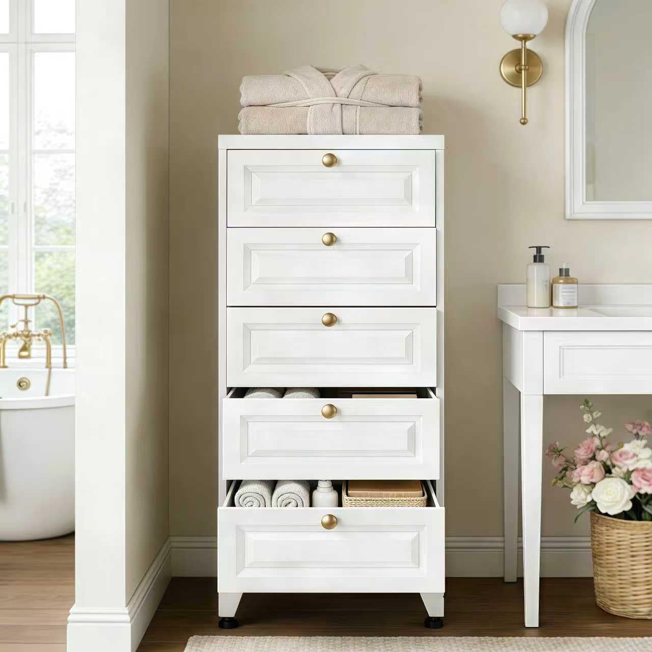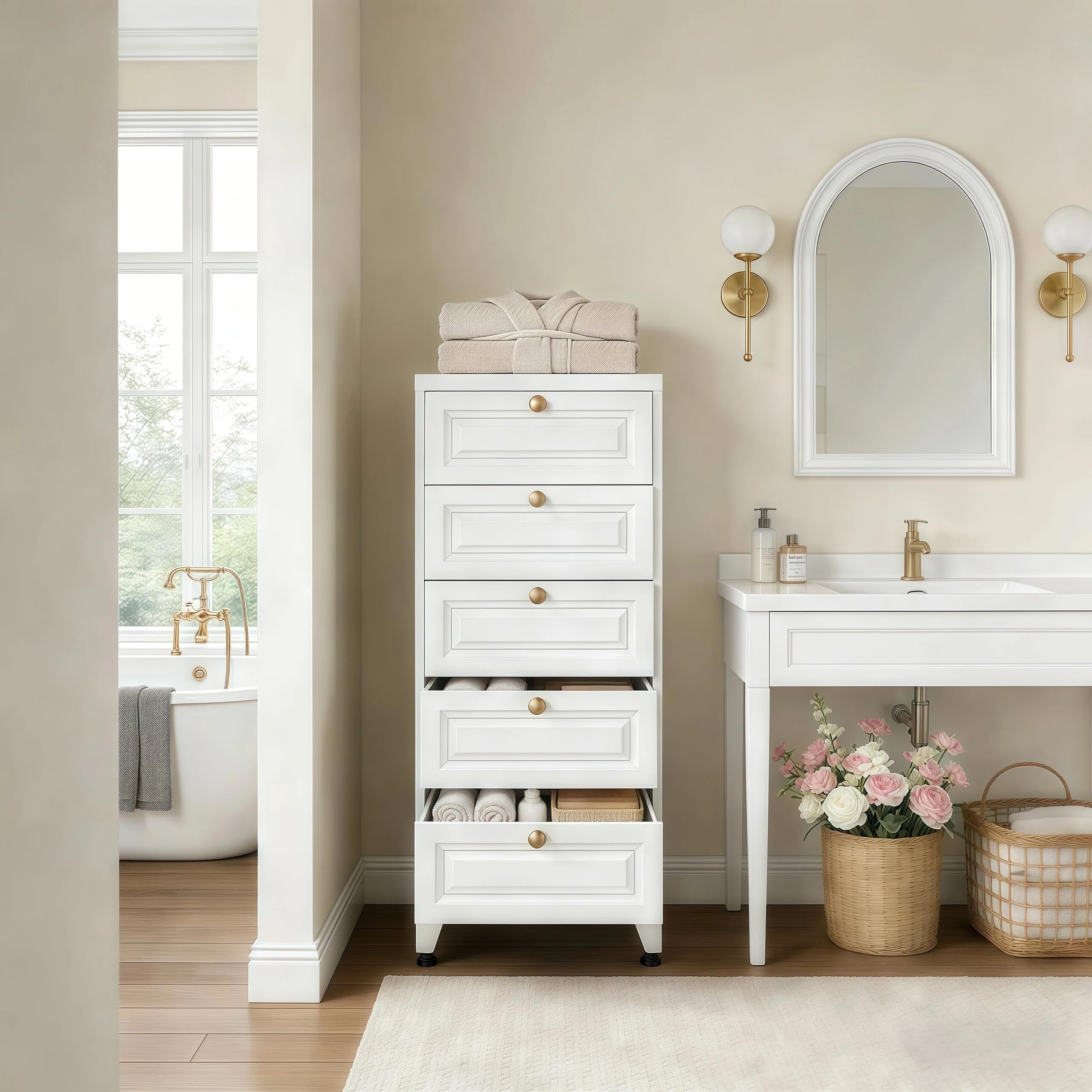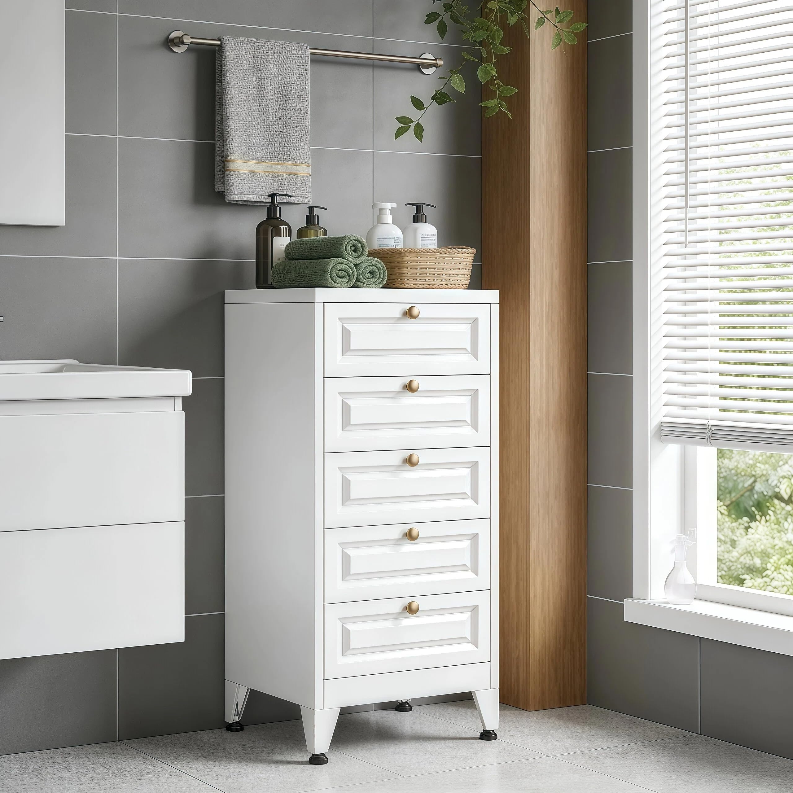 39.37inch H Metal Bathroom Storage Cabinet With 5 Drawers,Freestanding Cabinet For Bathroom,Bathroom Floor Cabinet For Home,Assembly Required,White