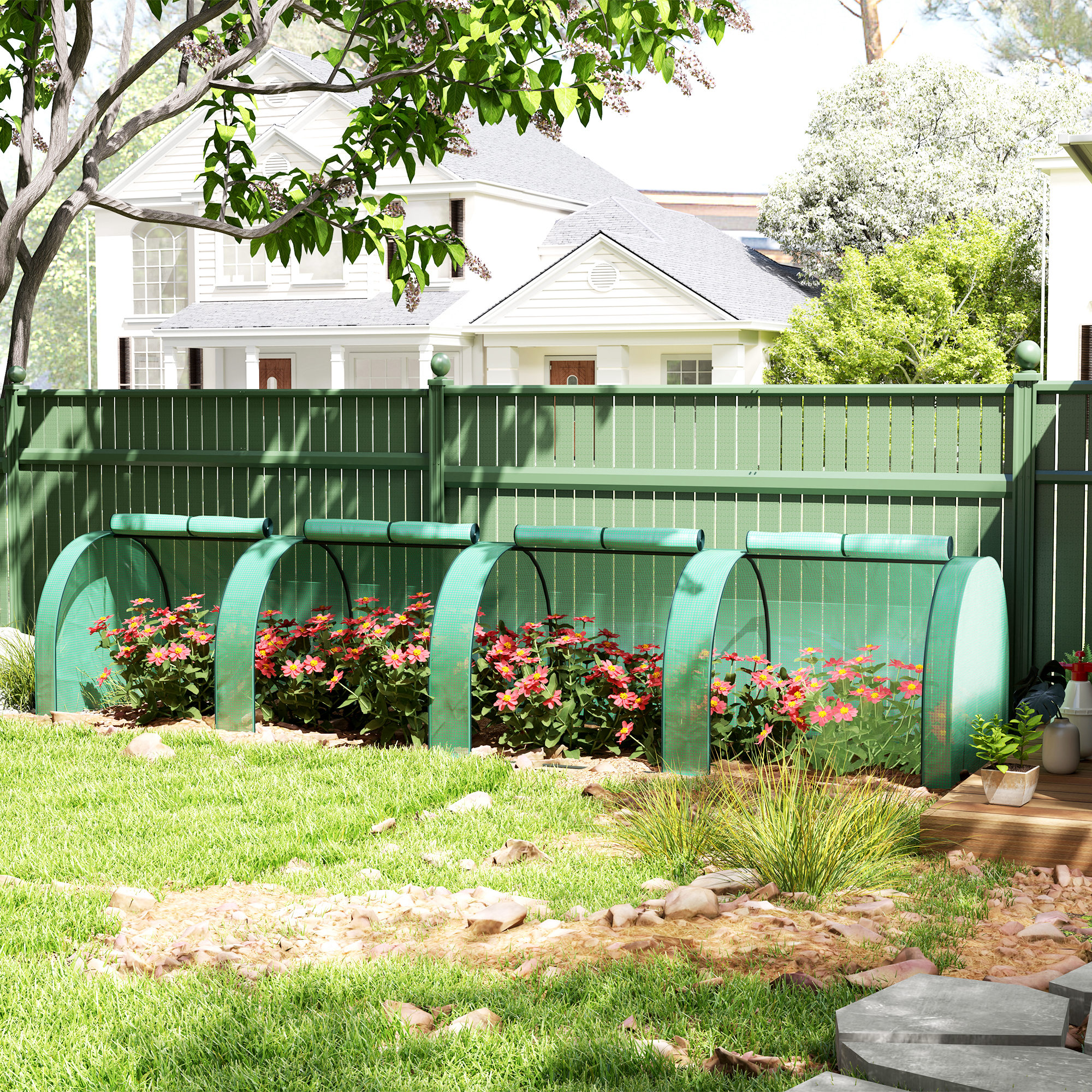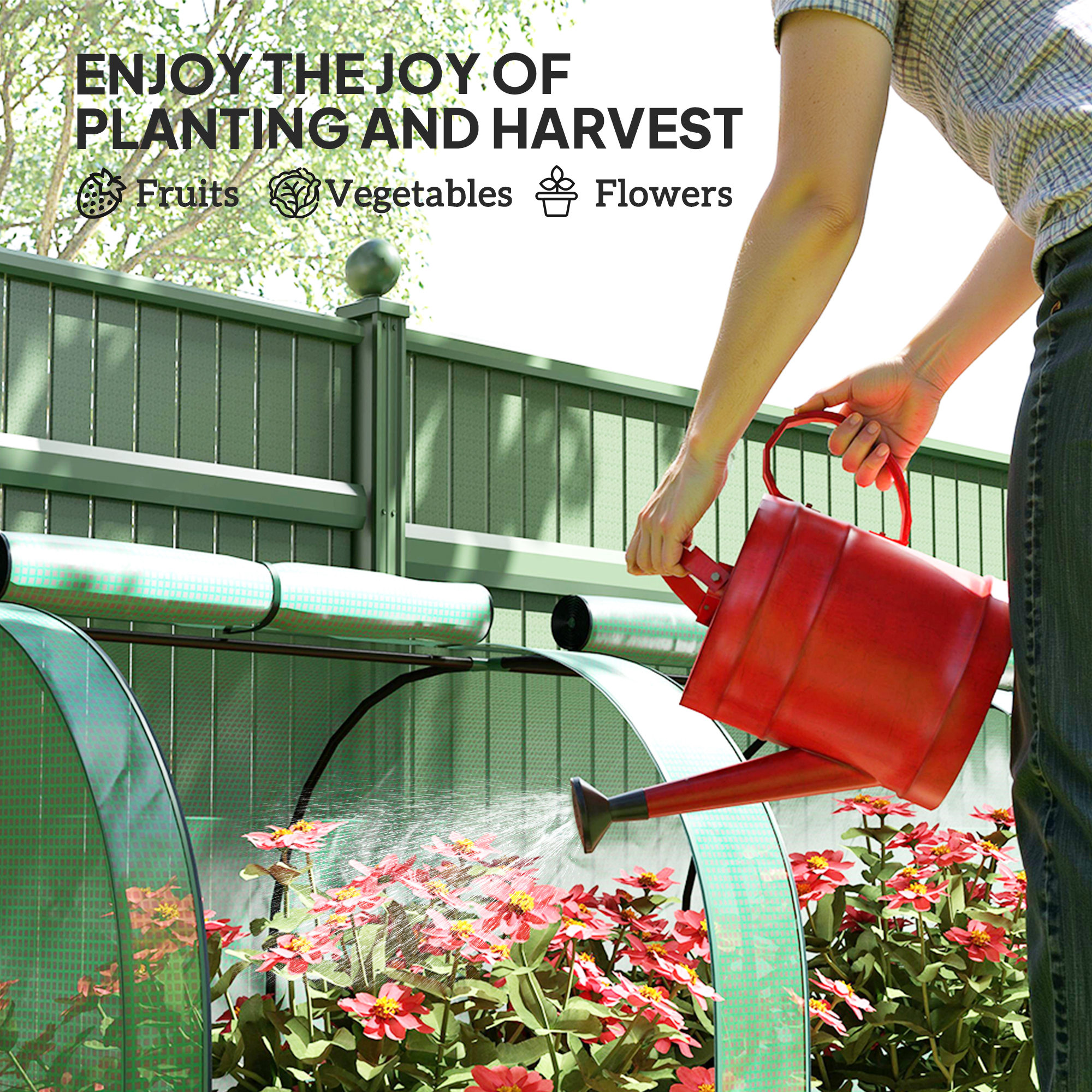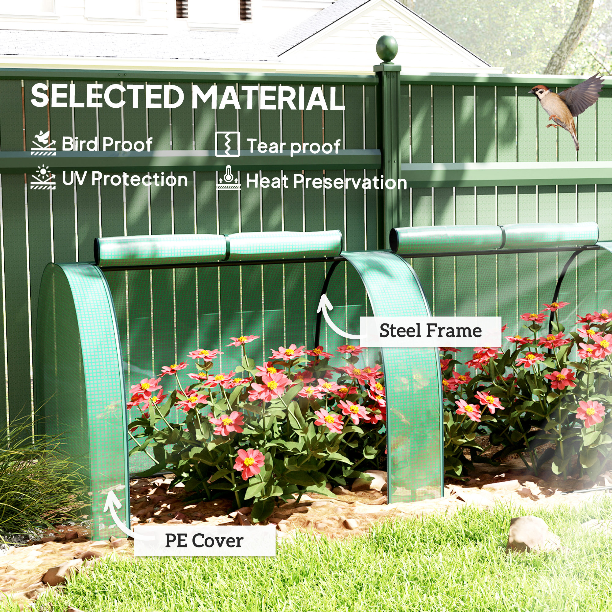 Grow plants, vegetables, fruit and flowers safely all year round with this long tunnel greenhouse. The powder coated steel frame ensures a tough core, fitted with a plastic cover to protect plants from the weather and cold; also allows sunlight through to nourish them. It's complete with zipped doors, providing you easy access and ventilation throughout. Lightweight enough to be moved around, this greenhouse is perfect for gardens, patios, balconies.