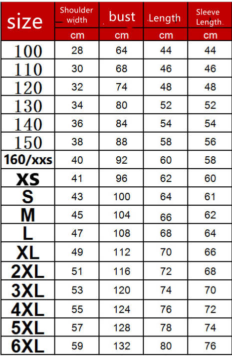 Size: XXS, XS, S, M, L, XL, XXL, 3XL, 4XL, 5XL, 6XL, 100, 110, 120, 130, 140, 150, 160