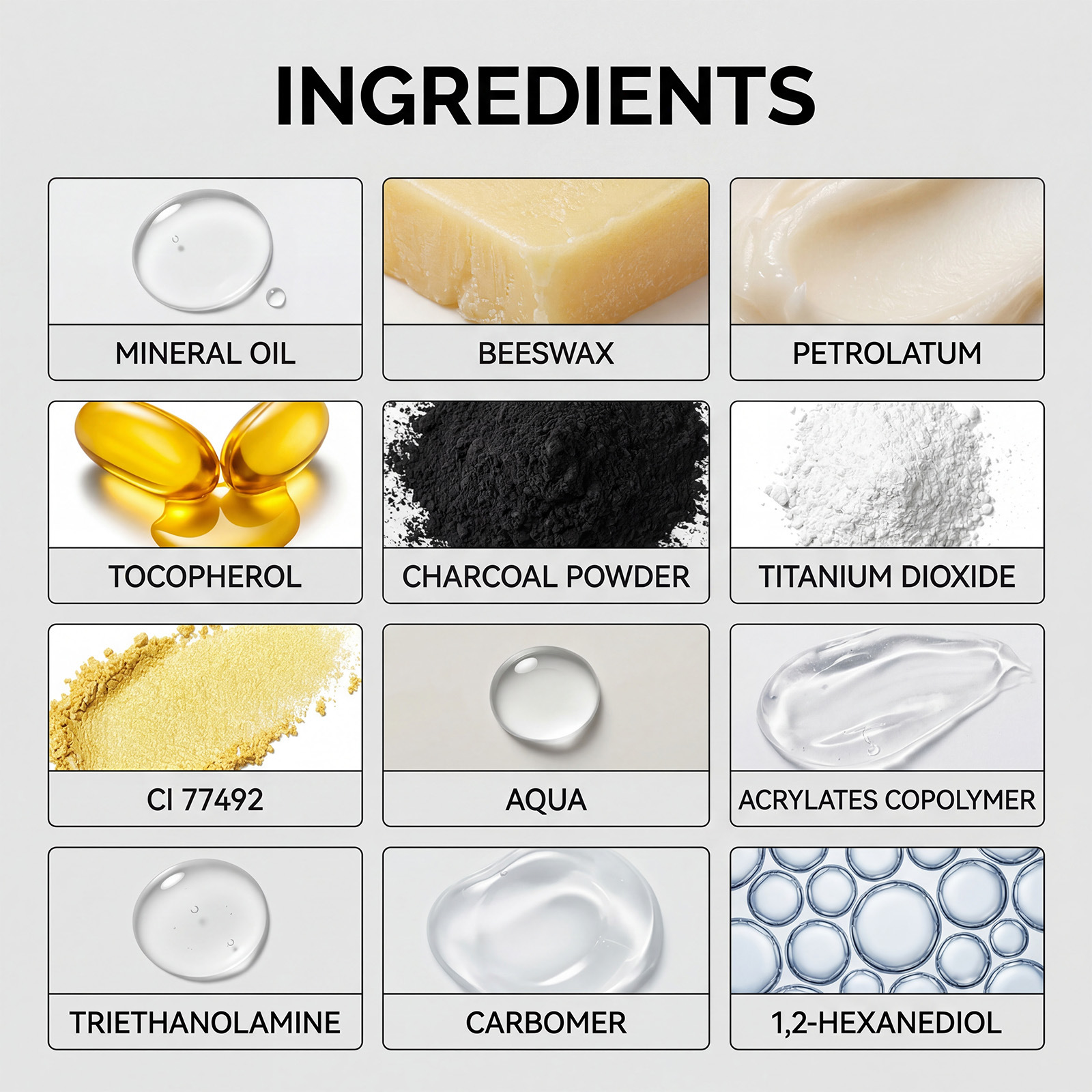 Eyebrow Setting Gel: Water, Acrylates Copolymer, Triethanolamine, Carbomer, 1,2-Hexanediol