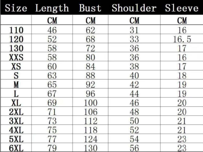 Size: XXS, XS, S, M, L, XL, XXL, XXXL, XXXXL