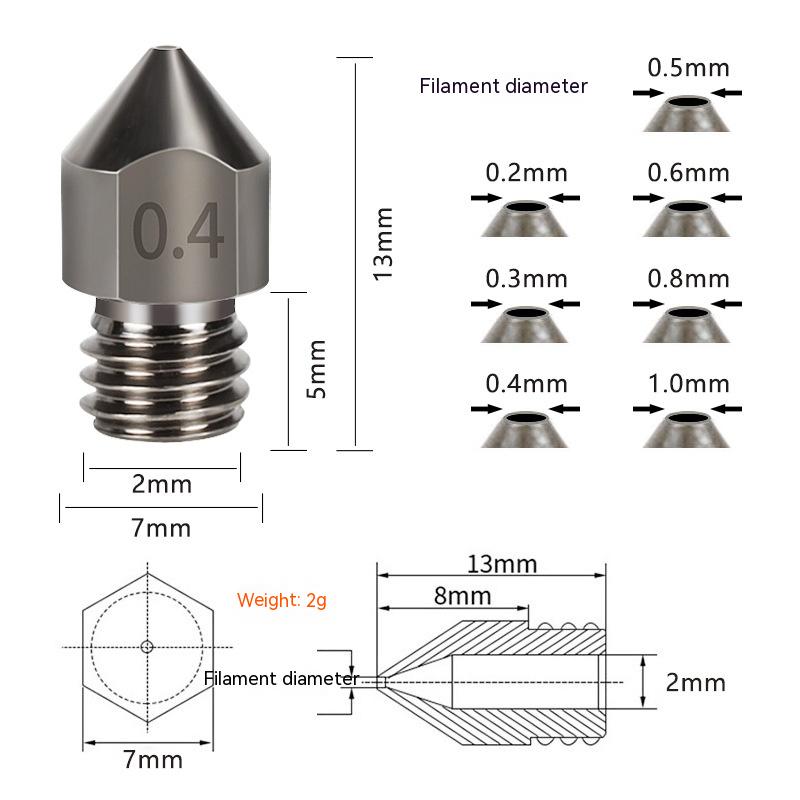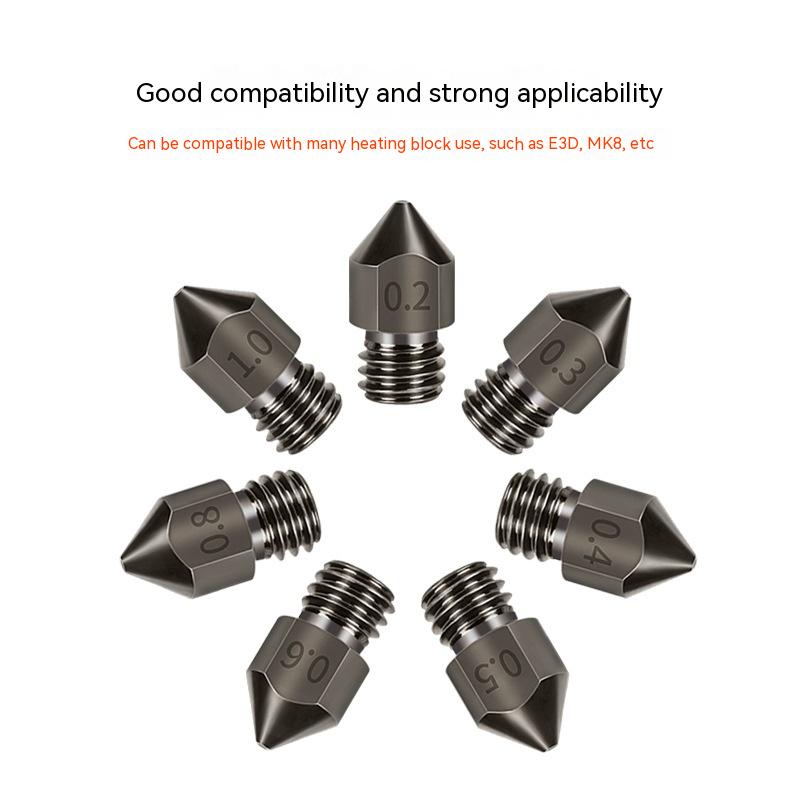 Nozzle characteristics: The use of high-quality thermoforming processing, the use of high temperature carburizing and hardening treatment, with ultra-wear-resistant, heat resistance, with high hardness and high toughness two characteristics, long service life, compatible with most of the high temperature printing supplies on the market