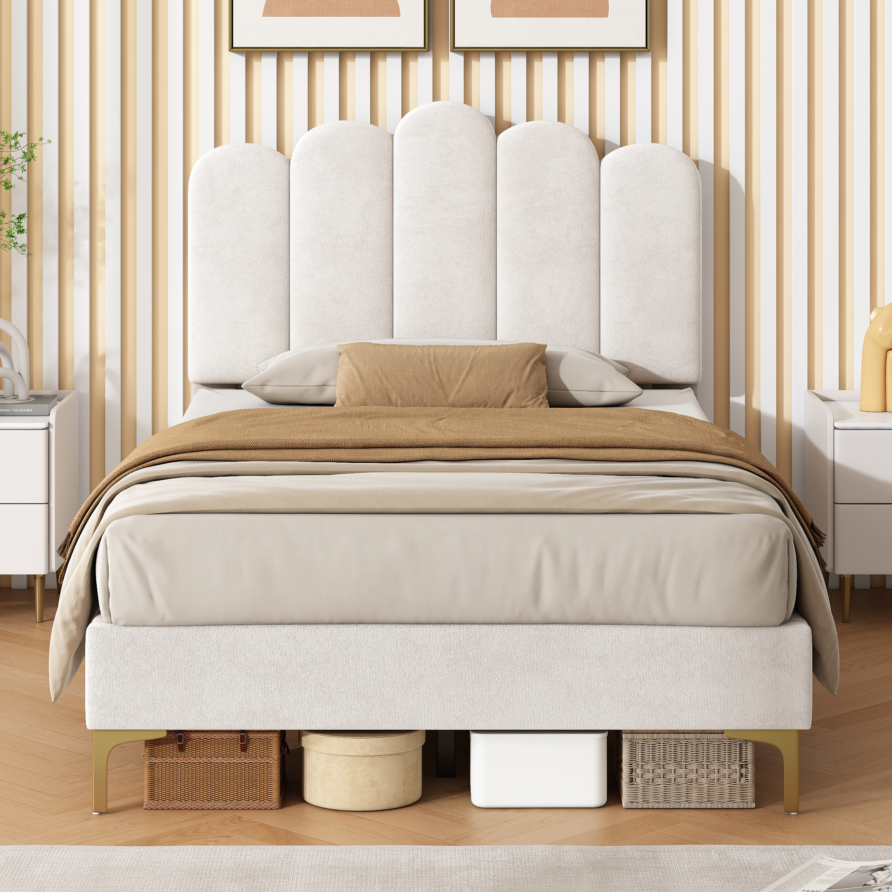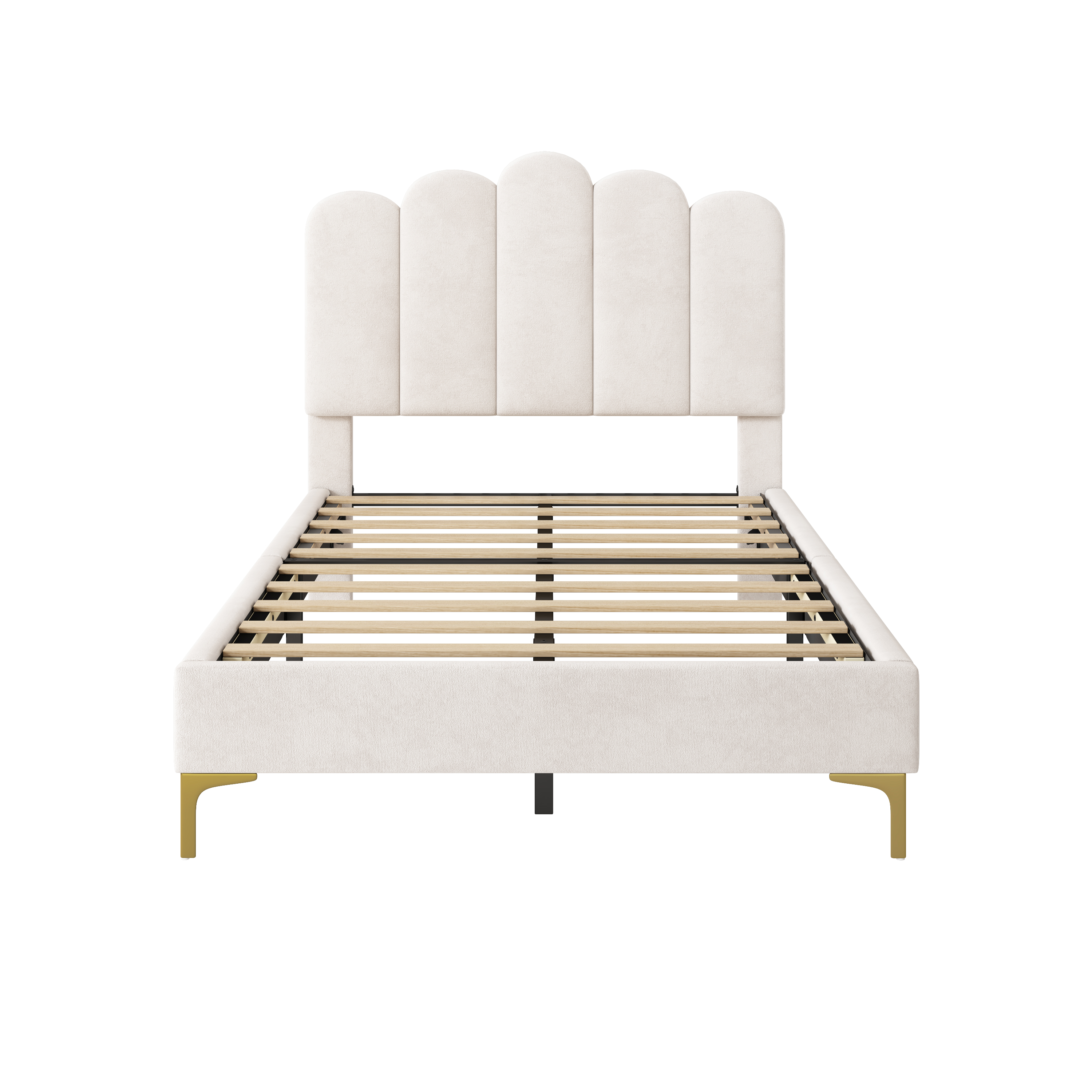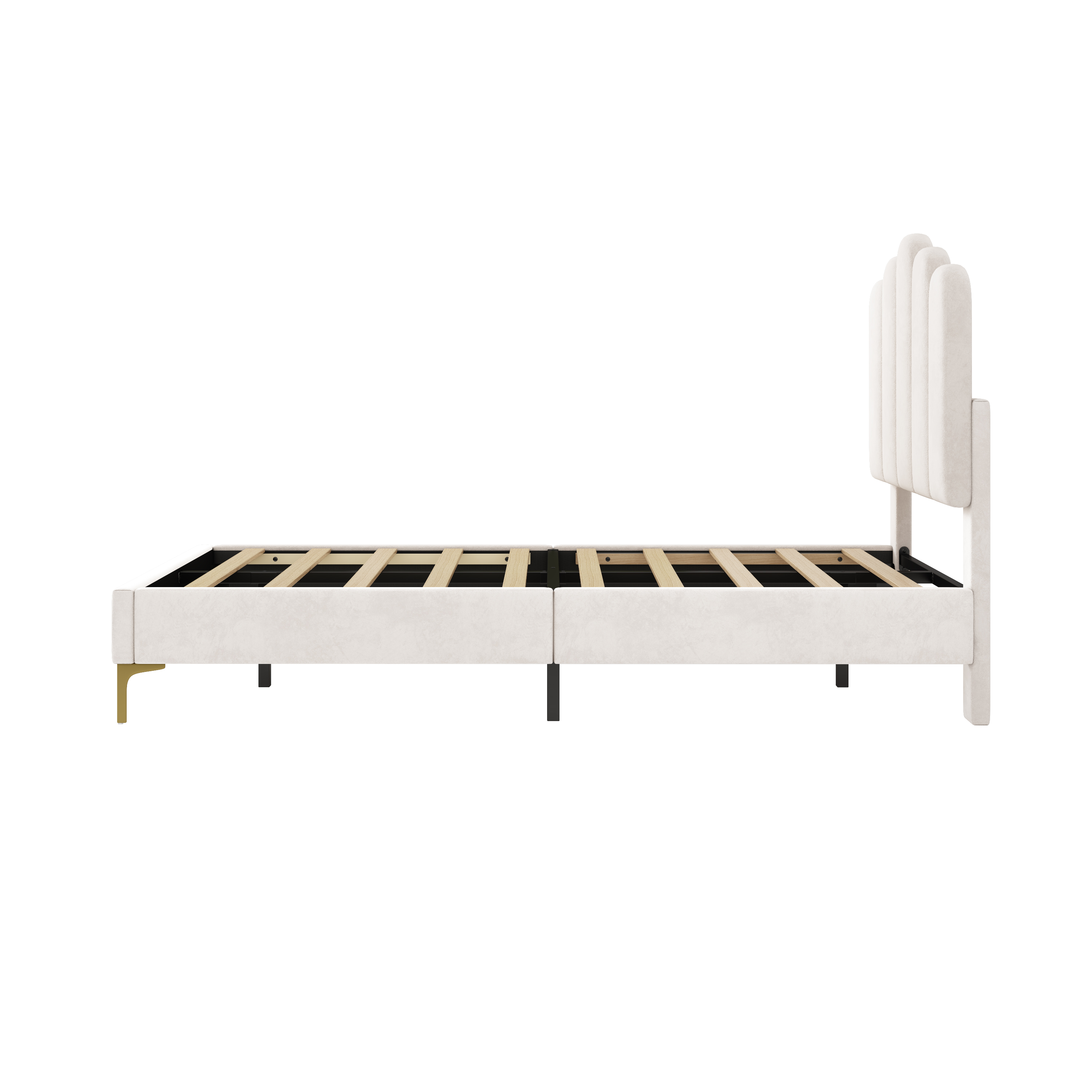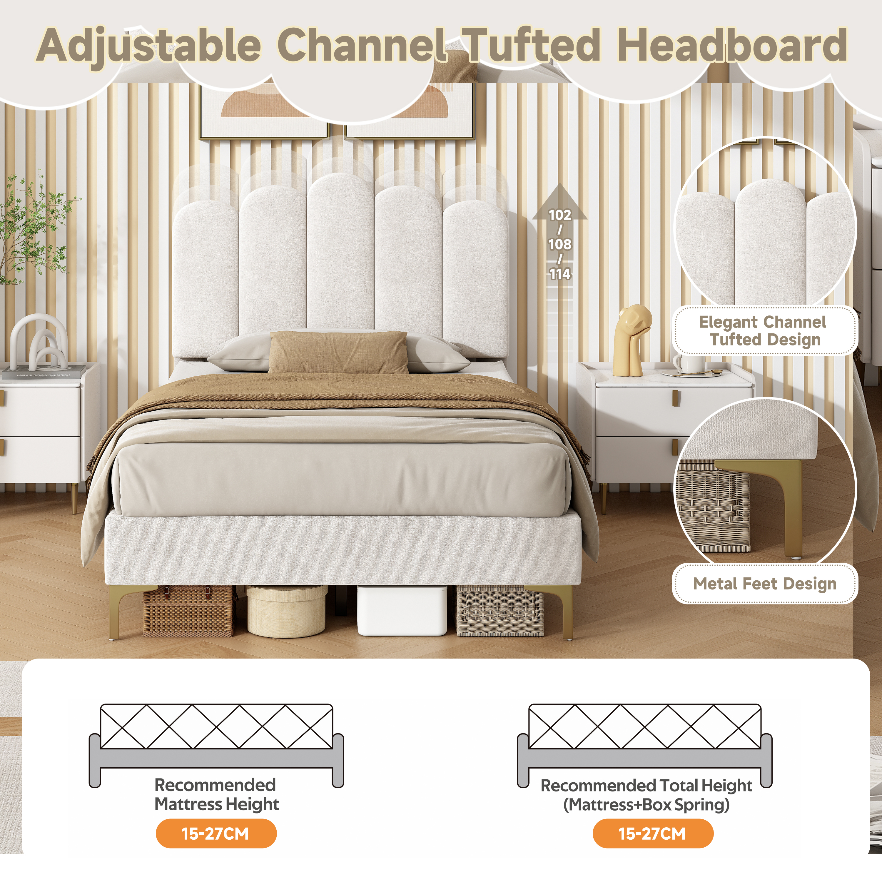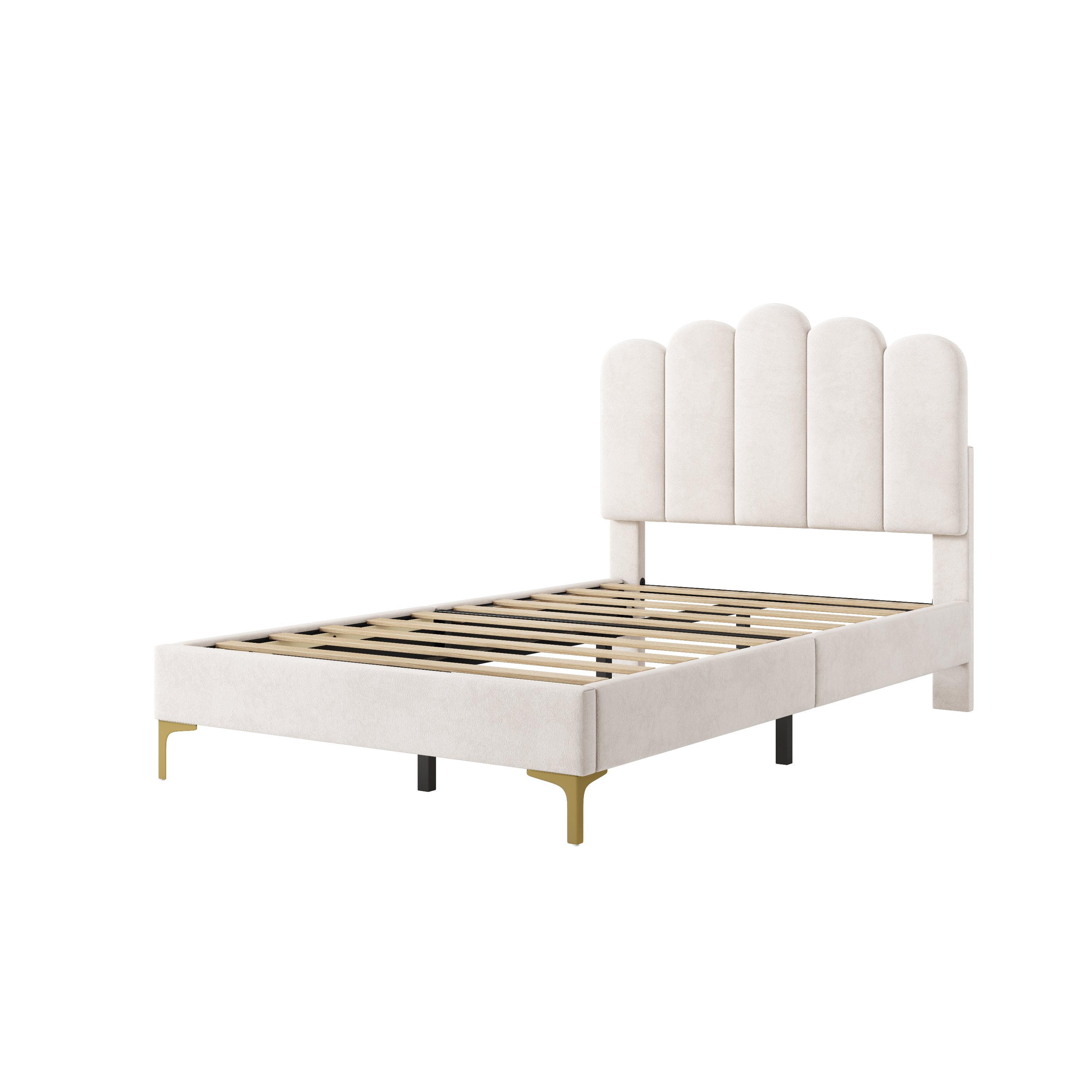 Product Name:3ft Single Premium Velvet Upholstered Bed Frame with Scalloped Channel Tufted Design, Height Adjustable Headboard & Gold Metal Feet, Under-bed Storage Space, No Box Spring Needed, Beige (No Mattress)