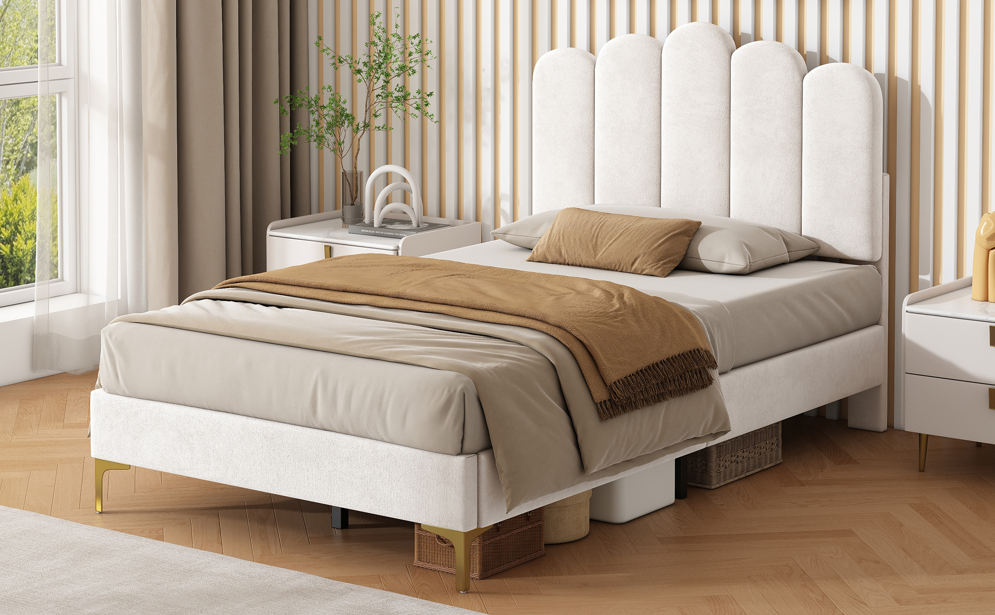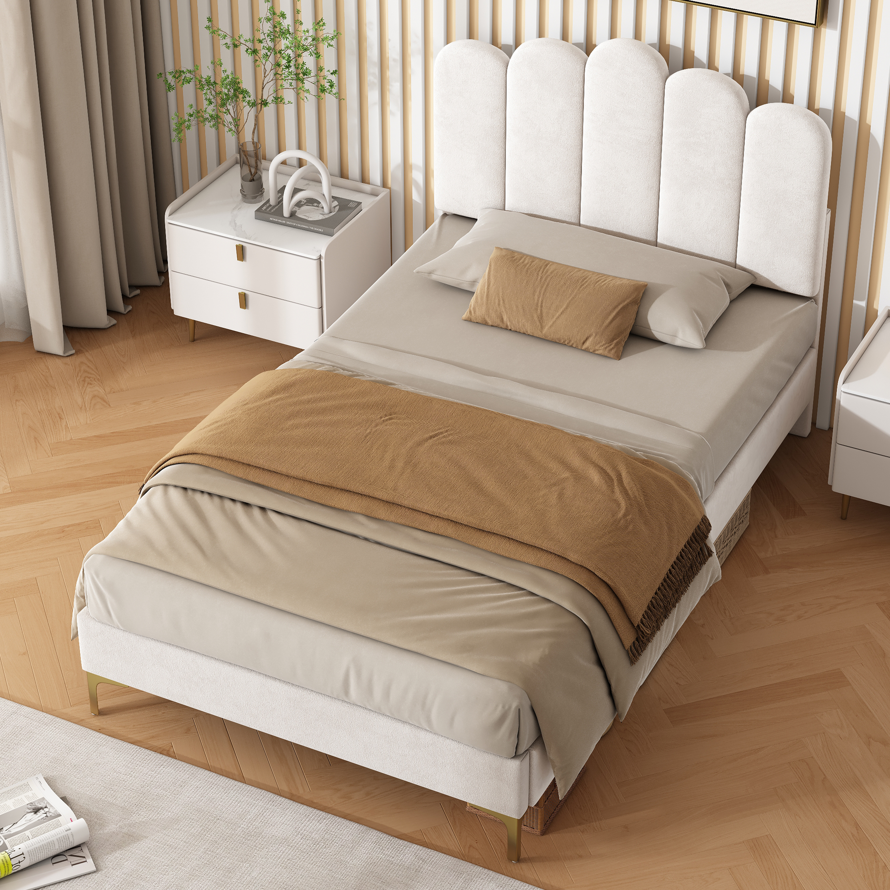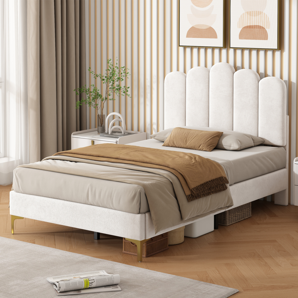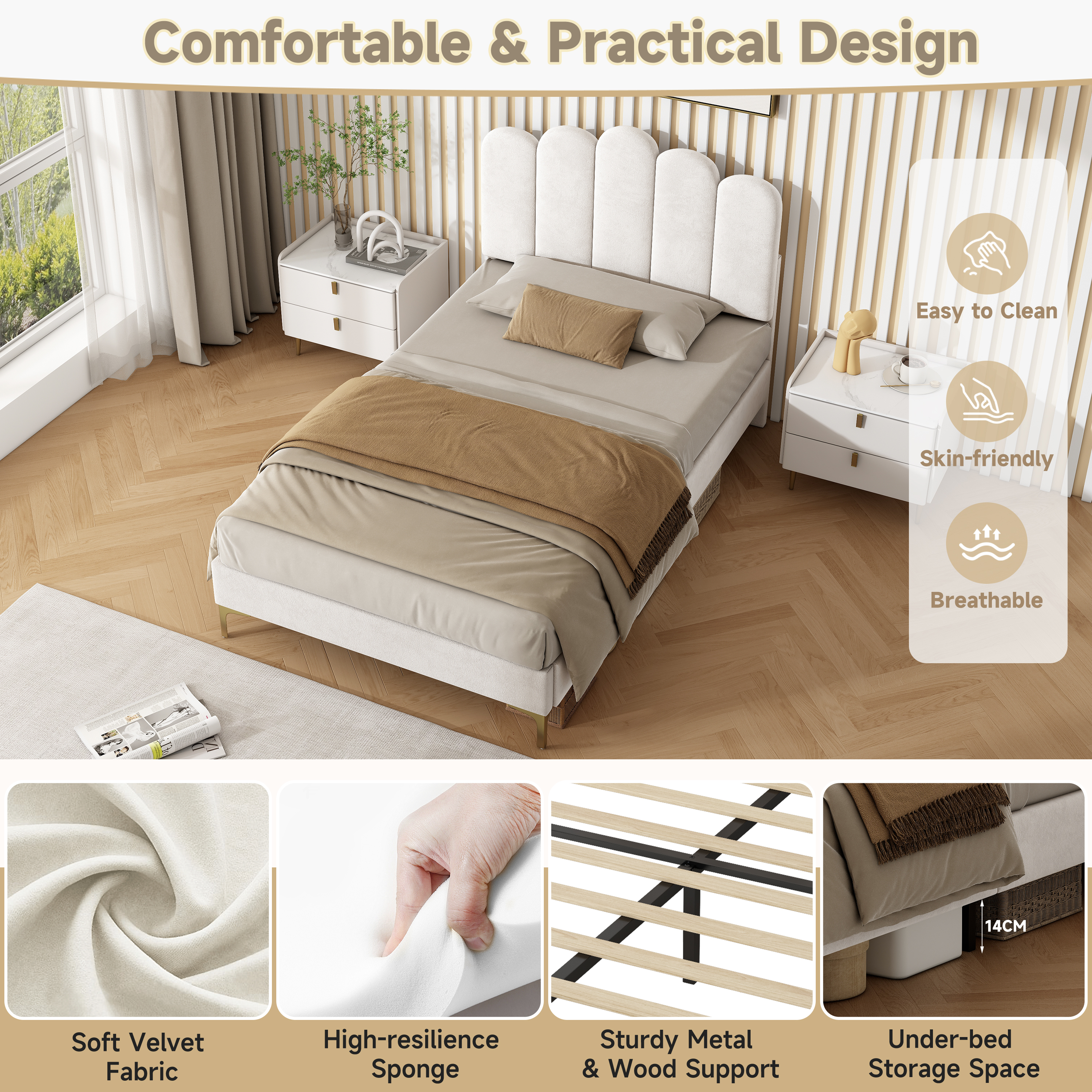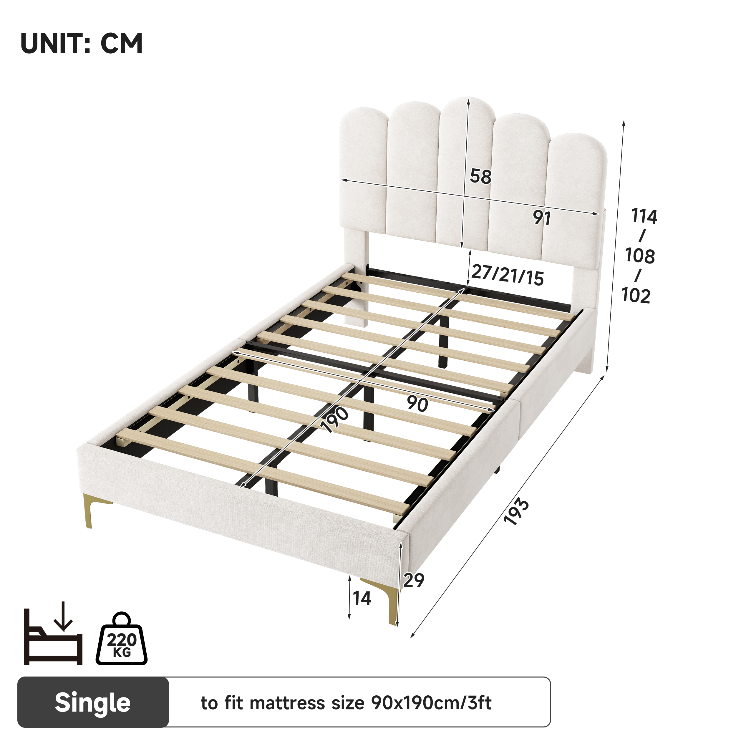 Product Name:3ft Single Premium Velvet Upholstered Bed Frame with Scalloped Channel Tufted Design, Height Adjustable Headboard & Gold Metal Feet, Under-bed Storage Space, No Box Spring Needed, Beige (No Mattress)