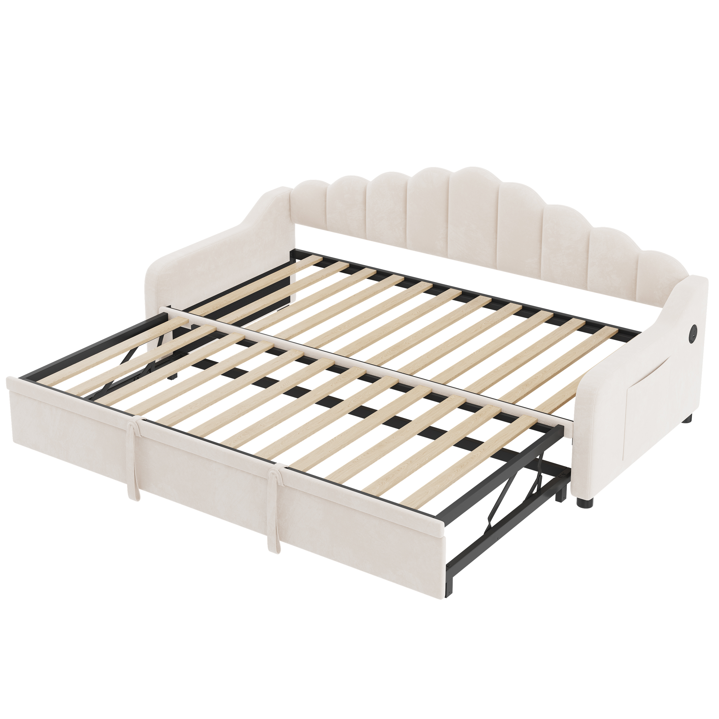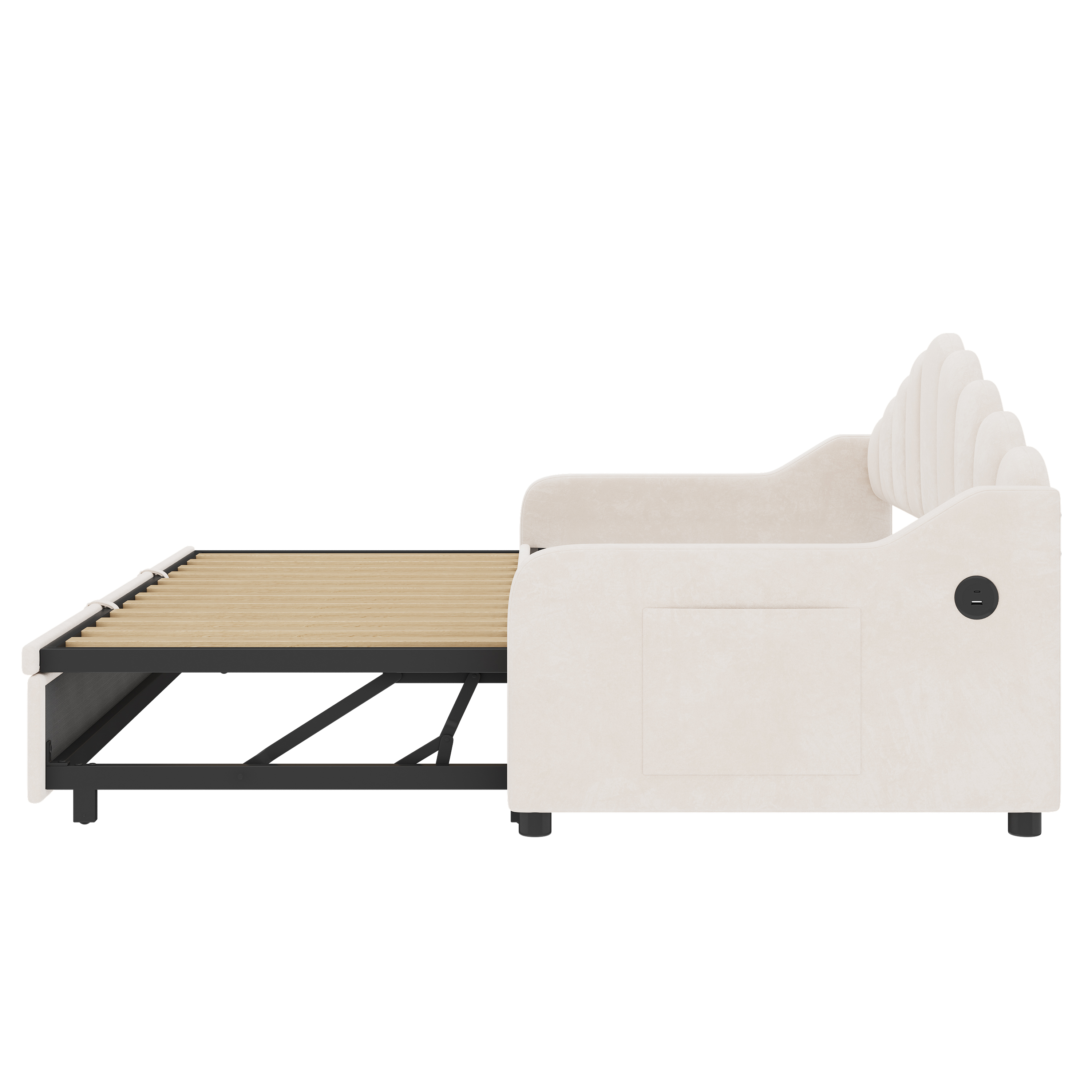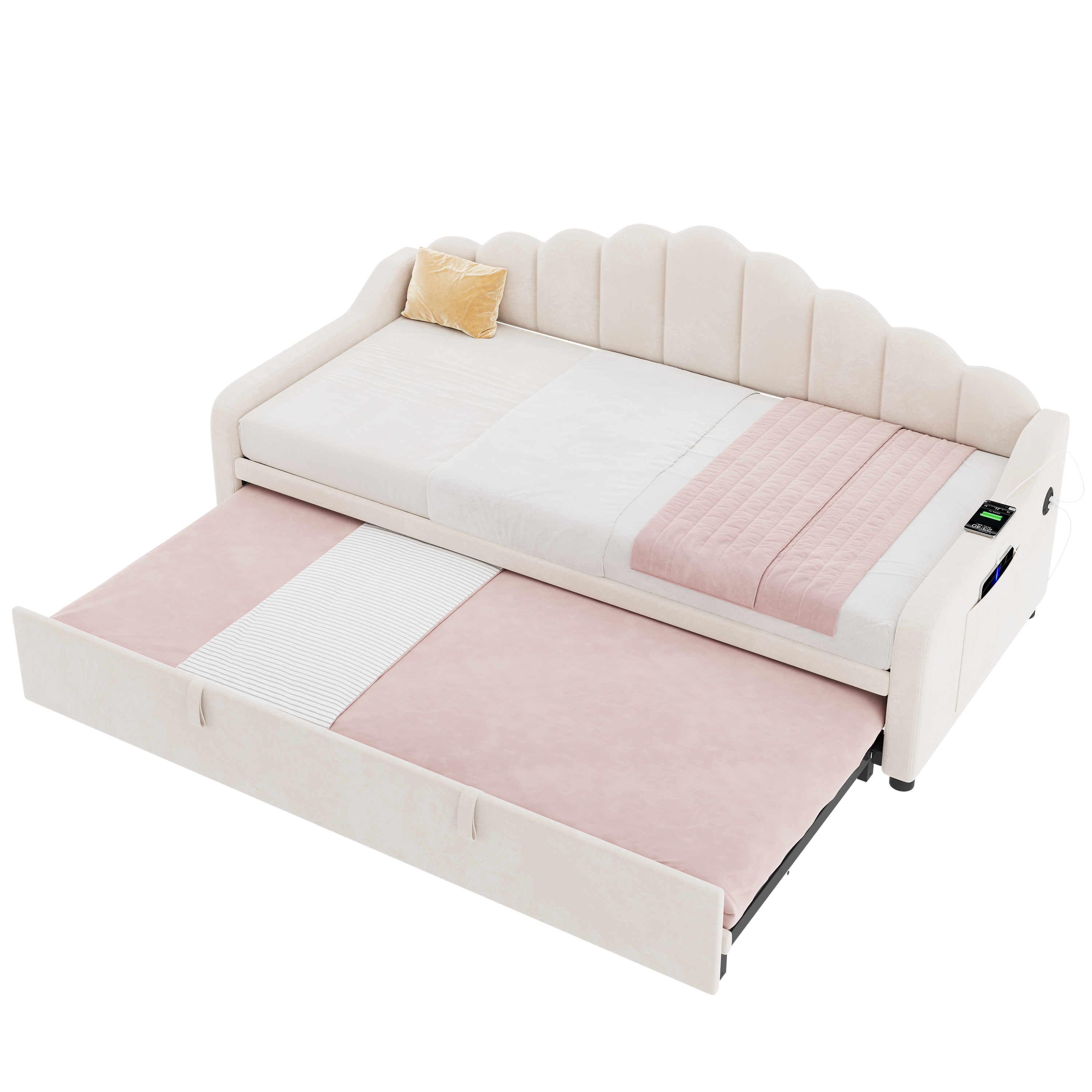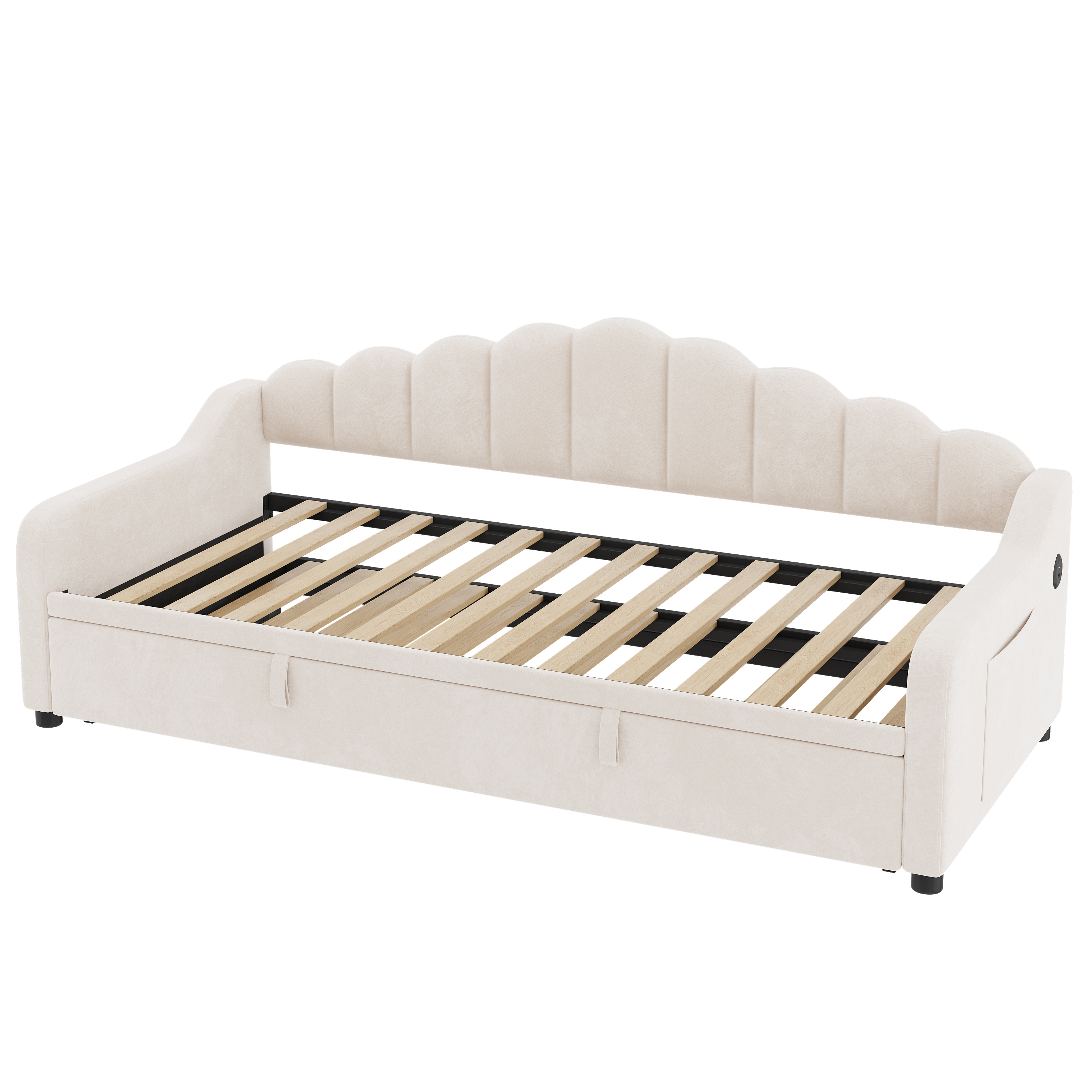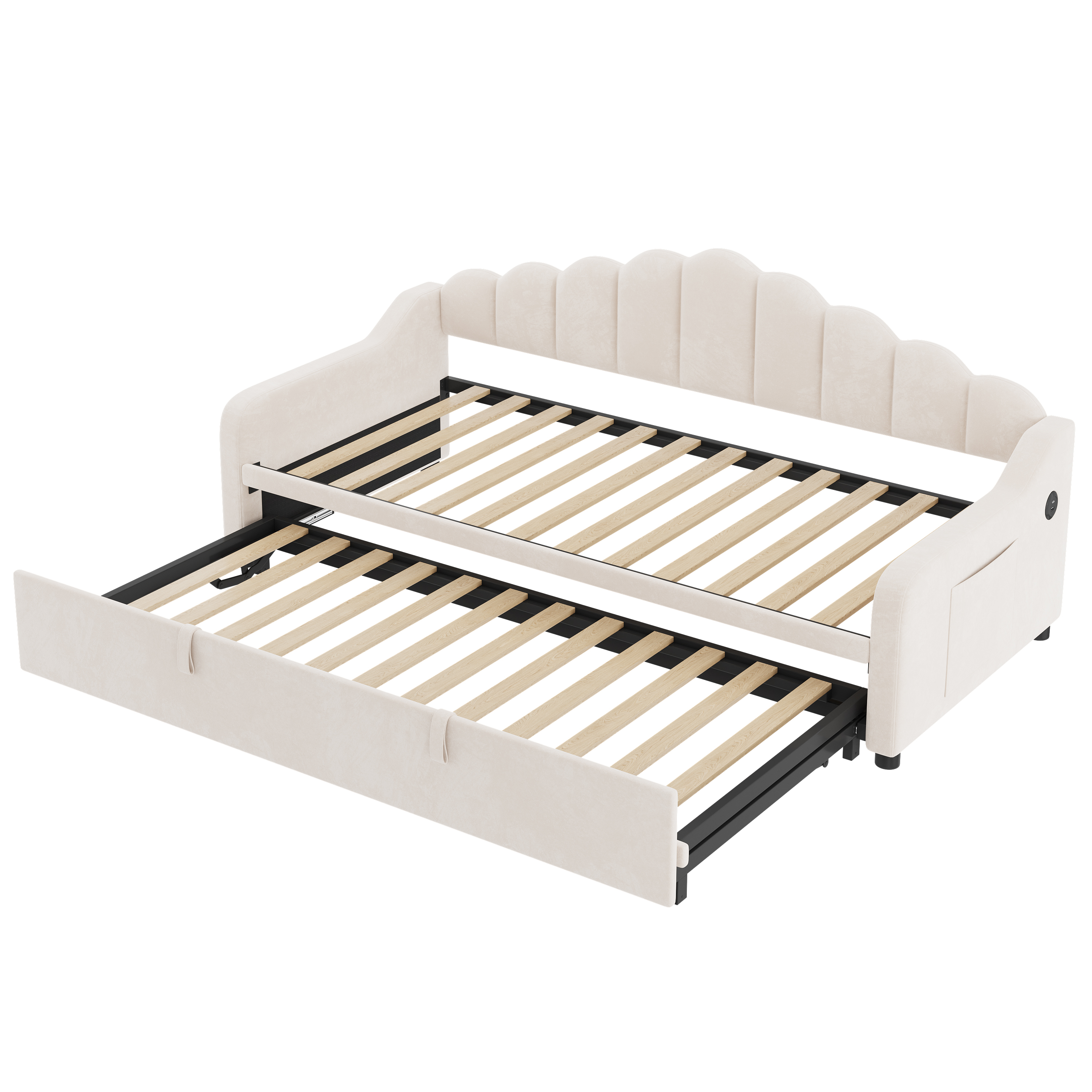 Product Name:3ft Single Daybed with Pull-out Trundle, Velvet Upholstered Sofa Bed with Side Charging Station & Storage Pockets, Chic Fluted Scalloped Backrest, Beige (No Mattress)
