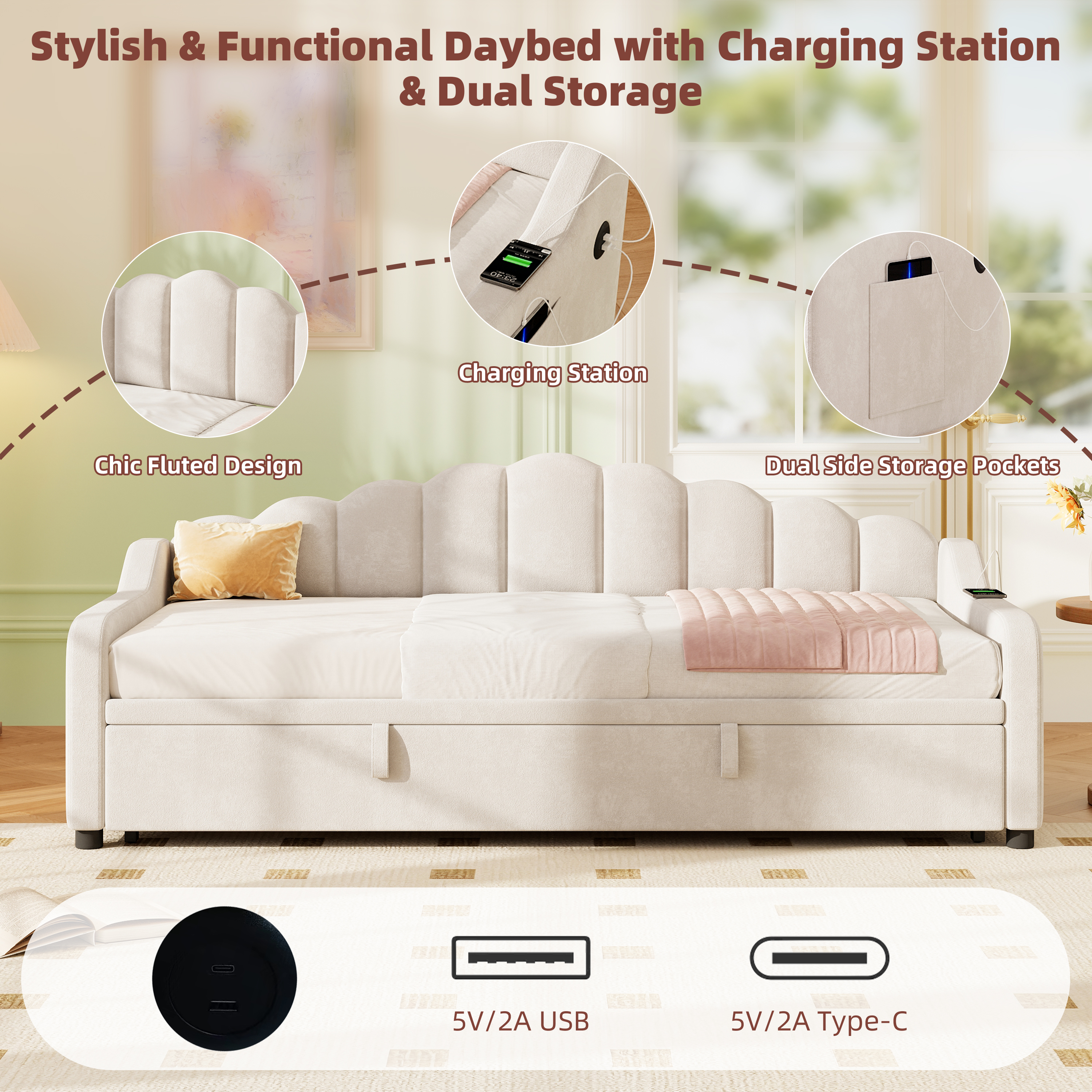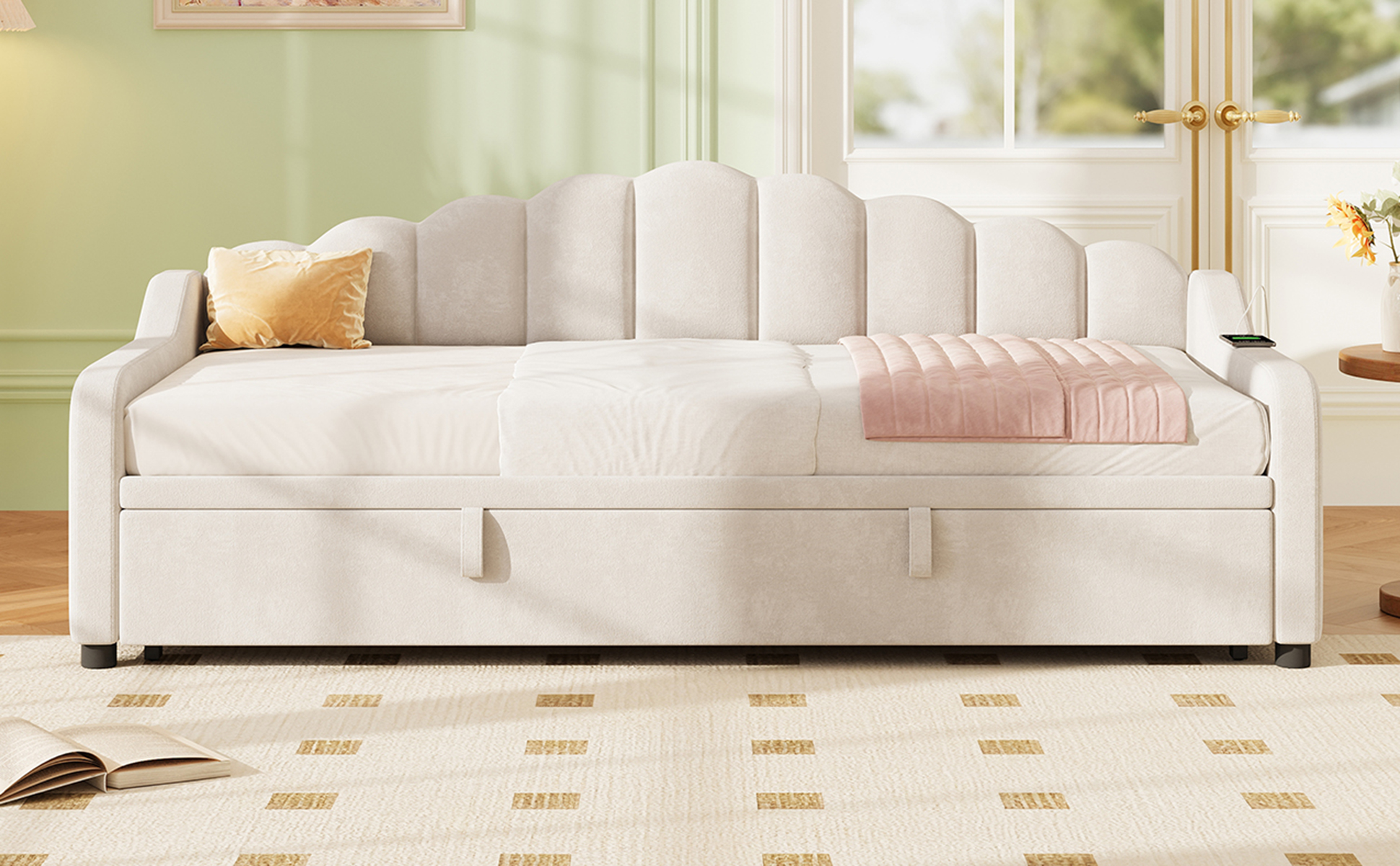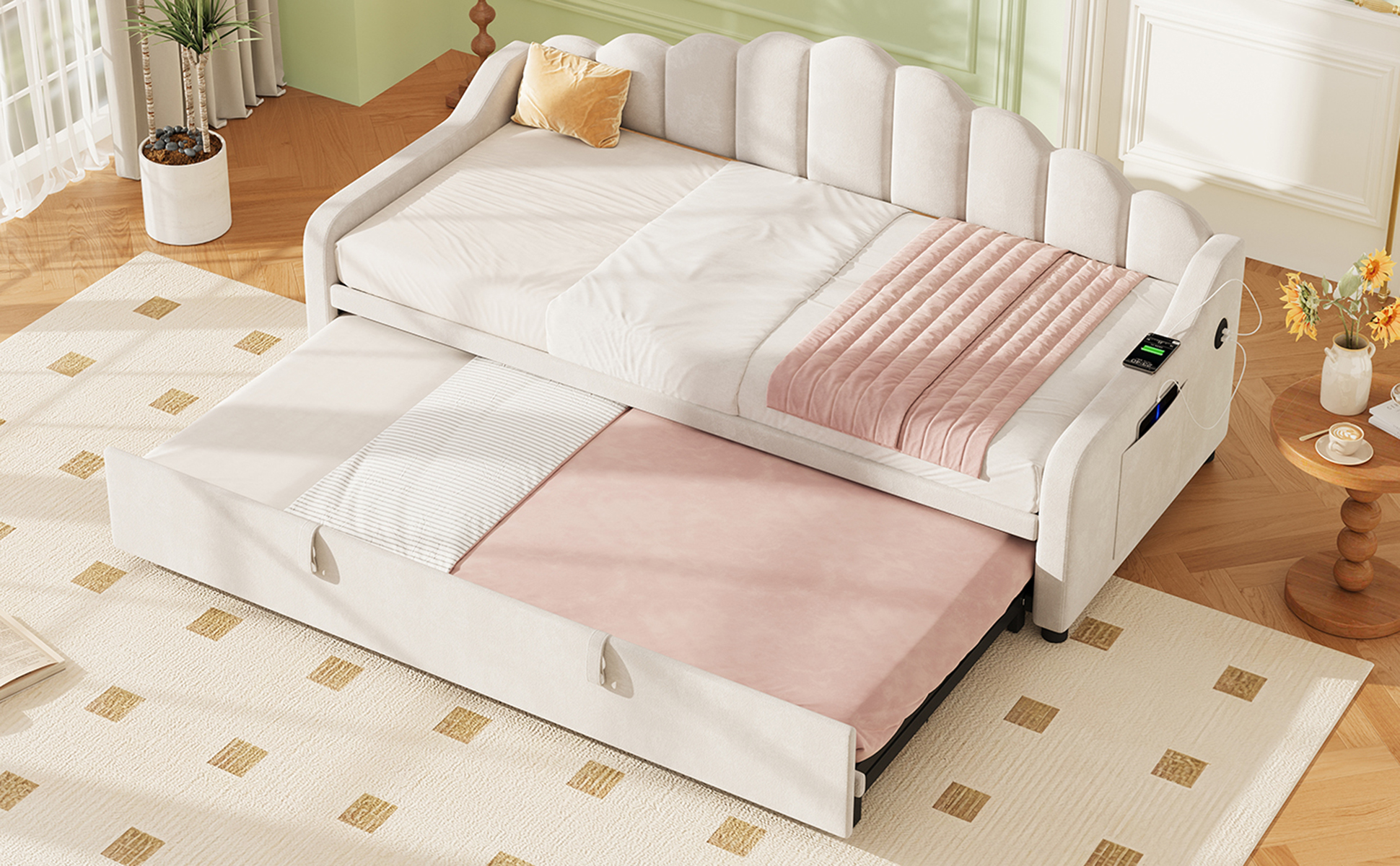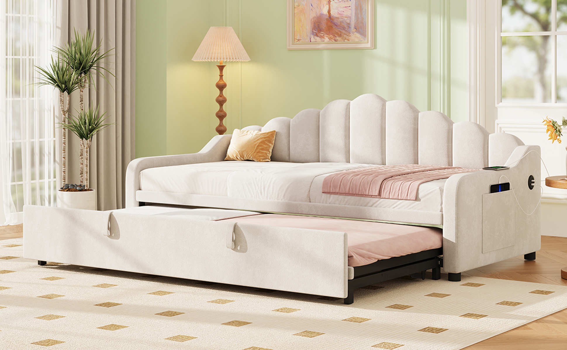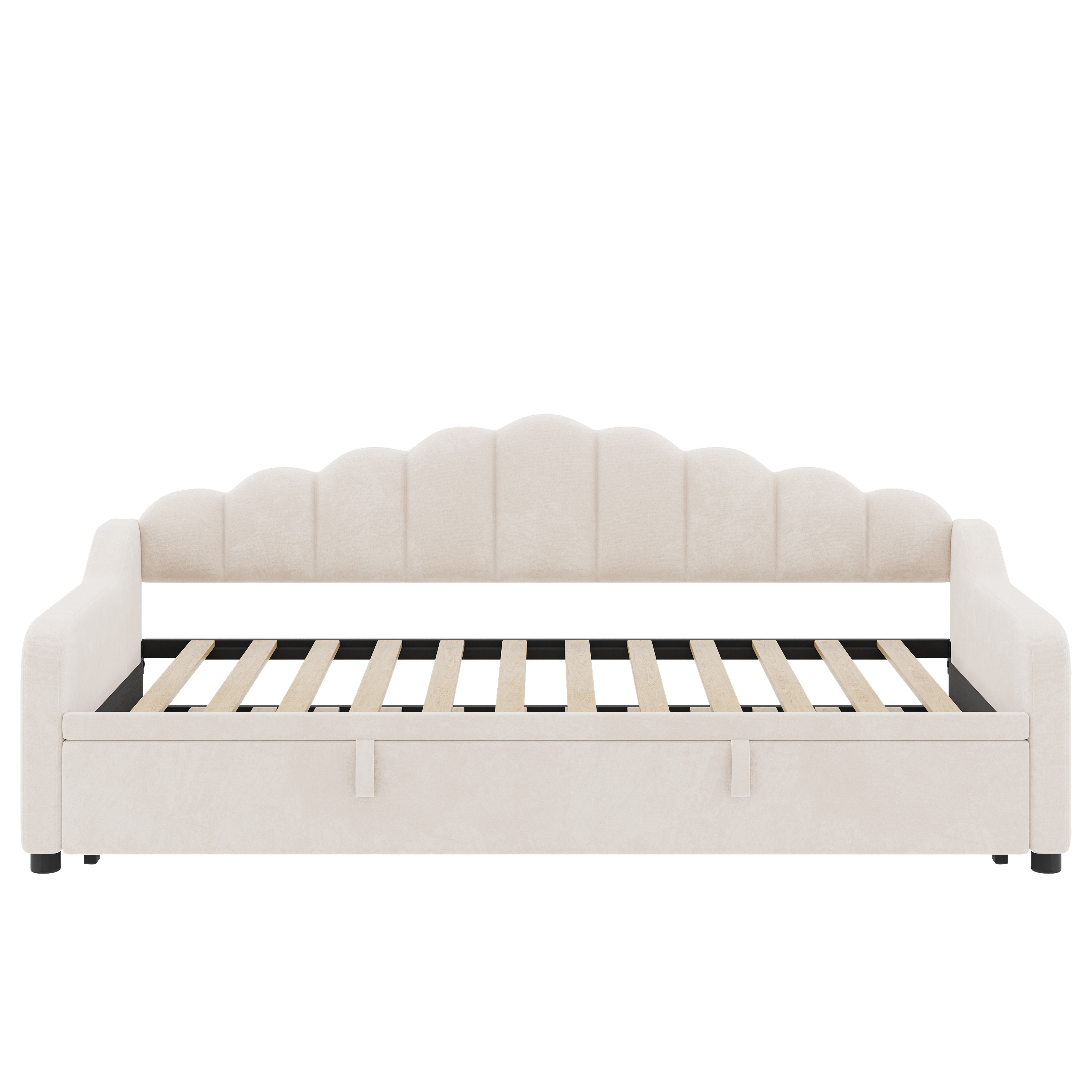 Product Name:3ft Single Daybed with Pull-out Trundle, Velvet Upholstered Sofa Bed with Side Charging Station & Storage Pockets, Chic Fluted Scalloped Backrest, Beige (No Mattress)