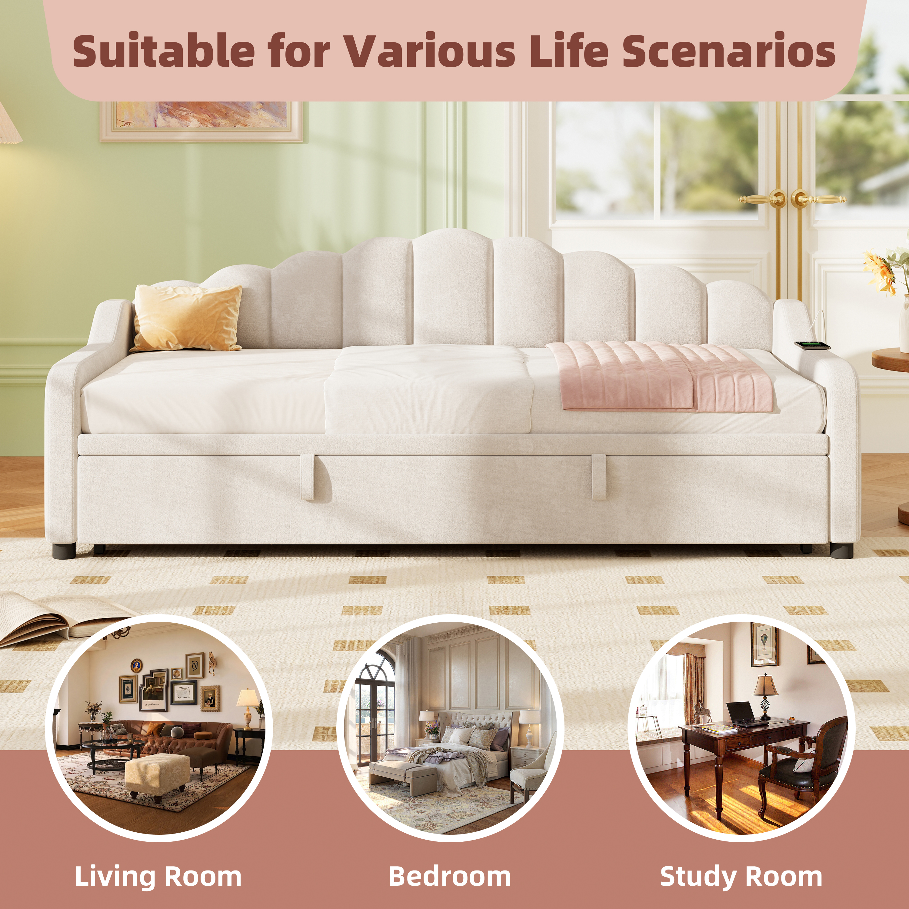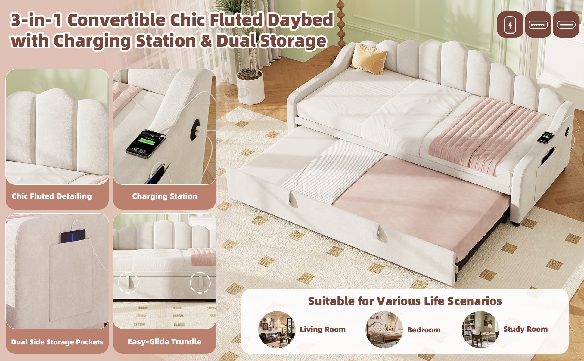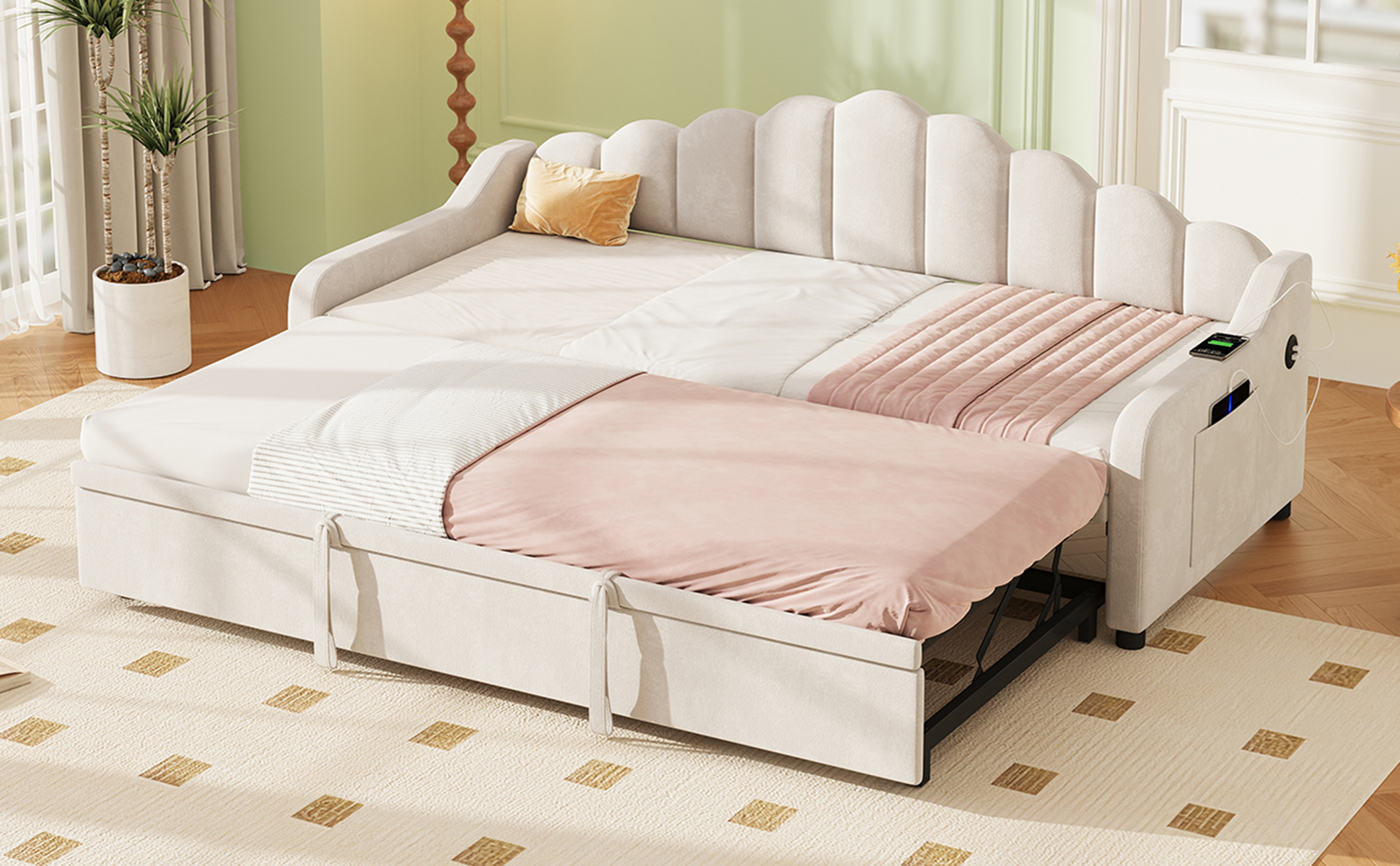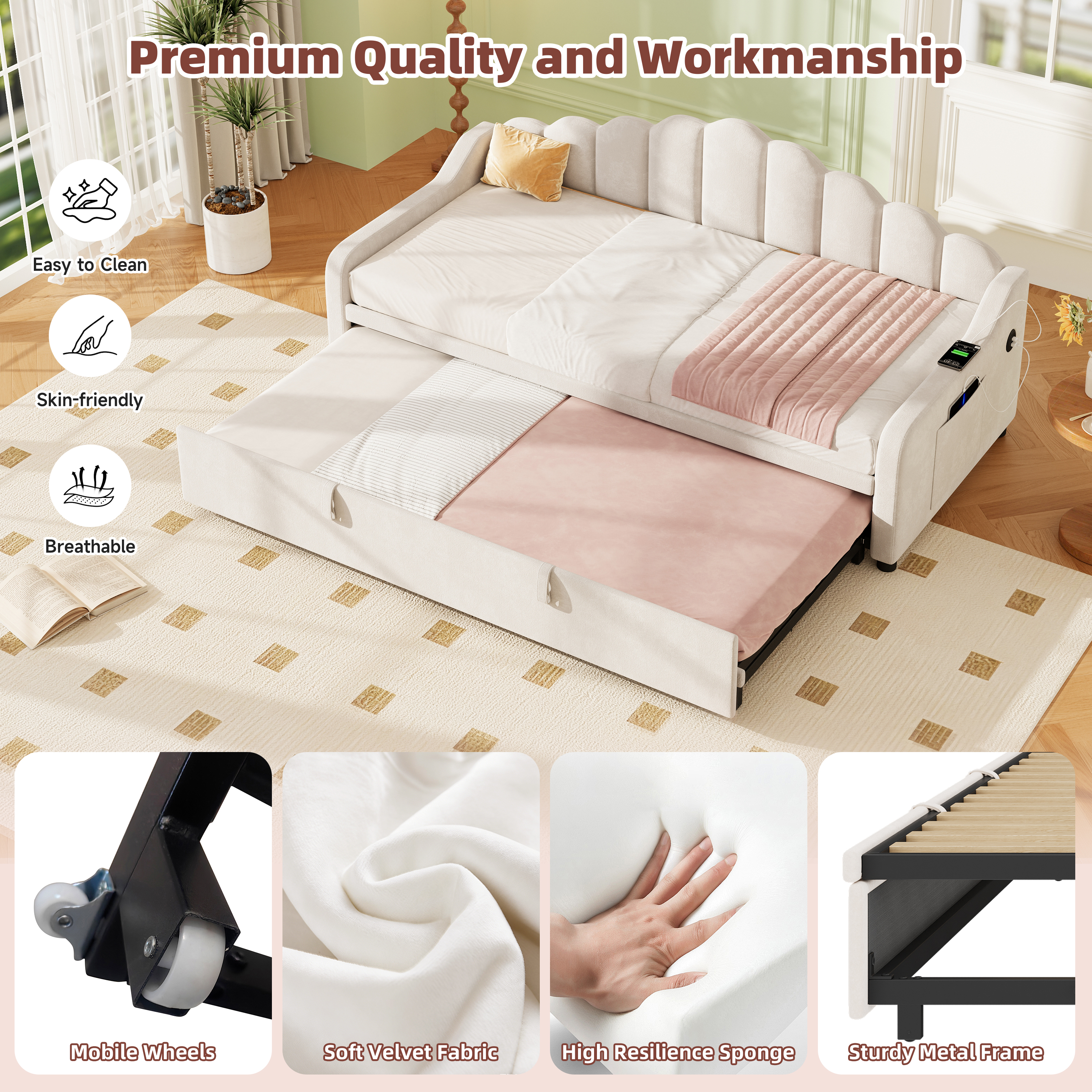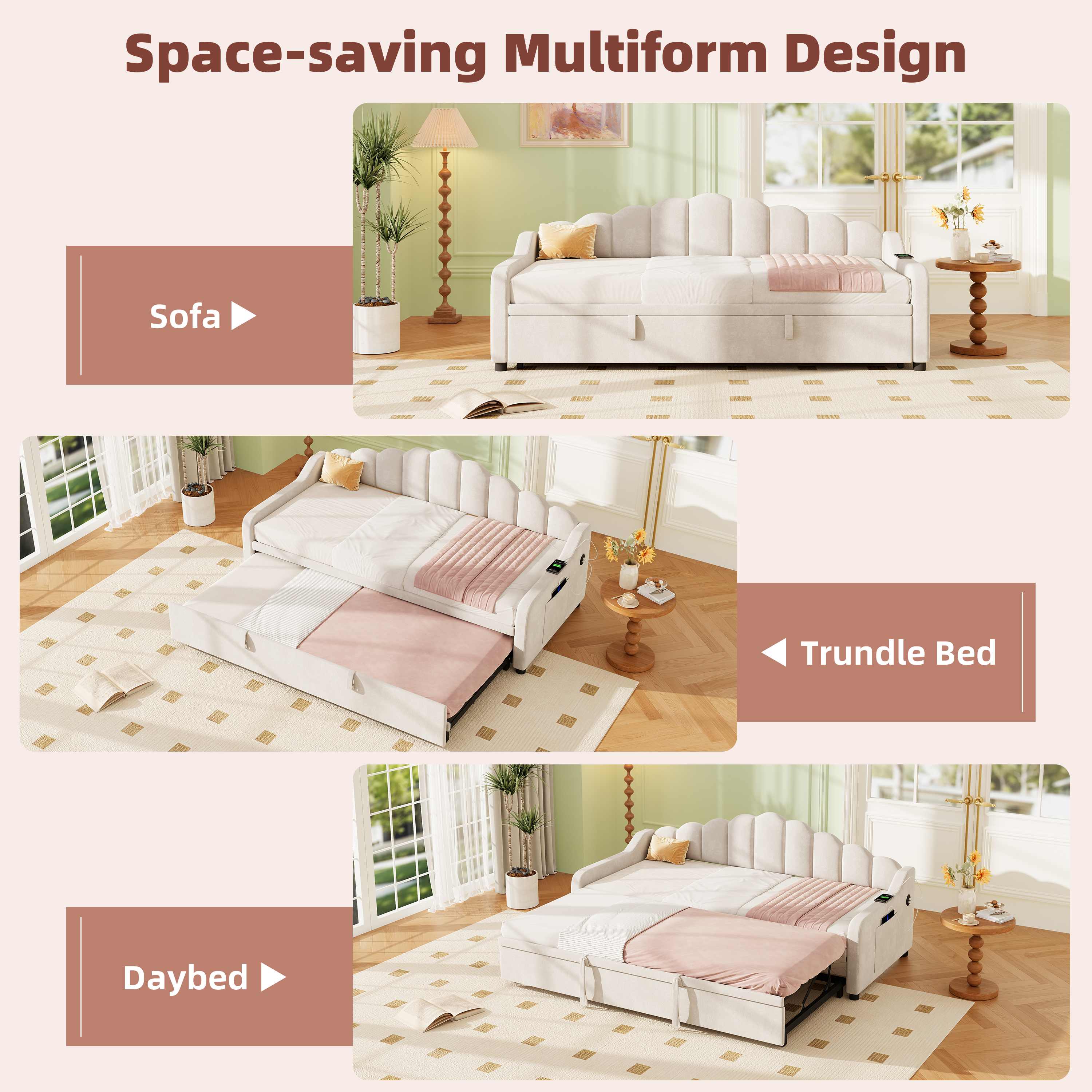 Elevate your home with this multifunctional daybed, a perfect blend of modern aesthetics and smart innovation. With its effortless 3-in-1 design, it transforms from a stylish sofa to a spacious sleeping area in seconds—perfect for hosting guests or relaxing in a home office. Experience ultimate convenience with the built-in side charging station and dual storage pockets, keeping your devices powered and your space clutter-free. Wrapped in luxurious, breathable velvet and supported by a sturdy frame, this space-saving masterpiece provides the perfect balance of elegance and daily functionality. Special Features: - Three convertible forms: sofa, trundle bed and daybed - Side Charging Station - Dual Side Storage Pockets - Skin-friendly velvet and high resilience sponge - Smooth-gliding wheels for easy conversion