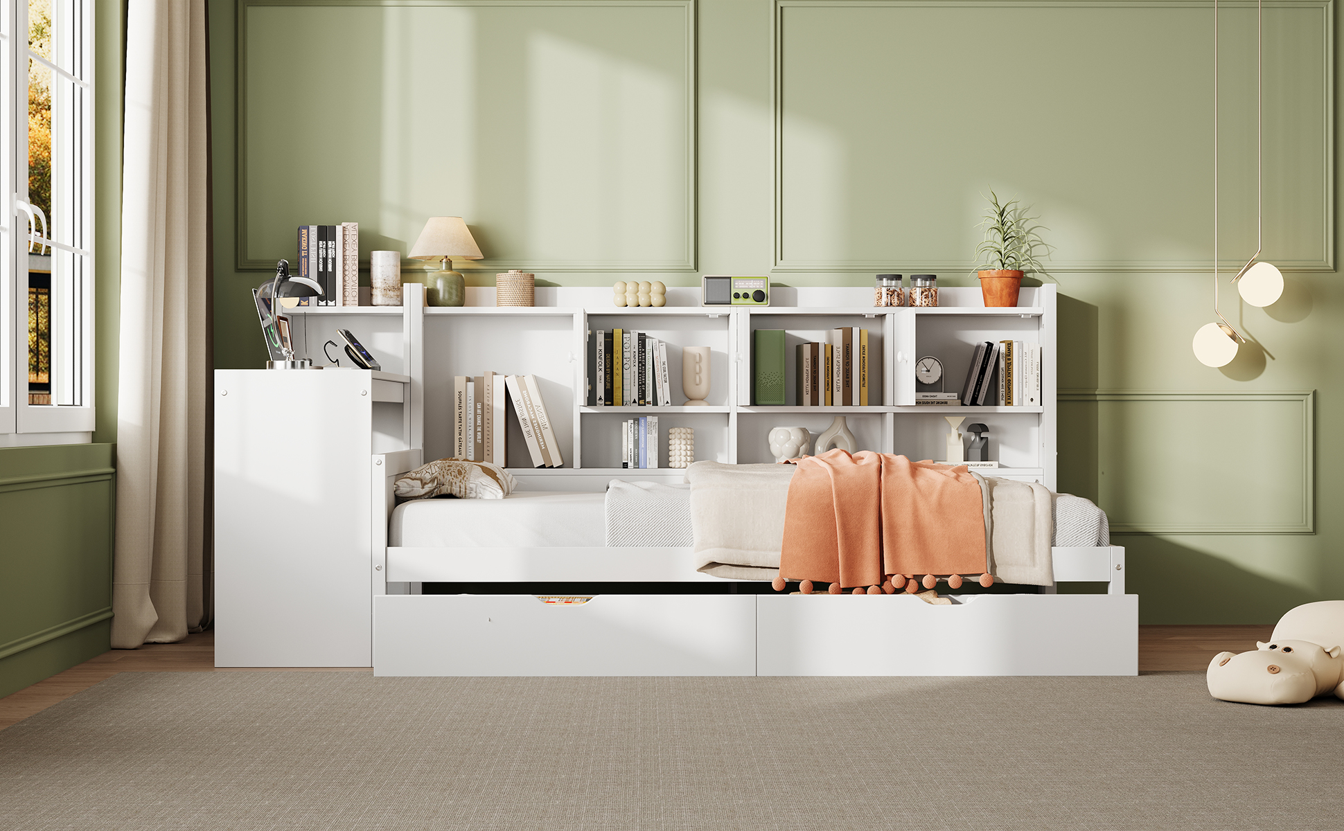 This versatile and stylish wooden bed, designed specifically for contemporary homes and office spaces, seamlessly blends practical functionality with minimalist aesthetics. Storage drawers and integrated storage headboard make it easy to organize and access your belongings. Integrated storage headboard to provide more perfect for books, glasses, alarm clock, mobile phone, etc. This daybed features an integrated desk that can be installed either on the left or right side depending on the room layout. Integrated desk also provides 2 USB ports and power outlet, convenient for you to charge your cell phone, tablet or lamp at any time. Attractive appearance design suitable for various home styles, minimalist aesthetic, effortlessly creating an ideal space for your. Special Features - Two storage drawer - Integrated desk with two assembly methods - Built-in bookshelf storage - Charging Station - Attractive appearance design suitable for various home styles - Sturdy wood support