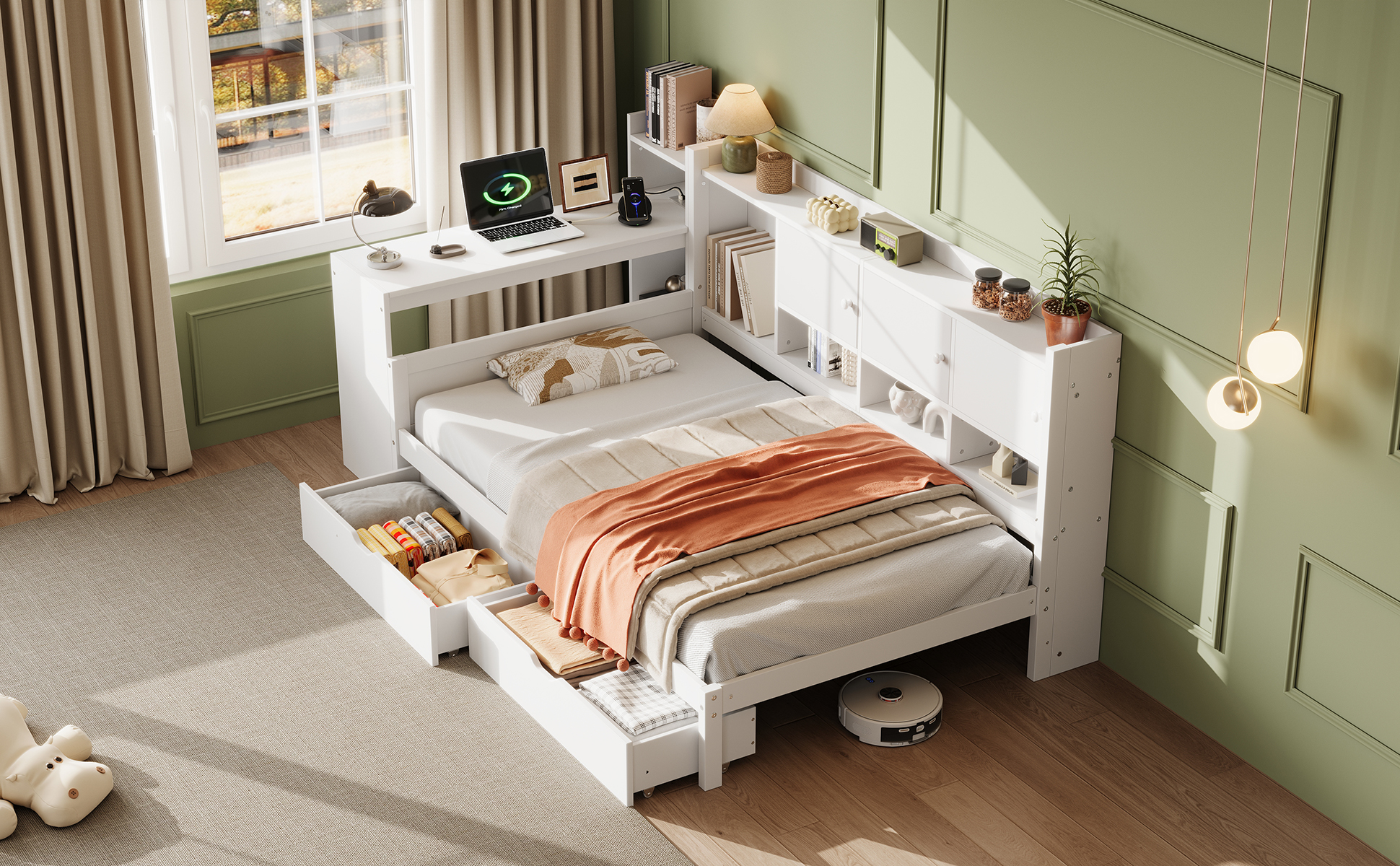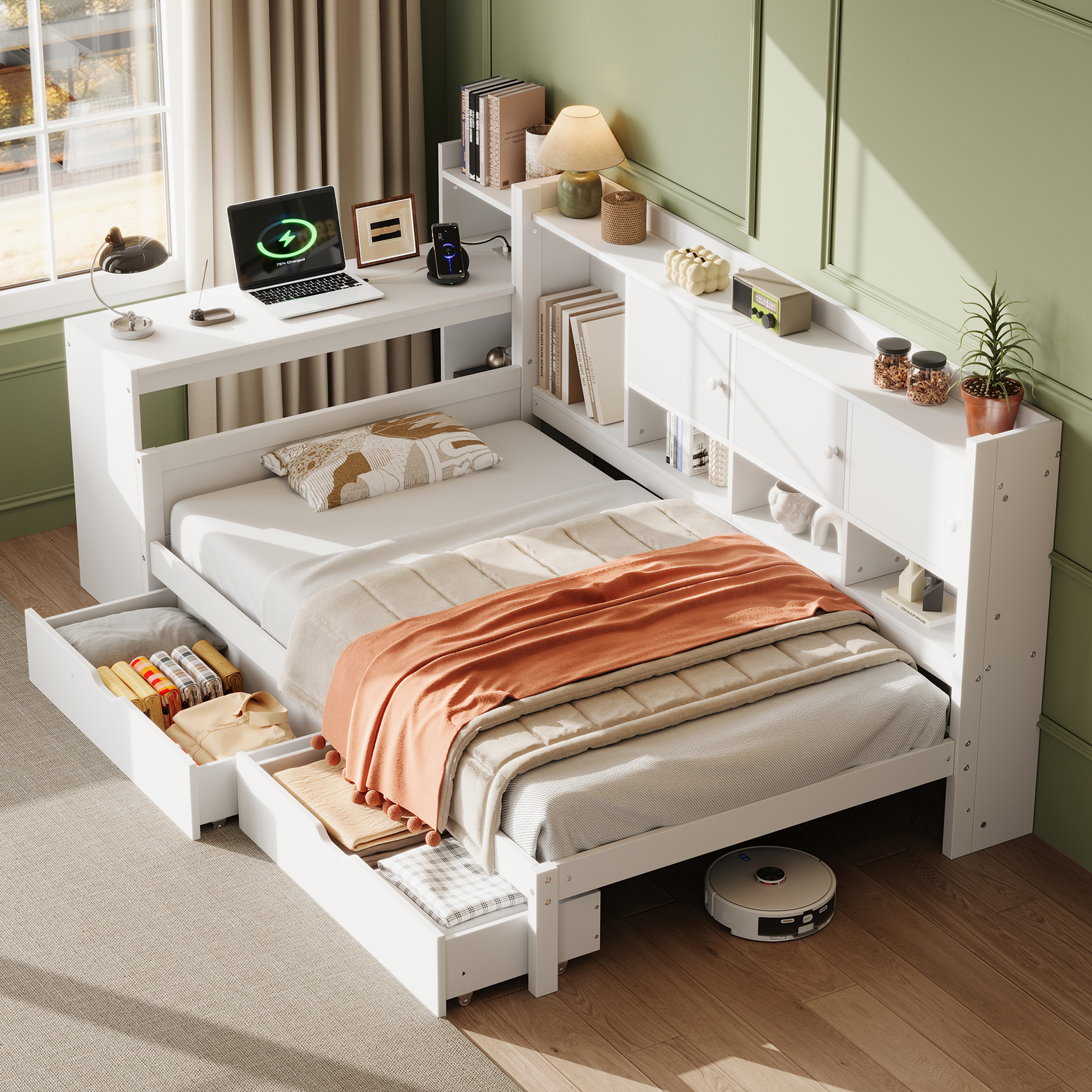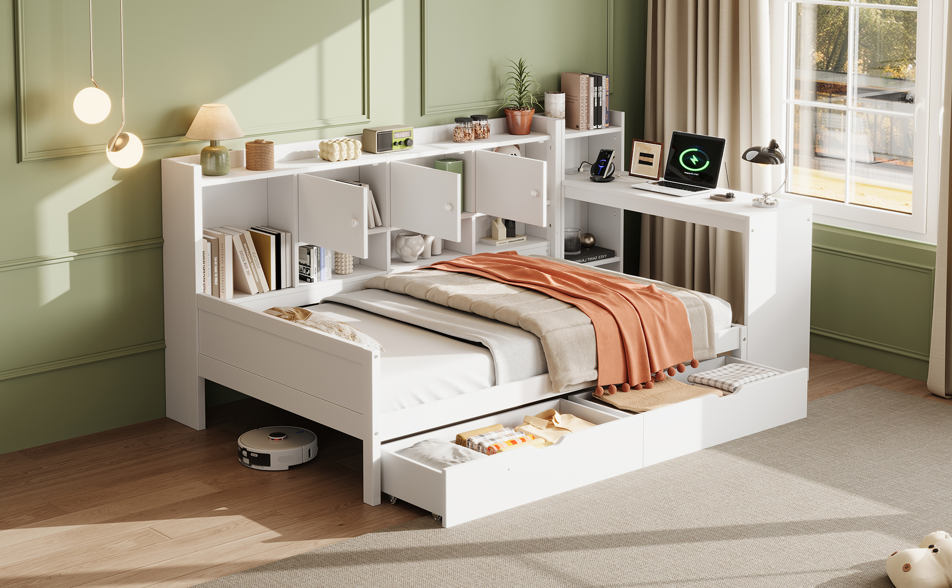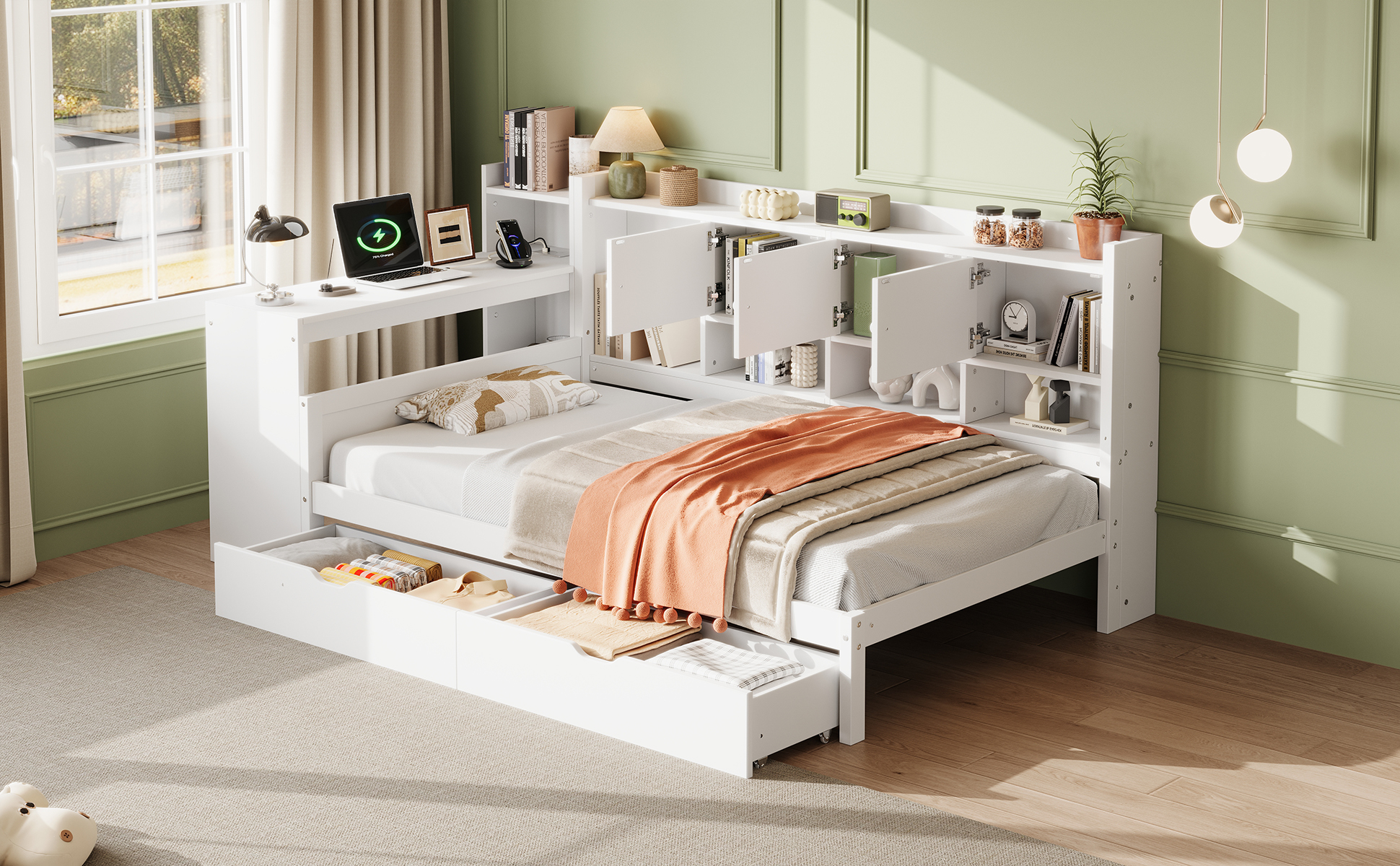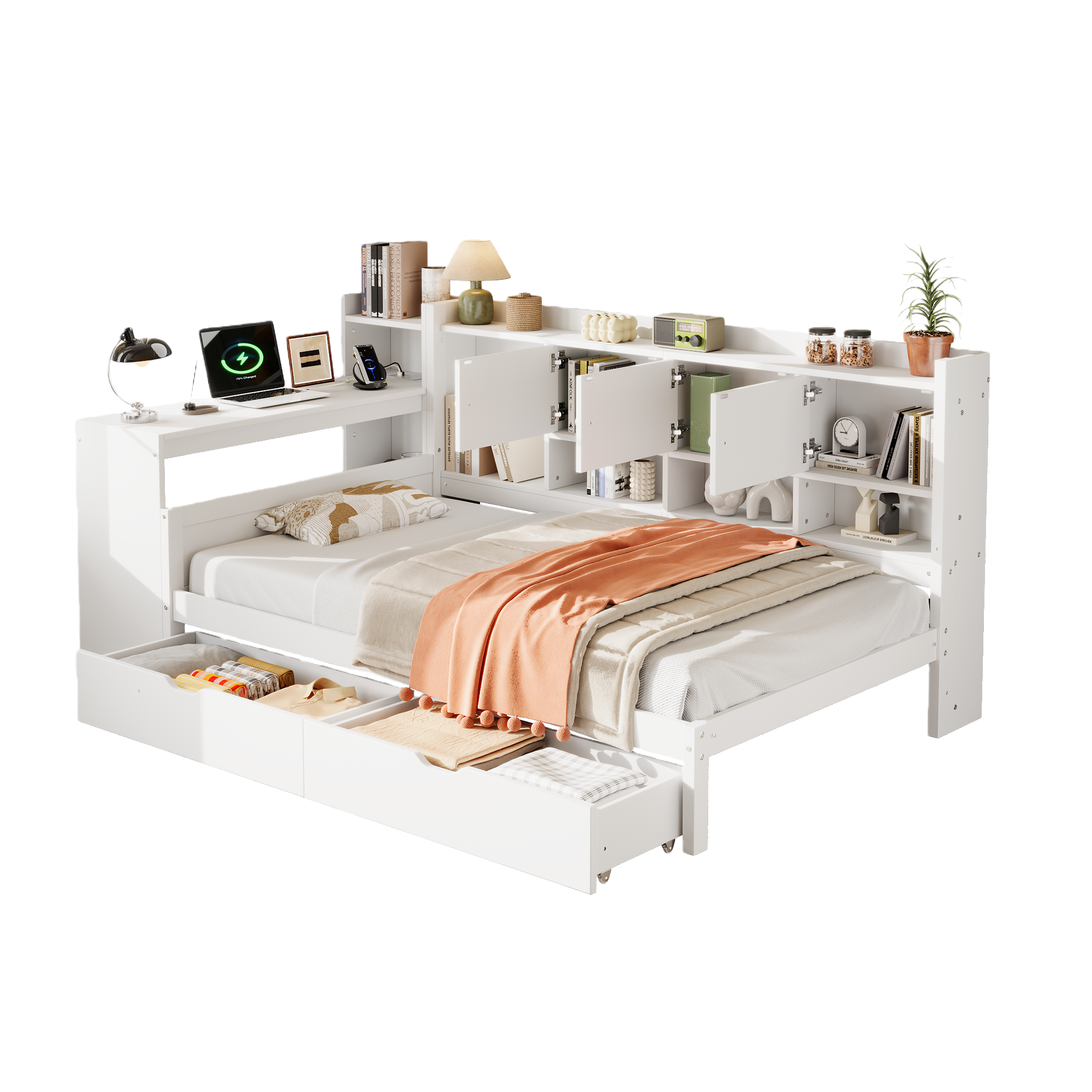 Wood Storage Daybed with Bookcase, Desk & Charging Station