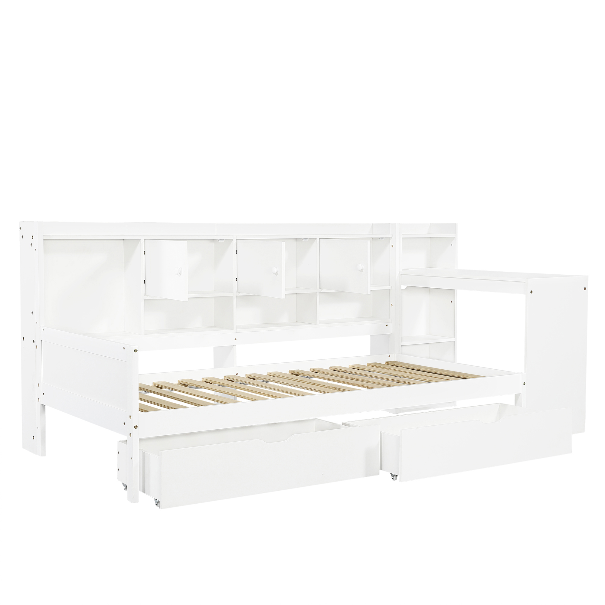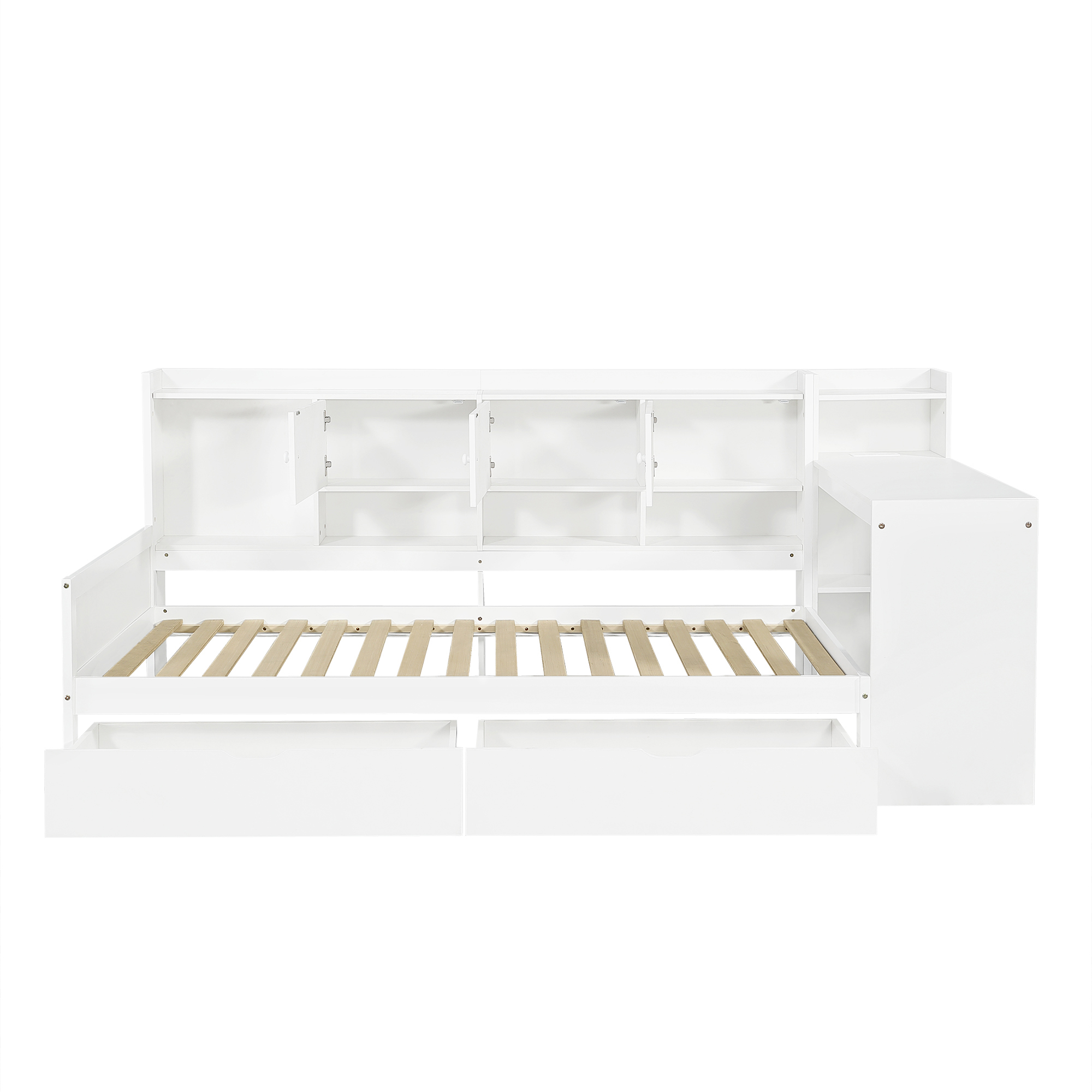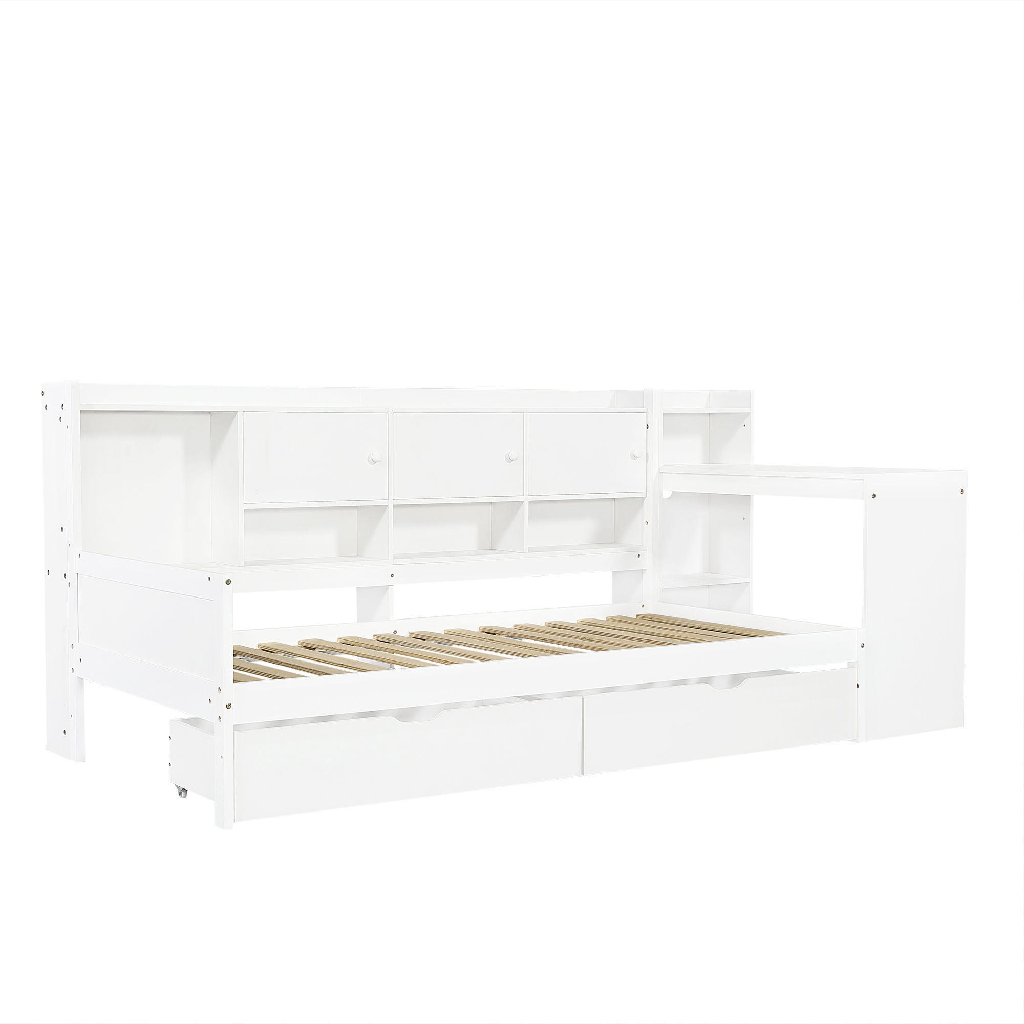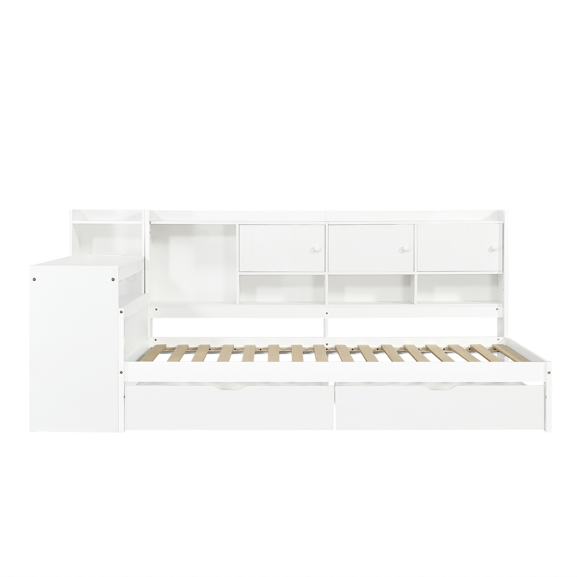 Product Name:3ft Single Daybed with Storage Drawers and Bookcase, Modern Bed frame with Charging Station and Integrated Desk, Wood Bed for Living Room/ Bedroom/ Study Room, Two Assembly Methods, White(No Mattress)