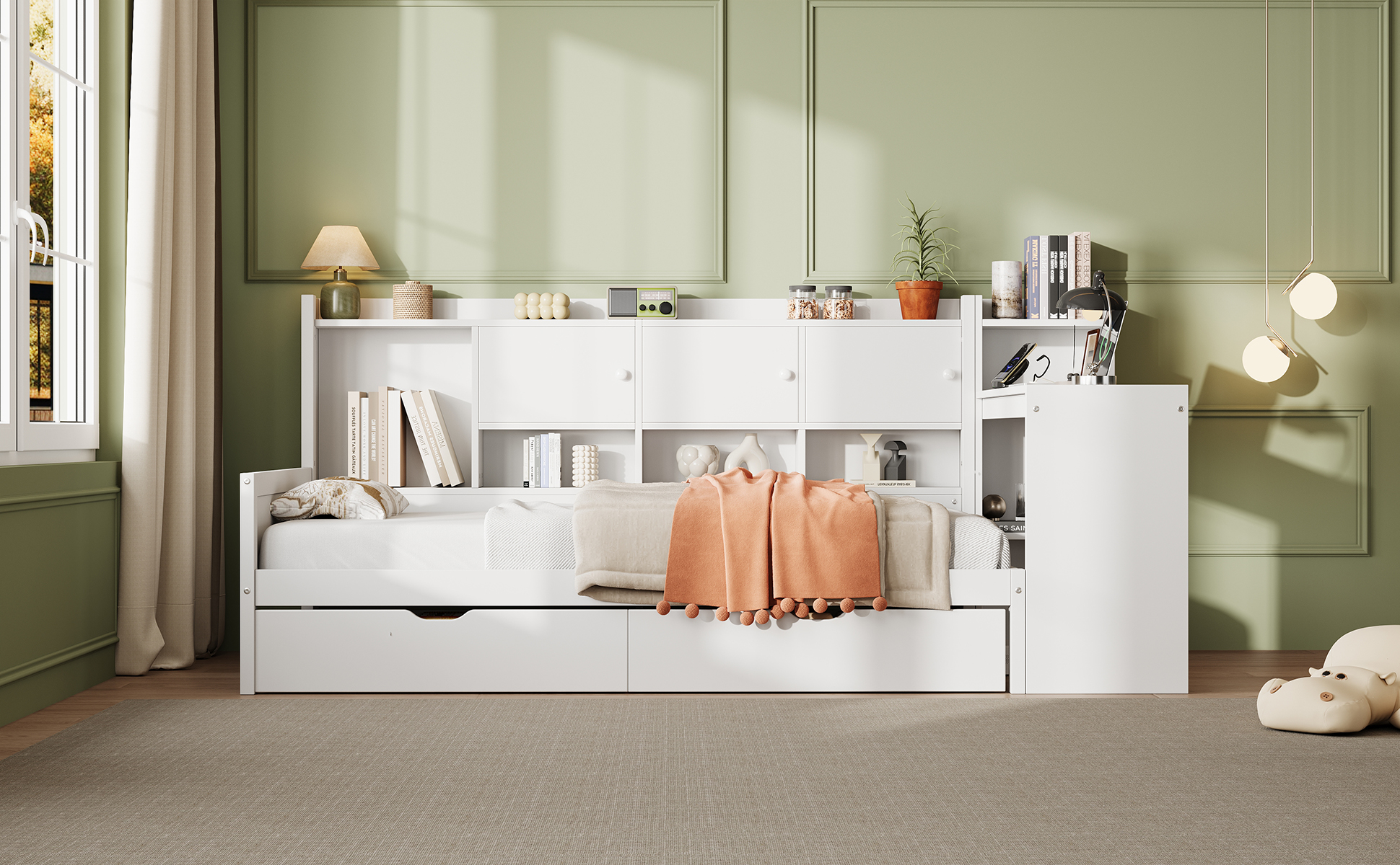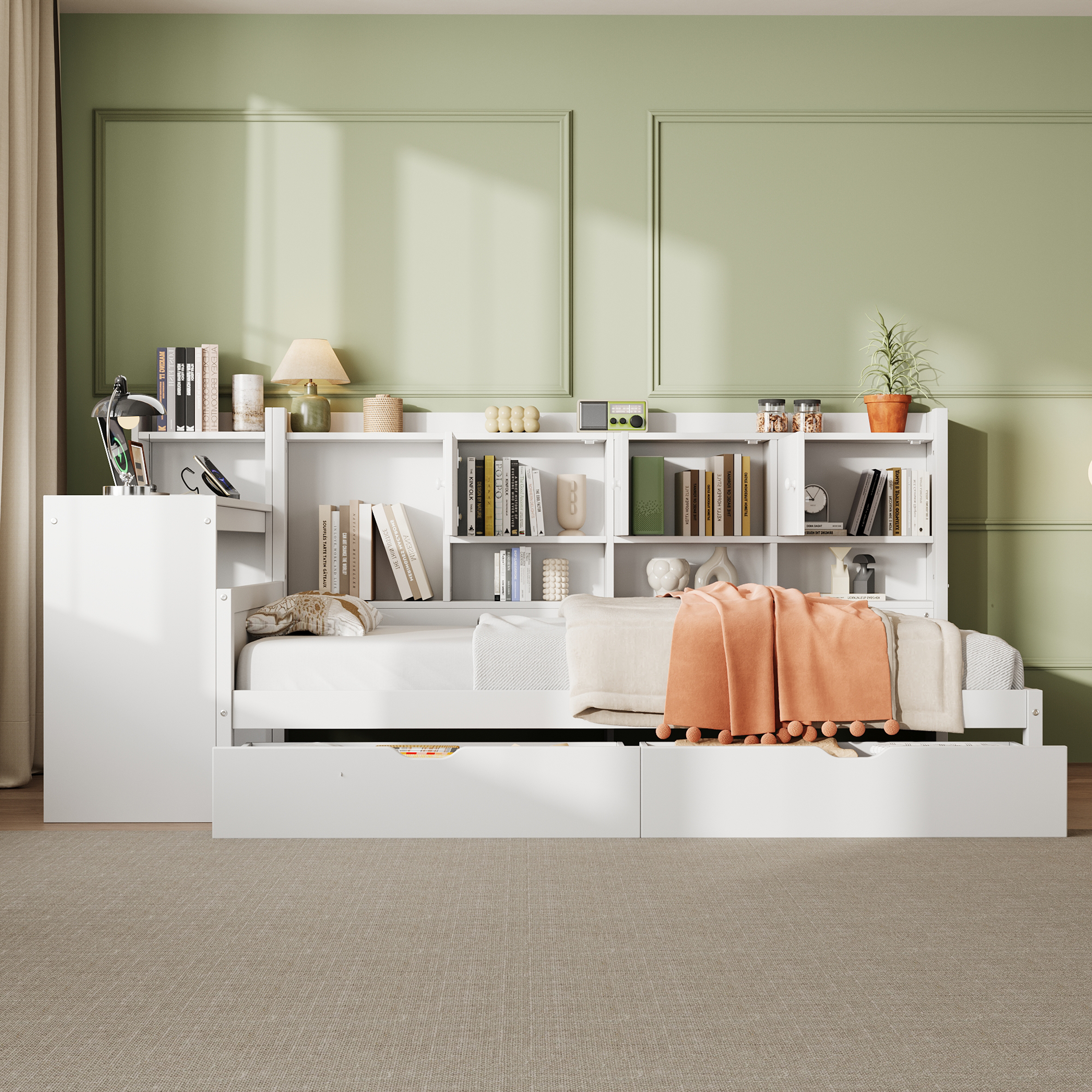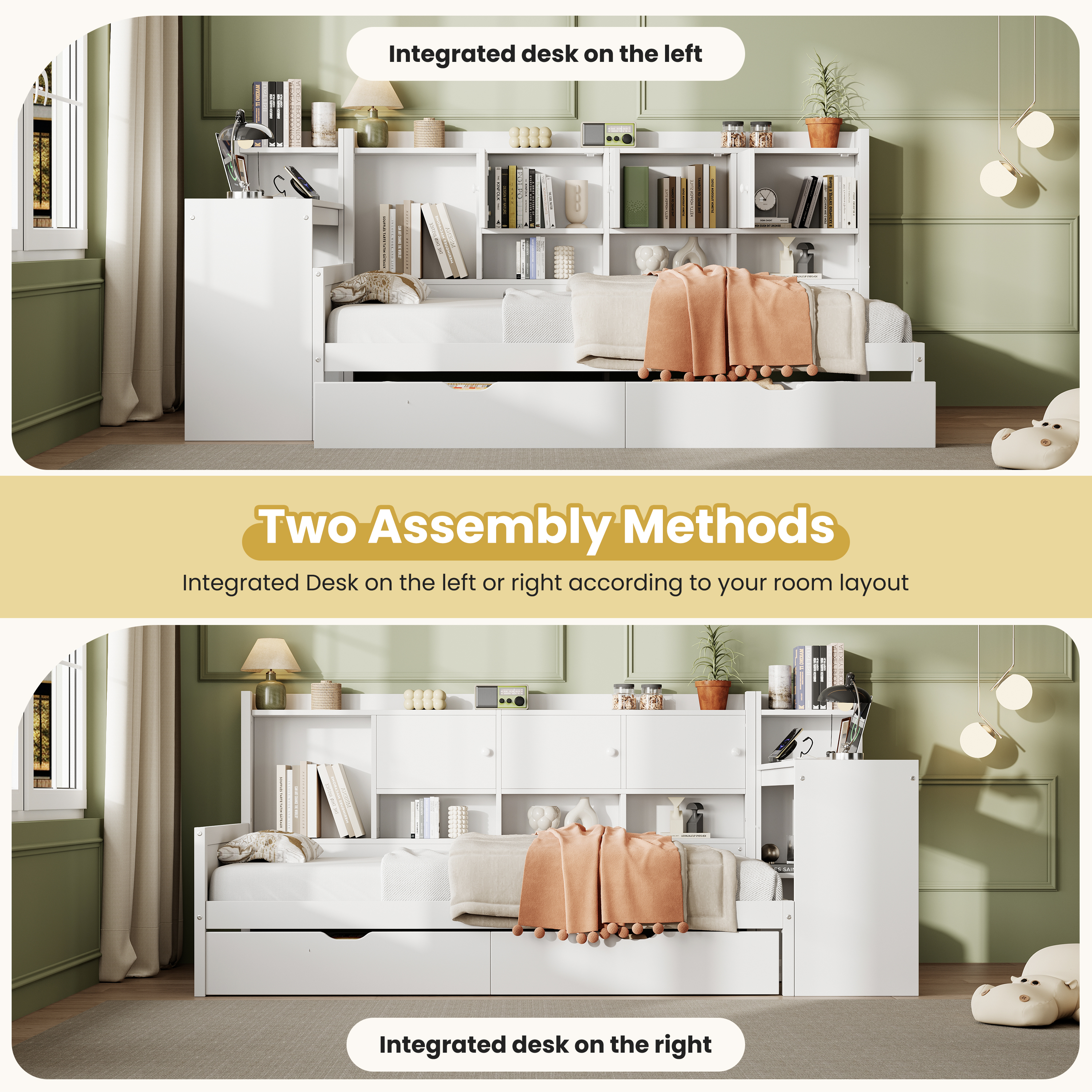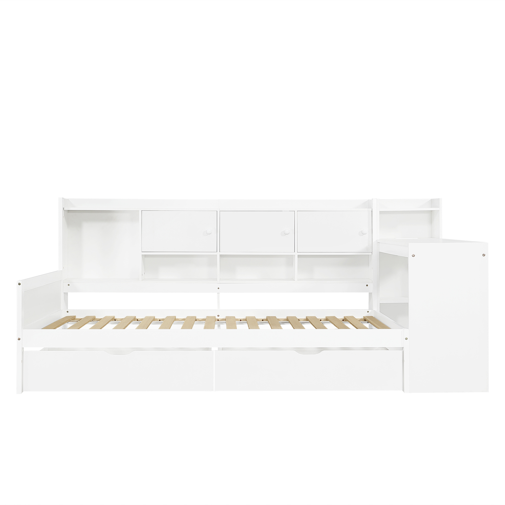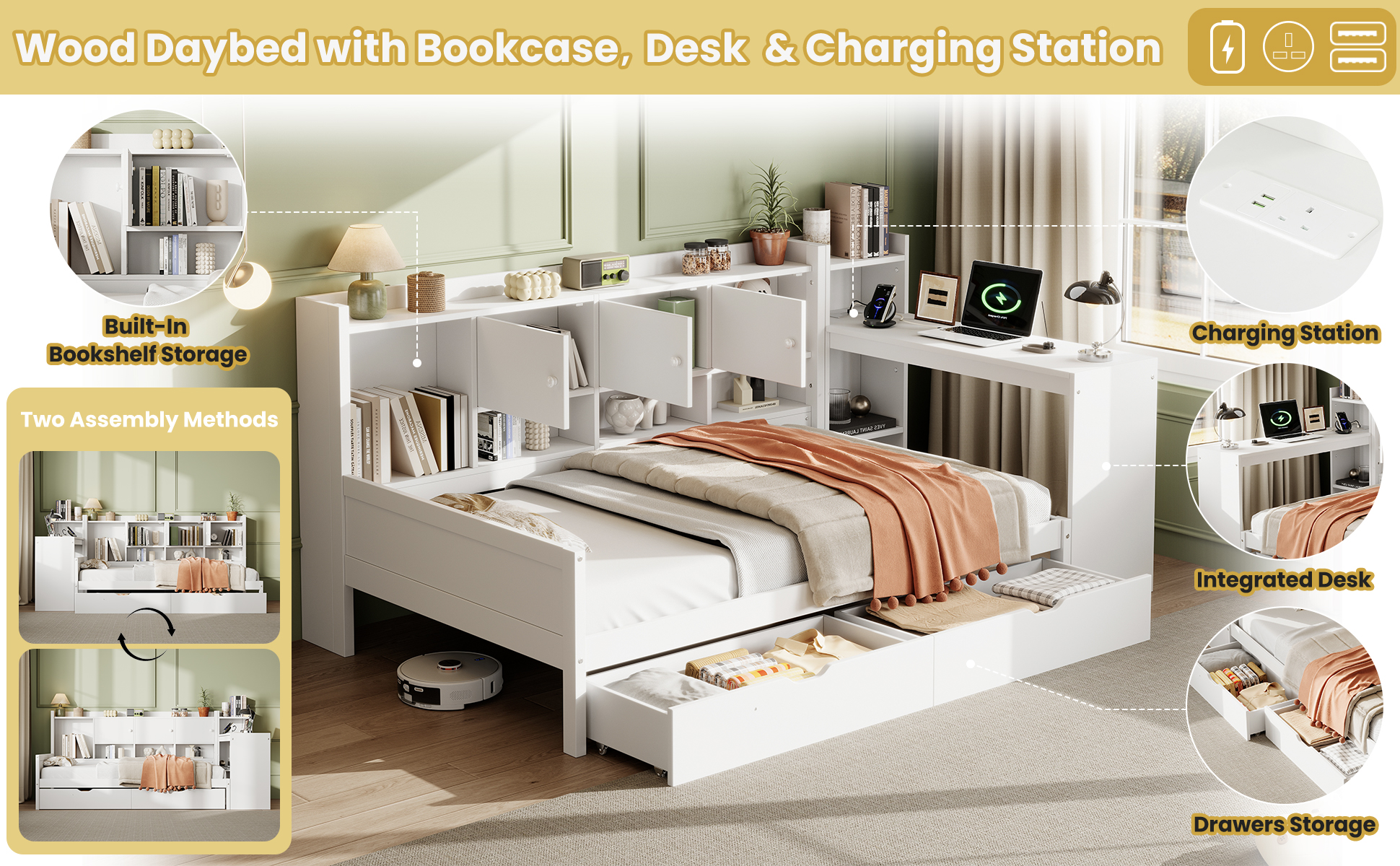 Product Name:3ft Single Daybed with Storage Drawers and Bookcase, Modern Bed frame with Charging Station and Integrated Desk, Wood Bed for Living Room/ Bedroom/ Study Room, Two Assembly Methods, White(No Mattress)