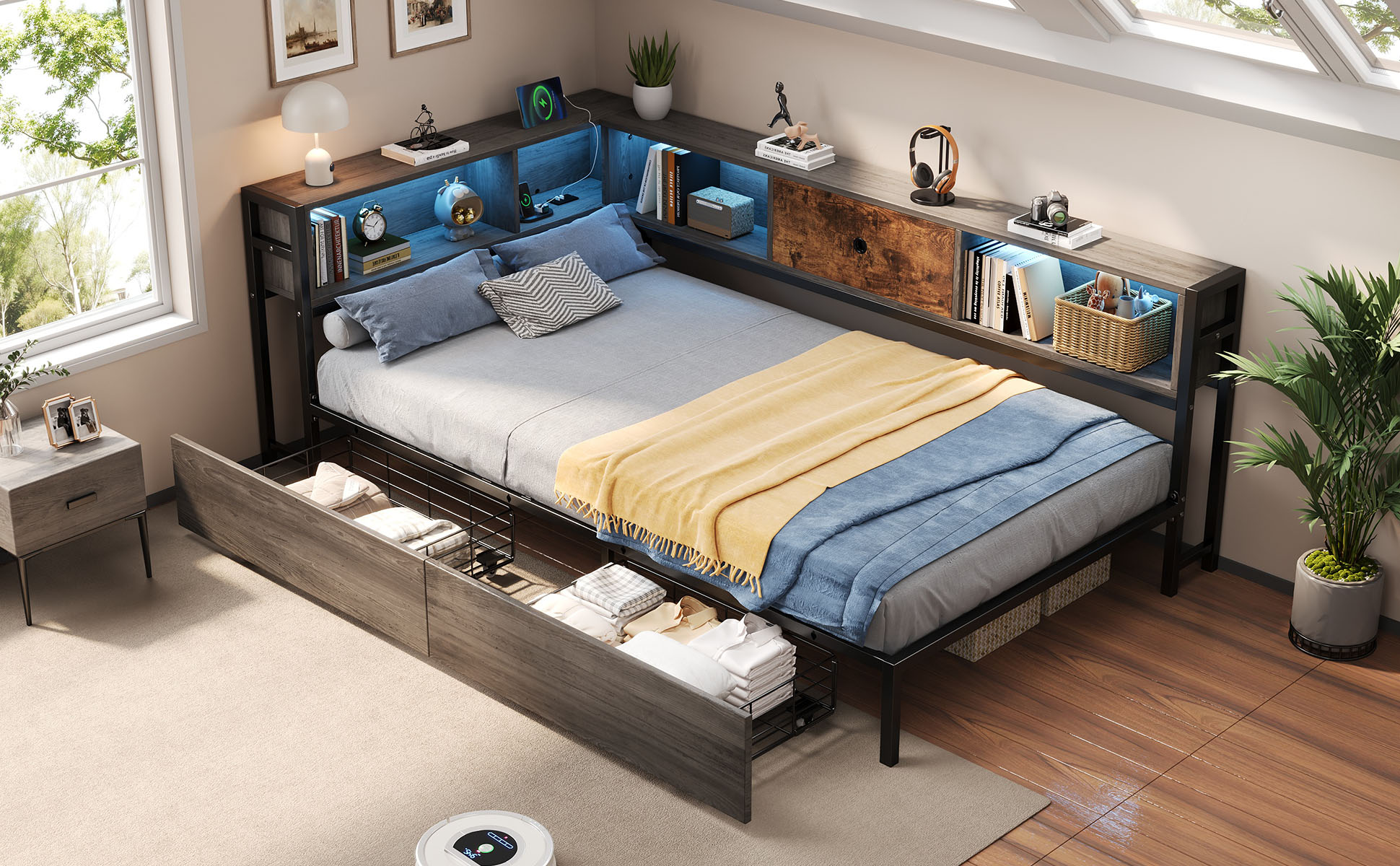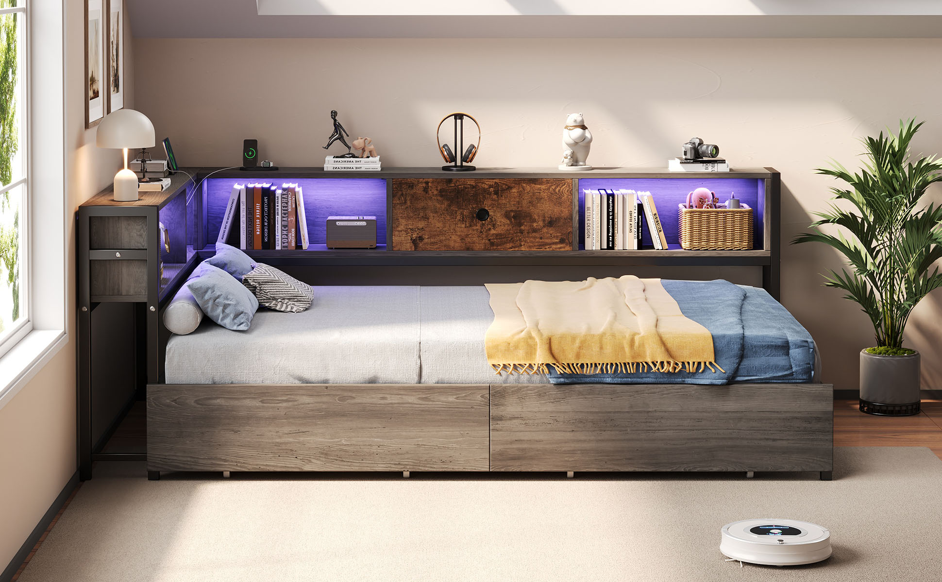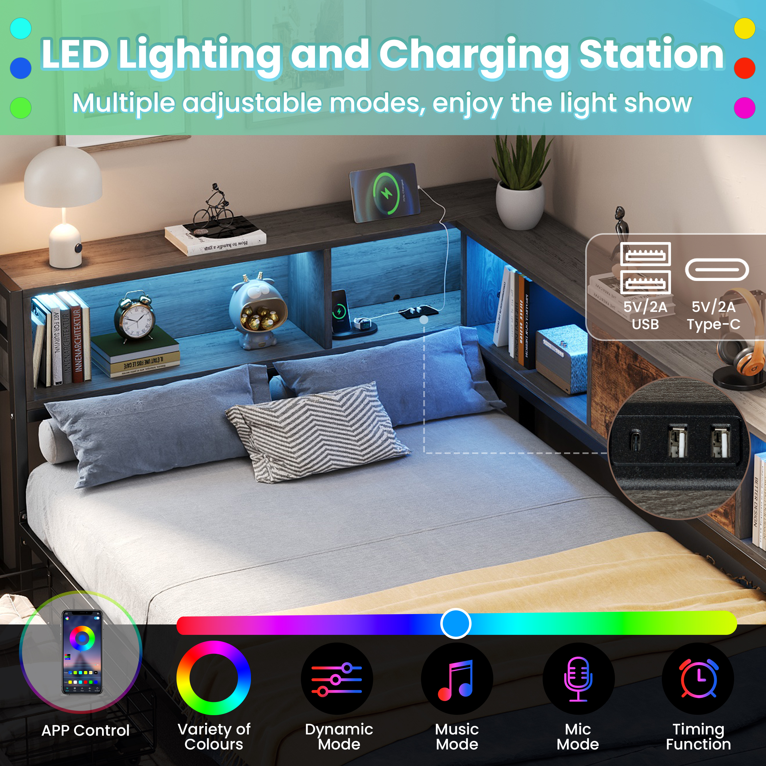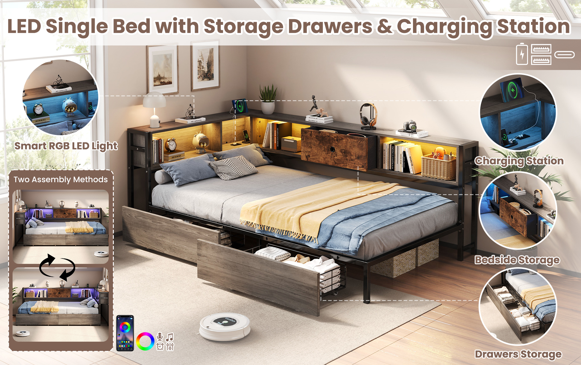 Upgrade your home with this multifunctional 3ft Single LED Bed, which seamlessly blends practical functionality with a Rustic Brown wood aesthetic. Designed specifically for contemporary homes, it features a comprehensive storage headboard with a built-in charging station (2 USB & 1 Type-C) and smart RGB lighting controlled by a mobile App. To keep your space organized, it offers extensive storage solutions including two under-bed drawers on smooth wheels, integrated open shelves for books, and a dedicated bedside compartment with a wooden drawer. The solid metal and wood construction provides a stable foundation for your mattress, while the reversible assembly ensures a perfect fit for any room layout. Special Features - Two assembly methods - Large storage space - Smart RGB LED lights - Integrated charging station - Rustic brown wood style - Sturdy metal and wood support