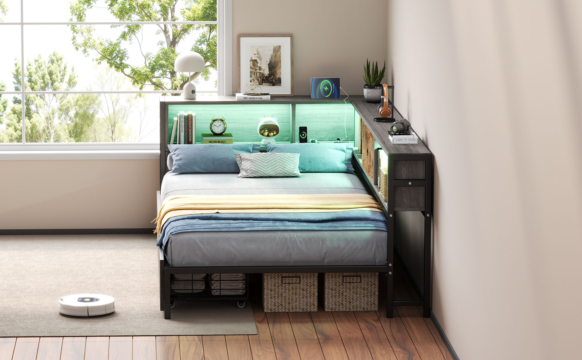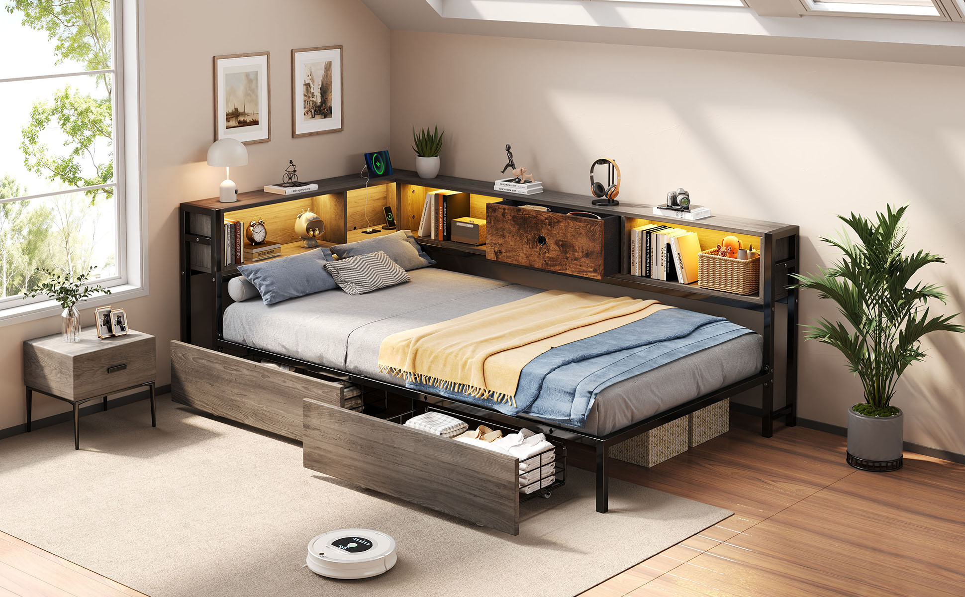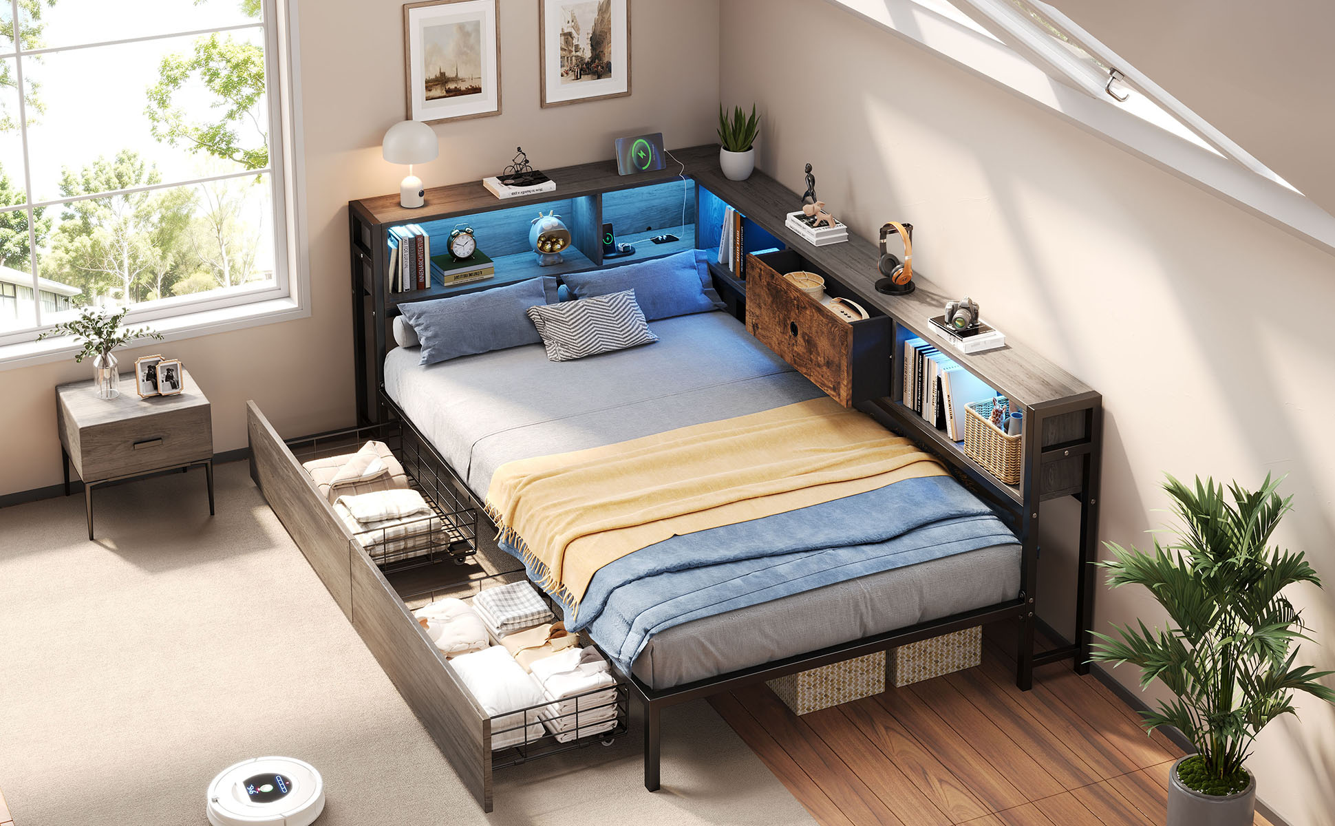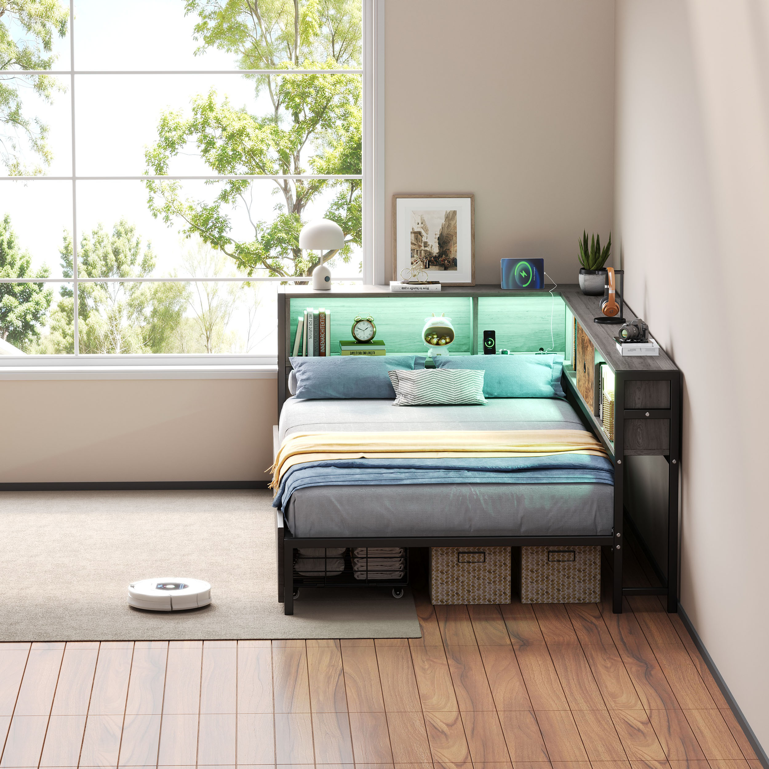 Upgrade your home with this multifunctional 3ft Single LED Bed, which seamlessly blends practical functionality with a Rustic Brown wood aesthetic. Designed specifically for contemporary homes, it features a comprehensive storage headboard with a built-in charging station (2 USB & 1 Type-C) and smart RGB lighting controlled by a mobile App. To keep your space organized, it offers extensive storage solutions including two under-bed drawers on smooth wheels, integrated open shelves for books, and a dedicated bedside compartment with a wooden drawer. The solid metal and wood construction provides a stable foundation for your mattress, while the reversible assembly ensures a perfect fit for any room layout. Special Features - Two assembly methods - Large storage space - Smart RGB LED lights - Integrated charging station - Rustic brown wood style - Sturdy metal and wood support