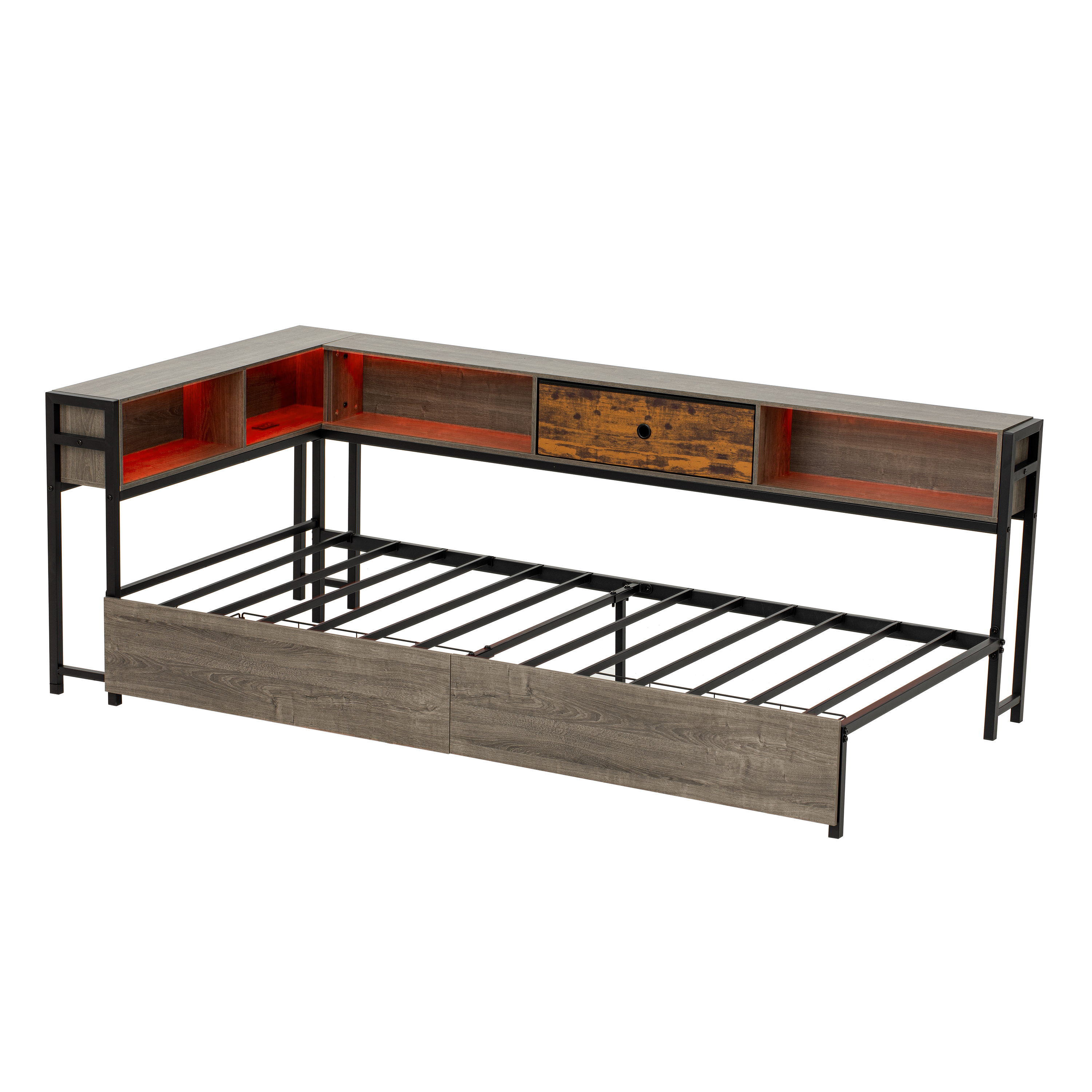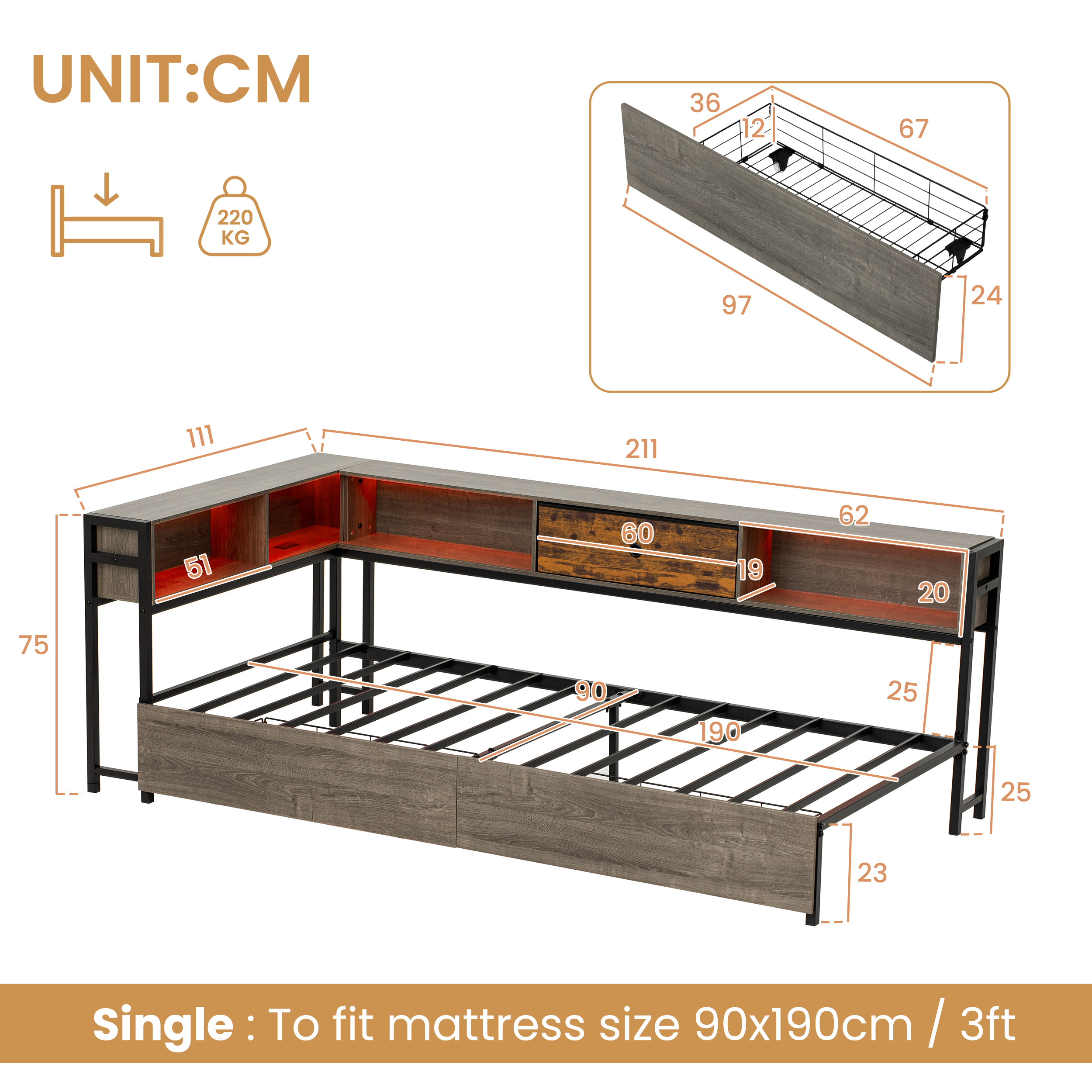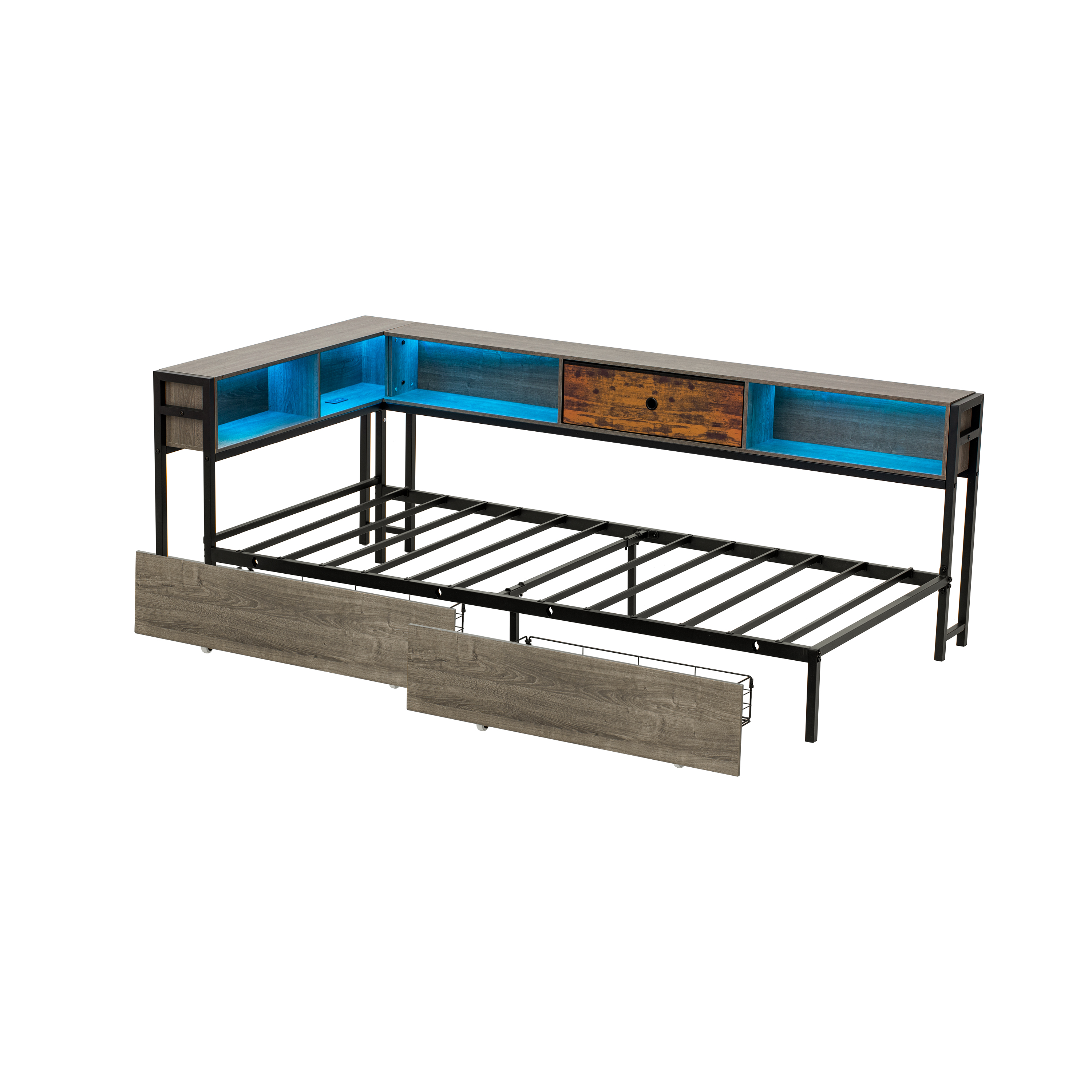 Product Name:3ft Single Metal and Wood Bed with RGB LED Lights & Charging Station (USB & Type-C), Built-in Shelves and Bedside Storage, Two Storage Drawers, Two Assembly Methods, Grey, Rustic Brown (No Mattress)