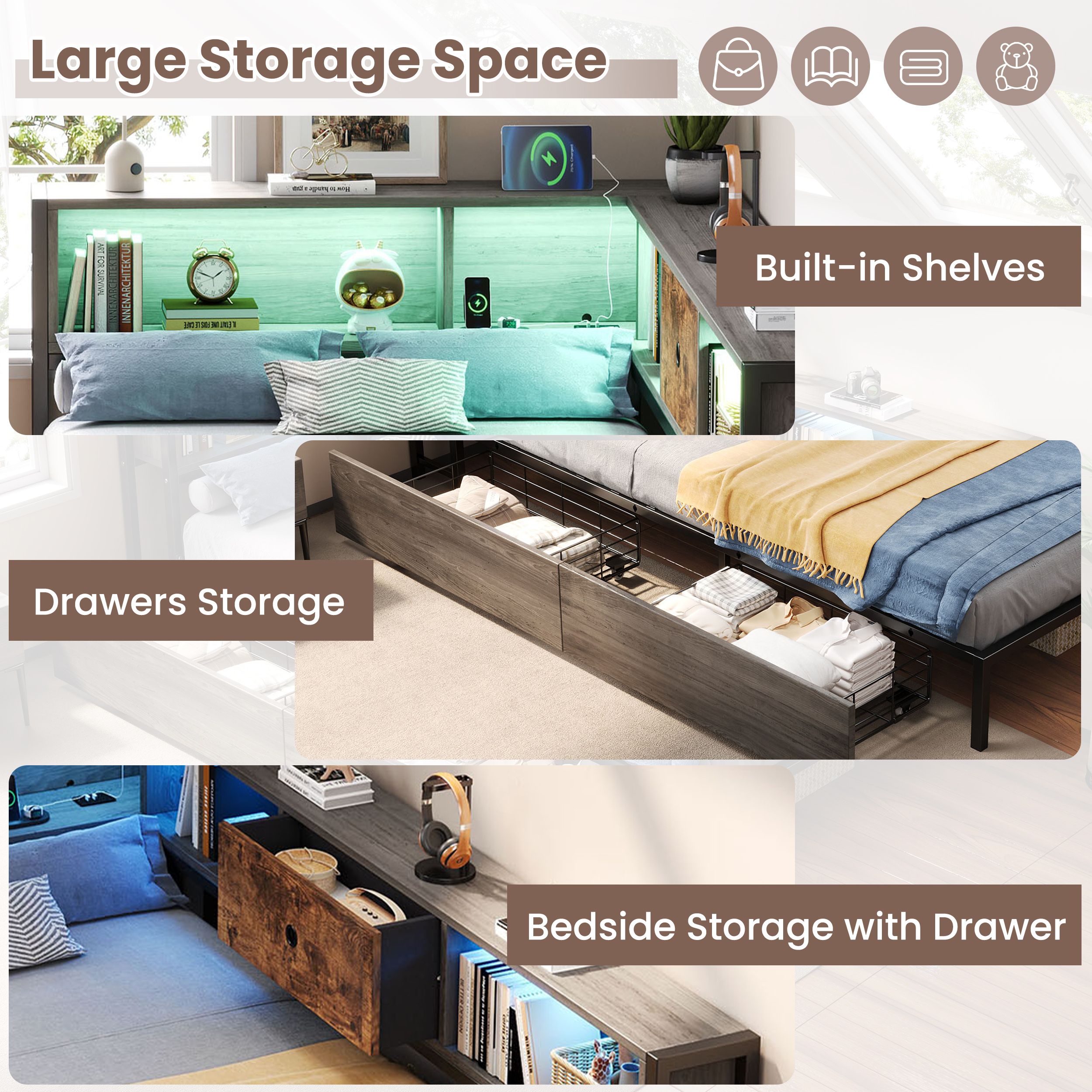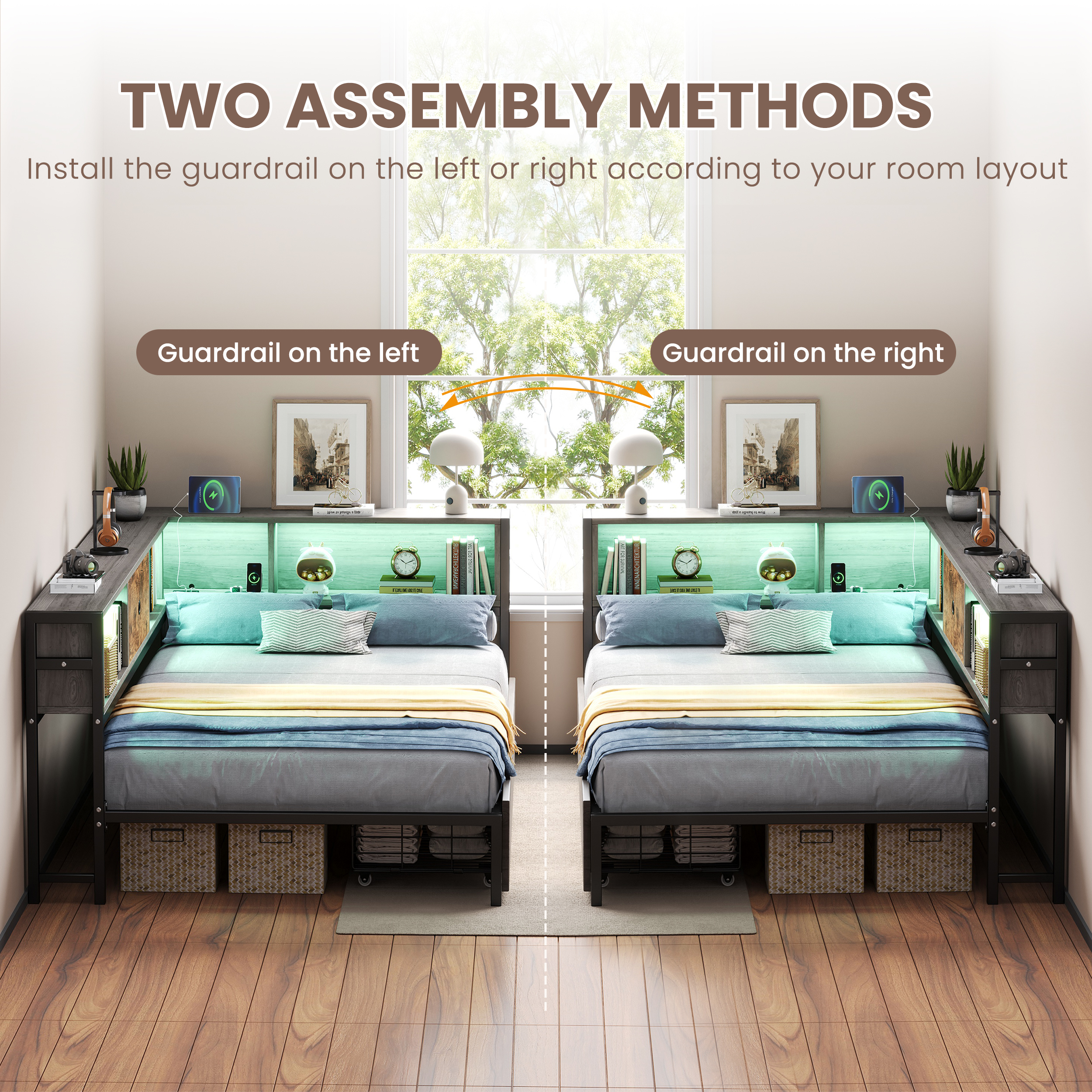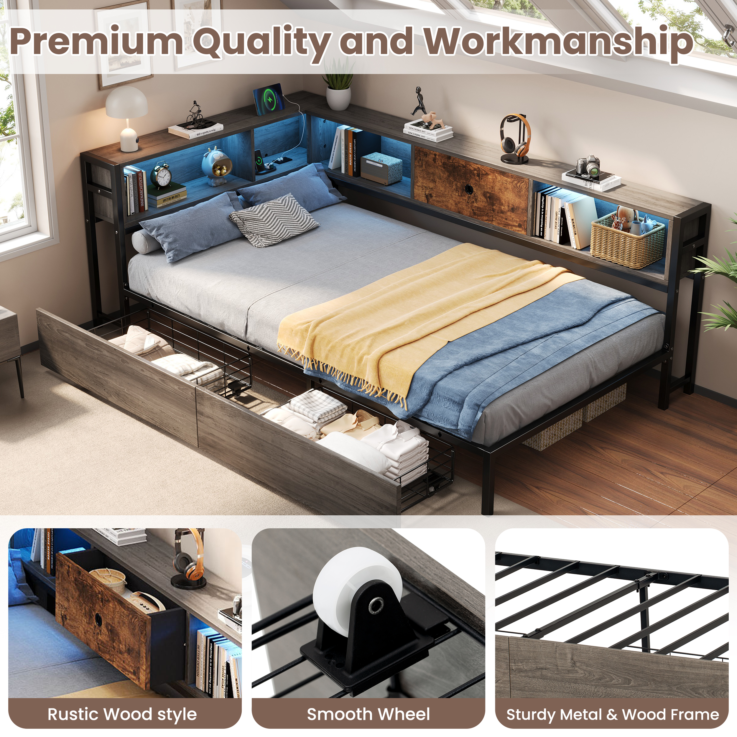 Product Name:3ft Single Metal and Wood Bed with RGB LED Lights & Charging Station (USB & Type-C), Built-in Shelves and Bedside Storage, Two Storage Drawers, Two Assembly Methods, Grey, Rustic Brown (No Mattress)