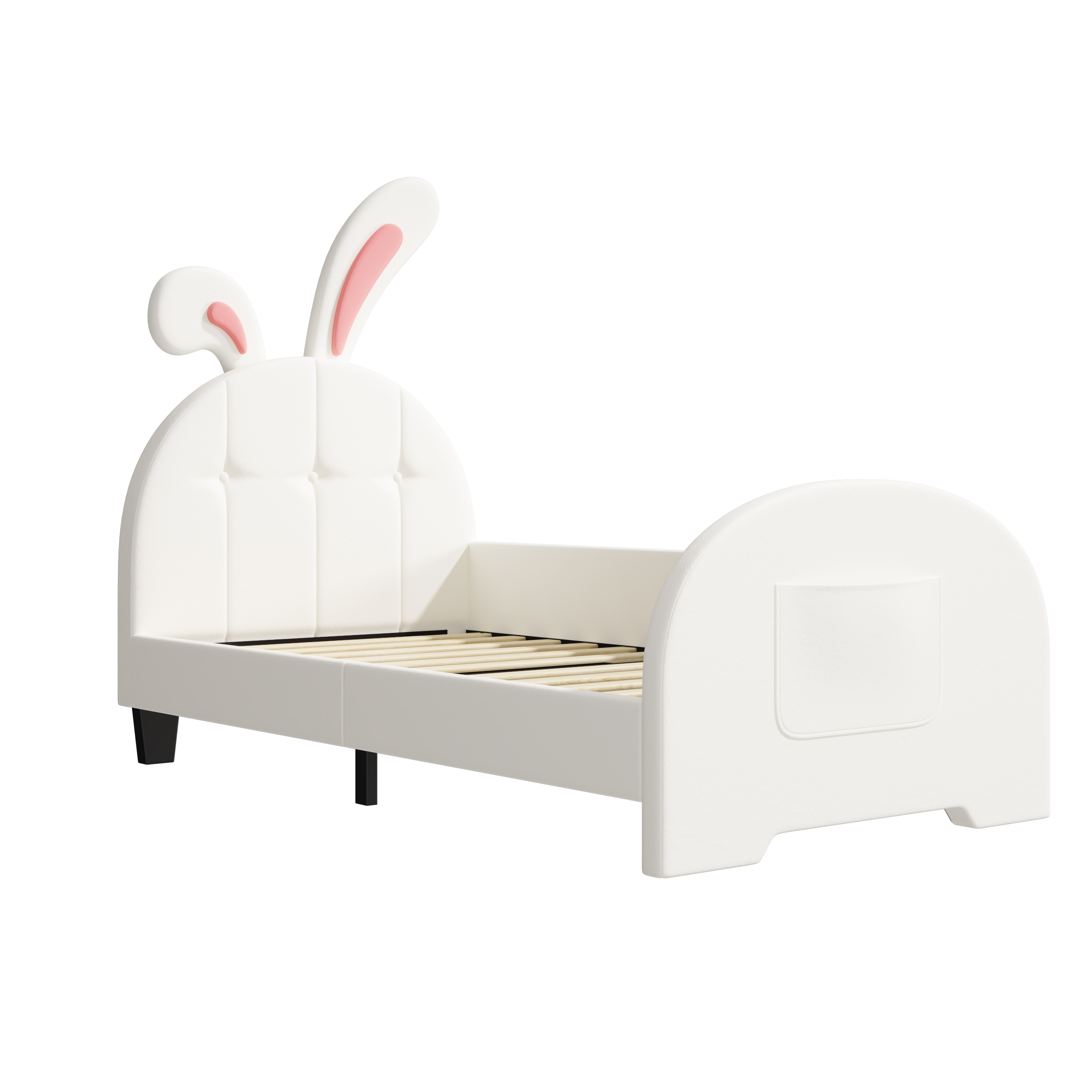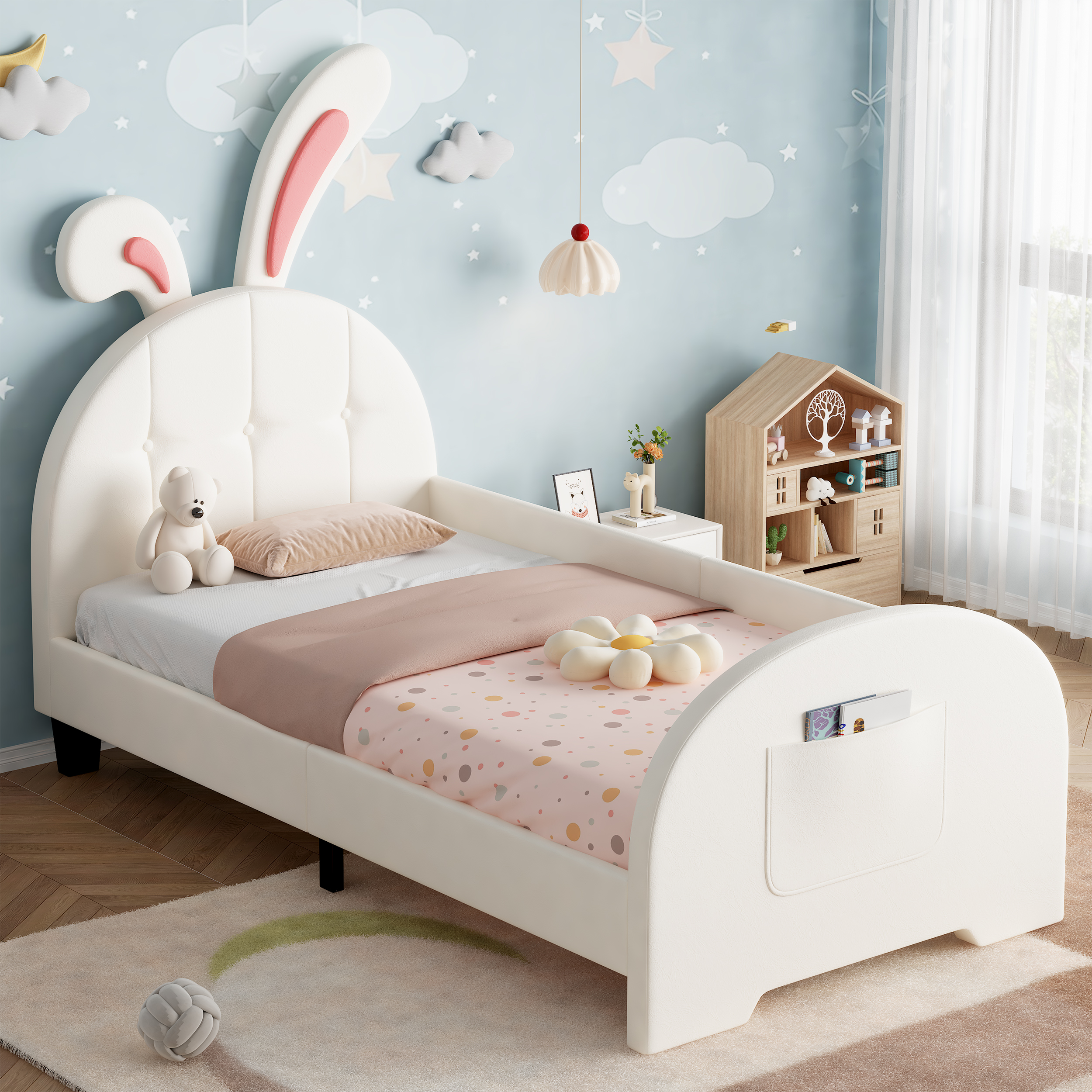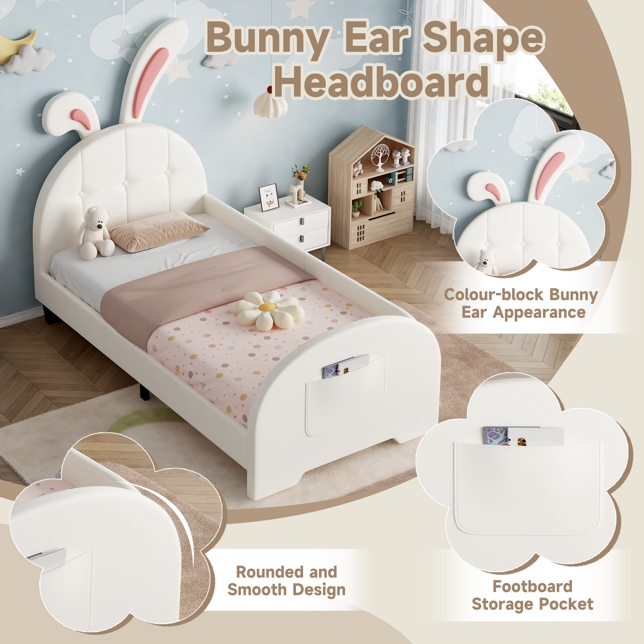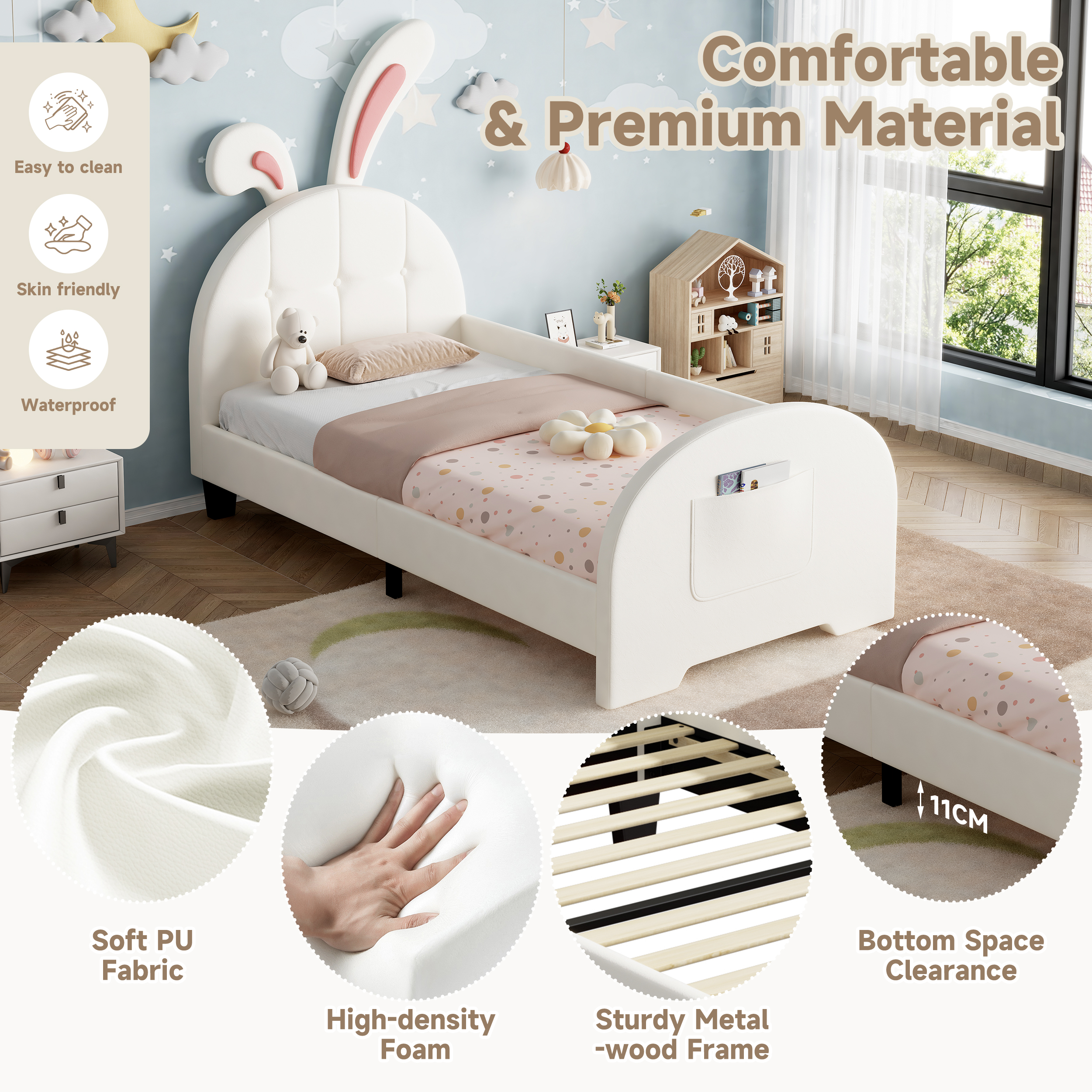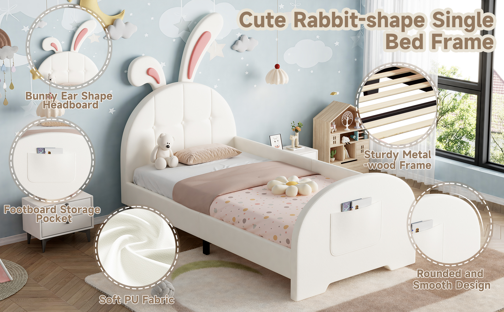 Product Name:3ft Single Rabbit-Shaped Upholstered Bed Frame, Bunny Ear Headboard & Footboard Storage Pocket, Soft PU Leather Single Bed with Sturdy Metal-Wood Frame, Cream White (No Mattress)