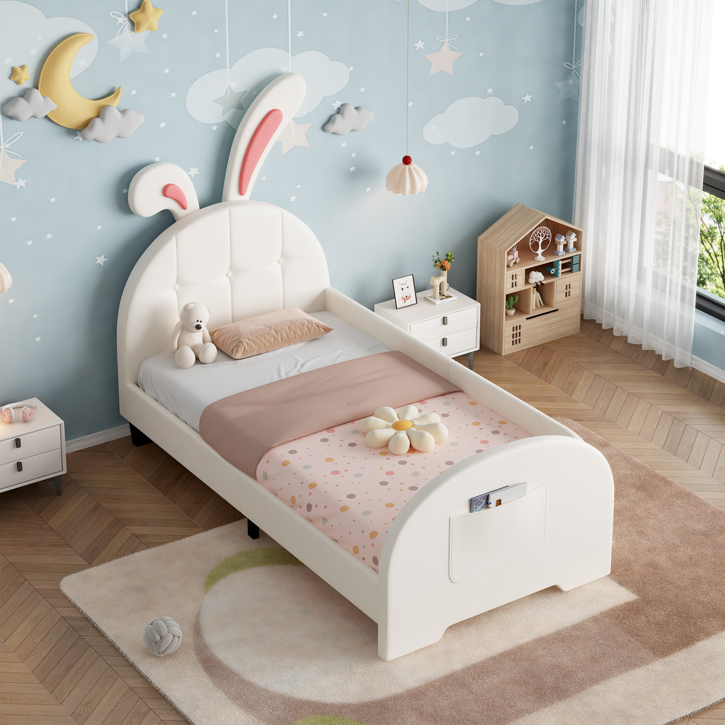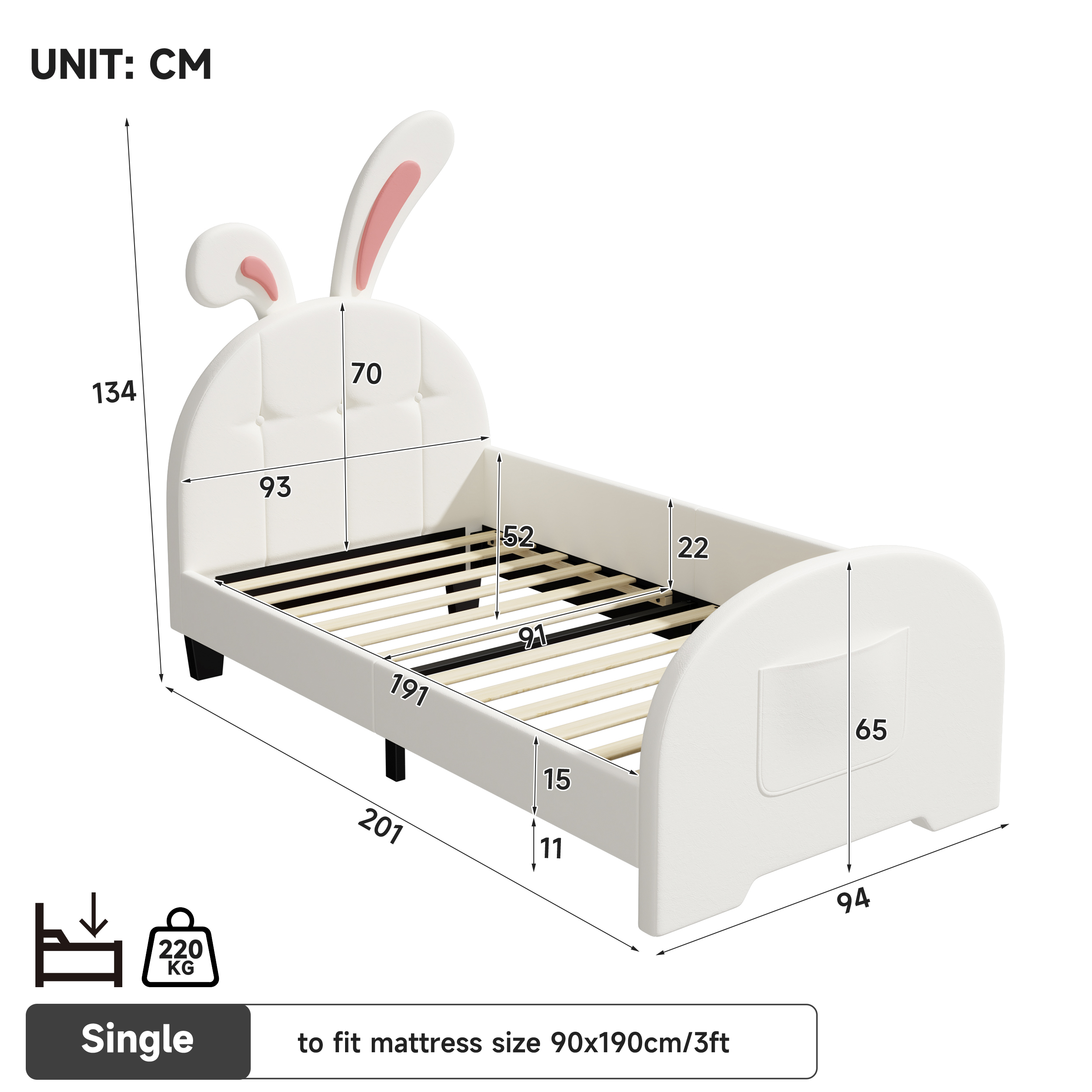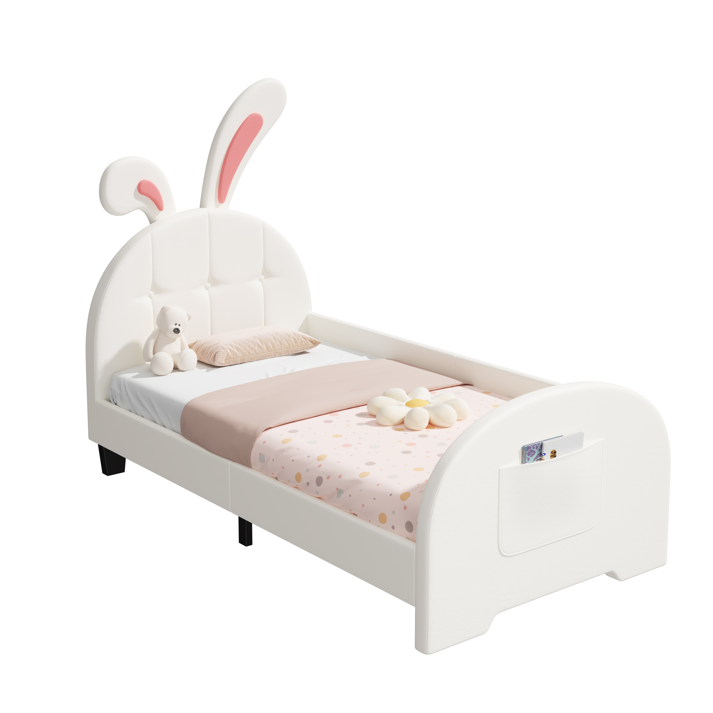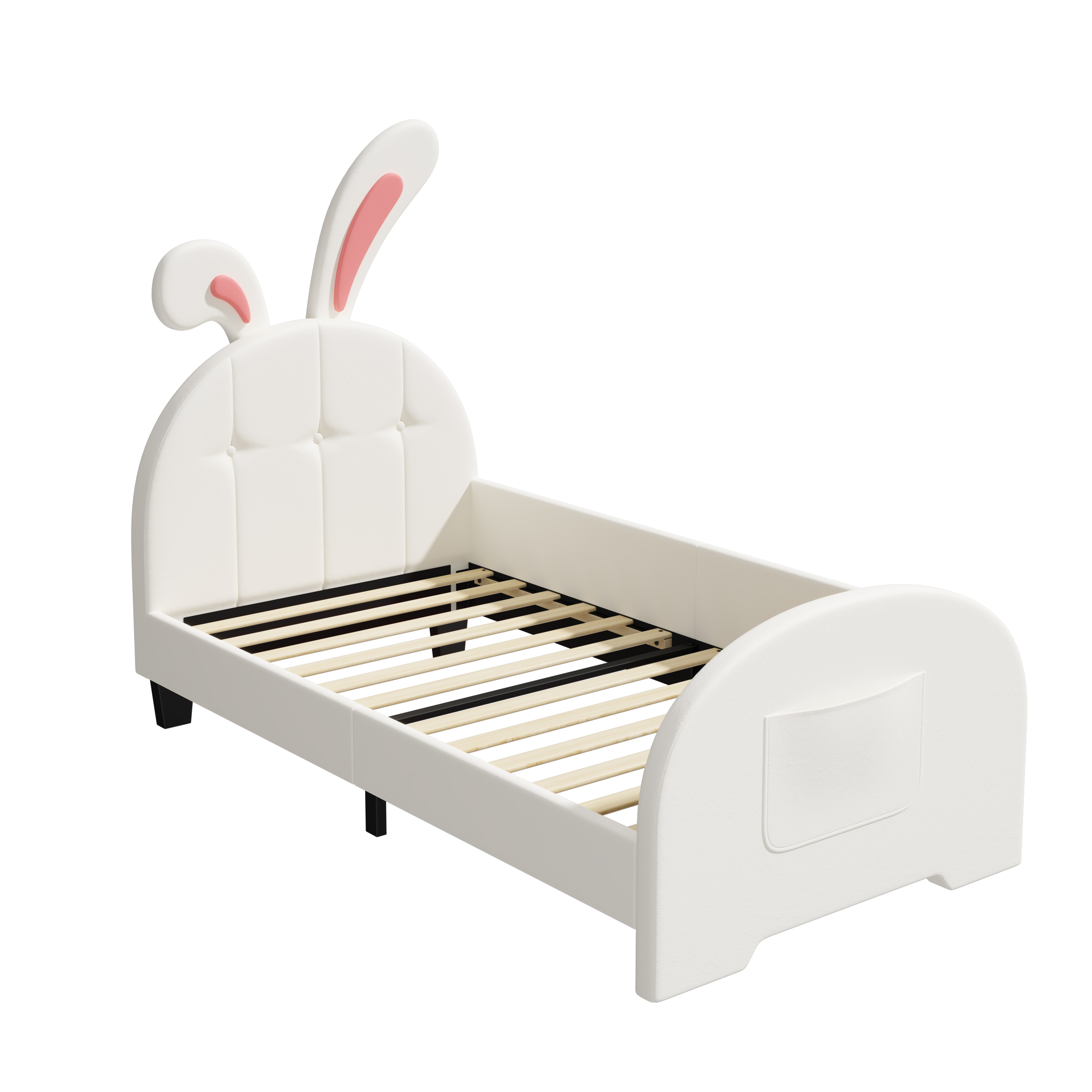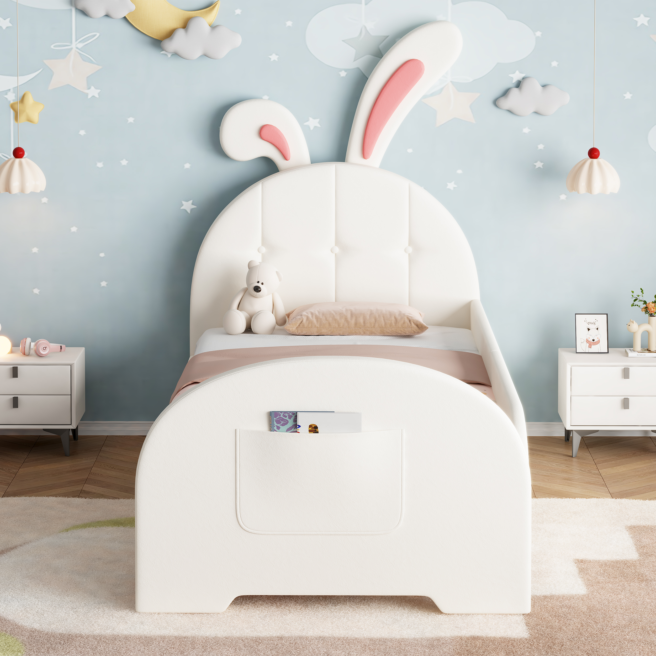 Product Name:3ft Single Rabbit-Shaped Upholstered Bed Frame, Bunny Ear Headboard & Footboard Storage Pocket, Soft PU Leather Single Bed with Sturdy Metal-Wood Frame, Cream White (No Mattress)
