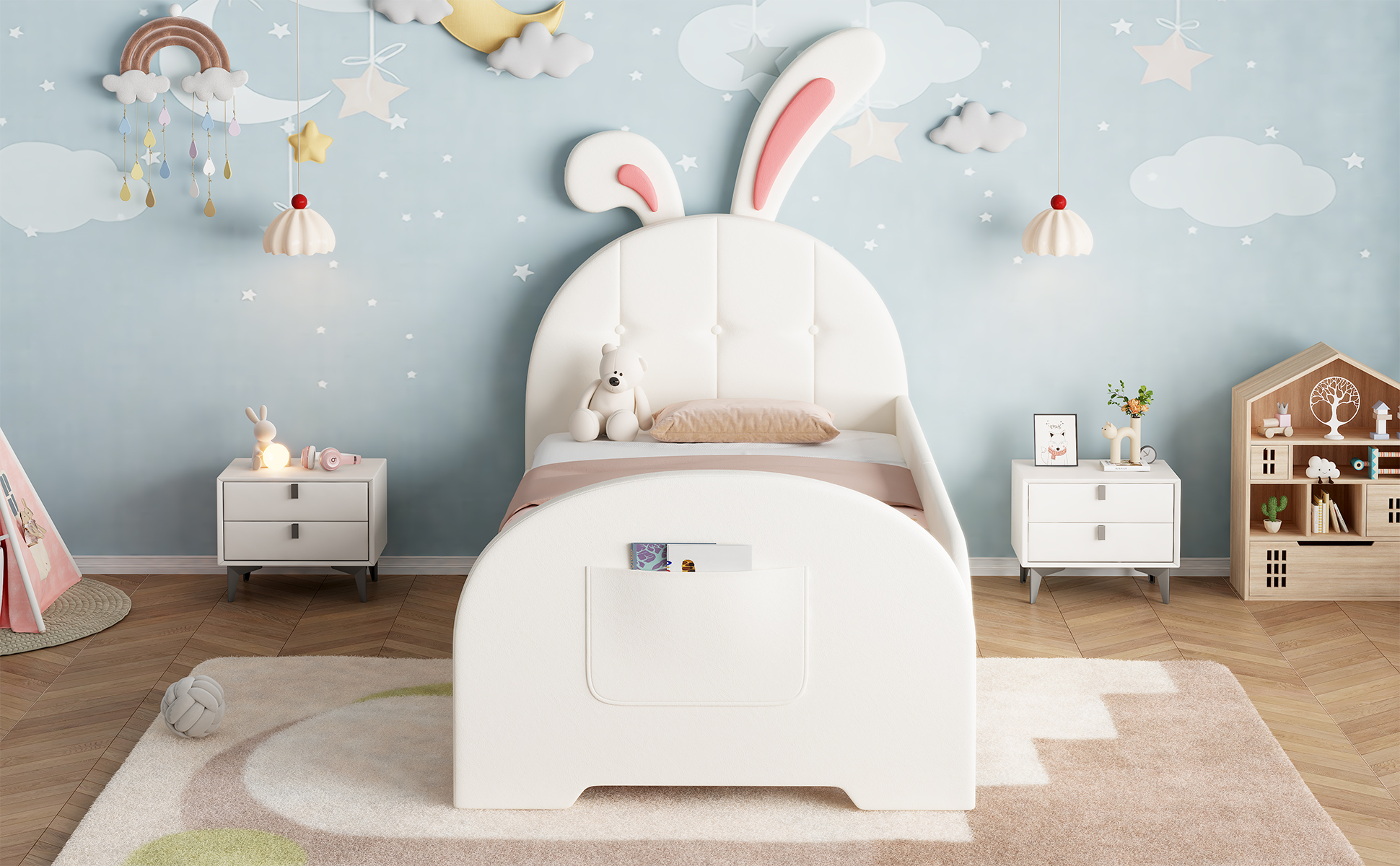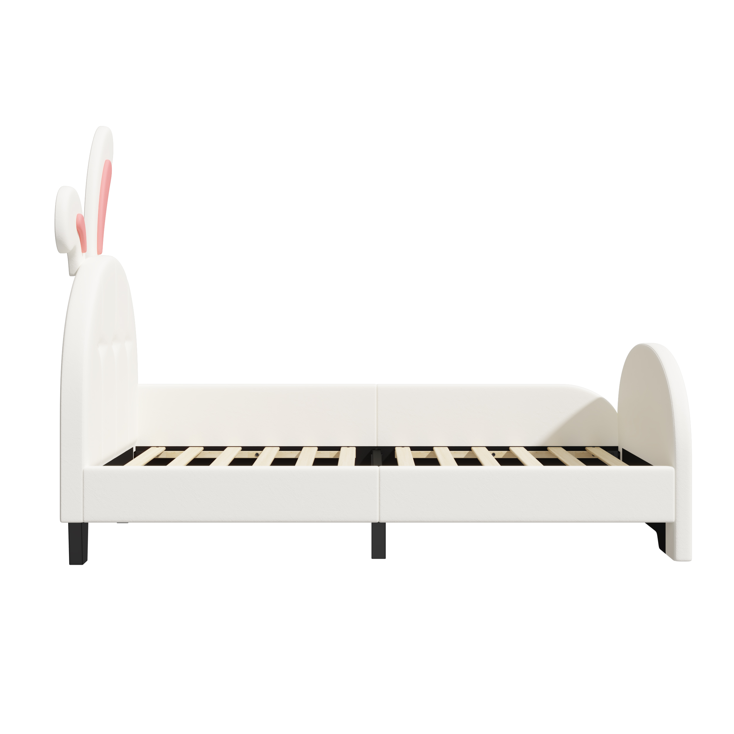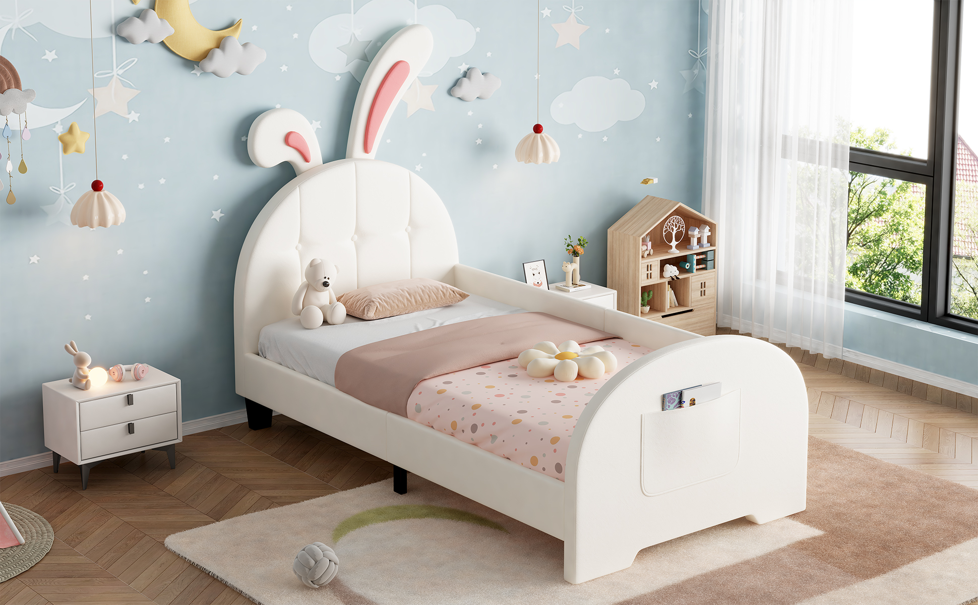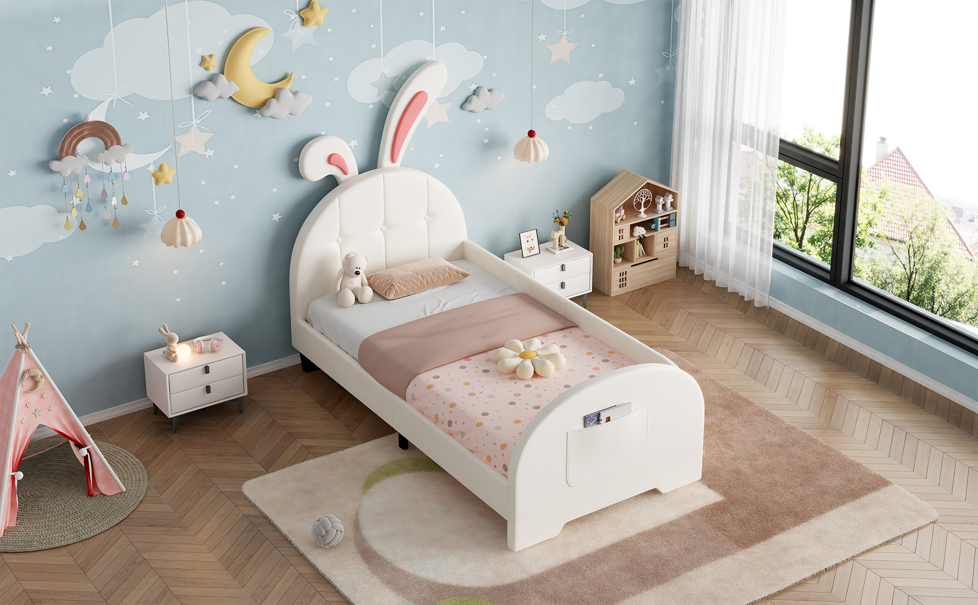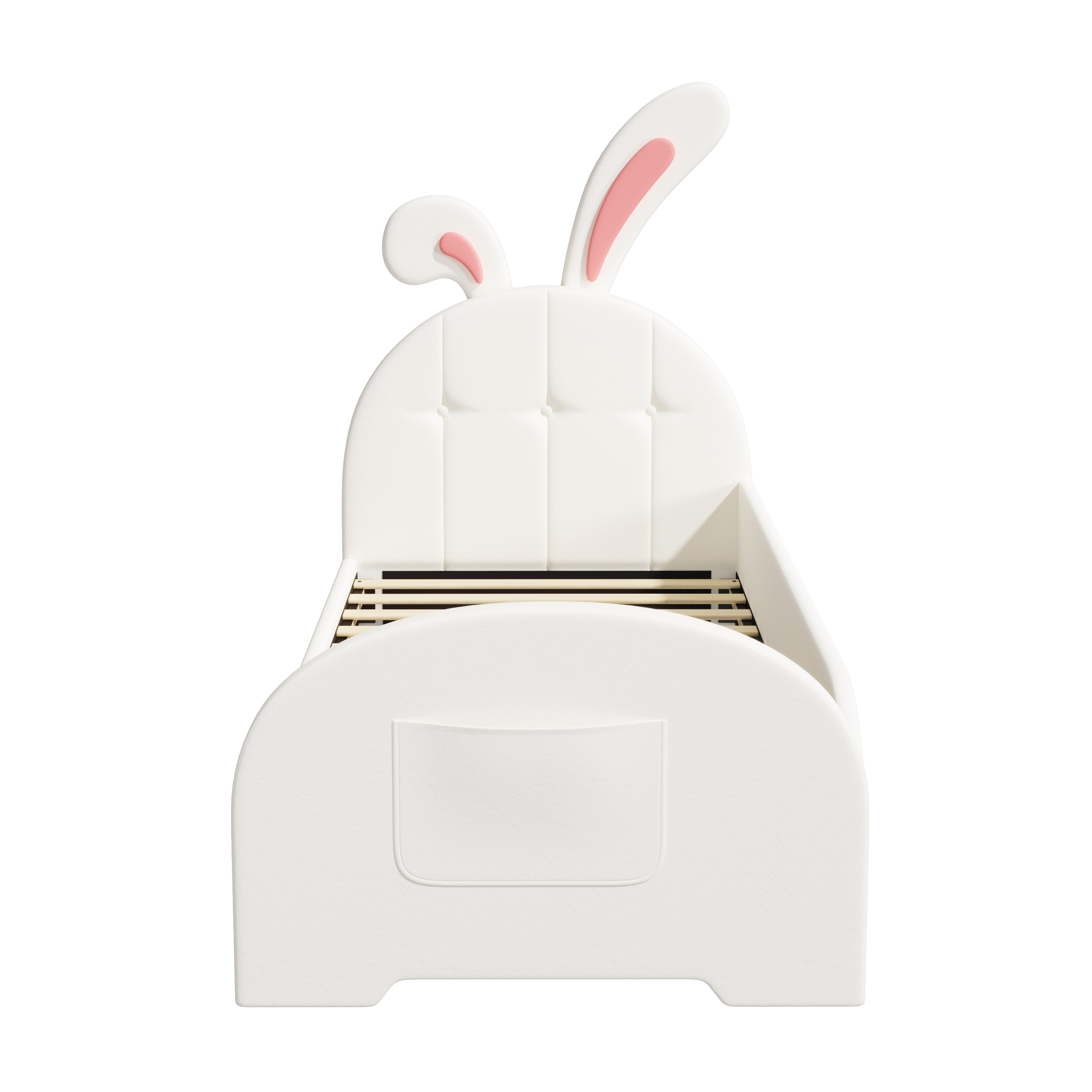 Product Name:3ft Single Rabbit-Shaped Upholstered Bed Frame, Bunny Ear Headboard & Footboard Storage Pocket, Soft PU Leather Single Bed with Sturdy Metal-Wood Frame, Cream White (No Mattress)